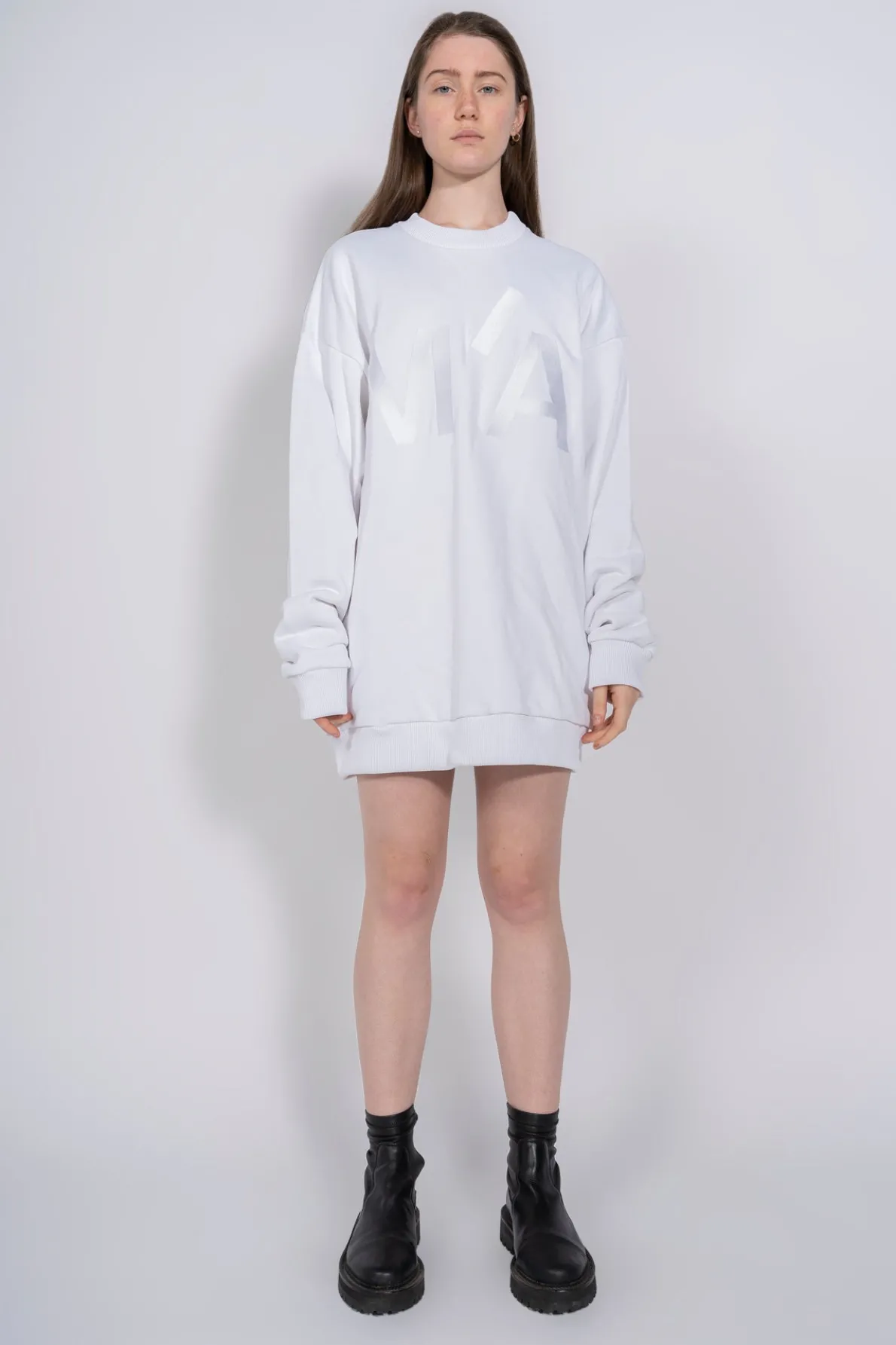 A relaxed, comfy oversized white long sleeve fleece sweatshirt boasting the classic M'A embroidered logo atop a ribbed neckline. Timeless style and effortless comfort!• White• Embroidered M'A logo • Long sleeves• Ribbed neckline