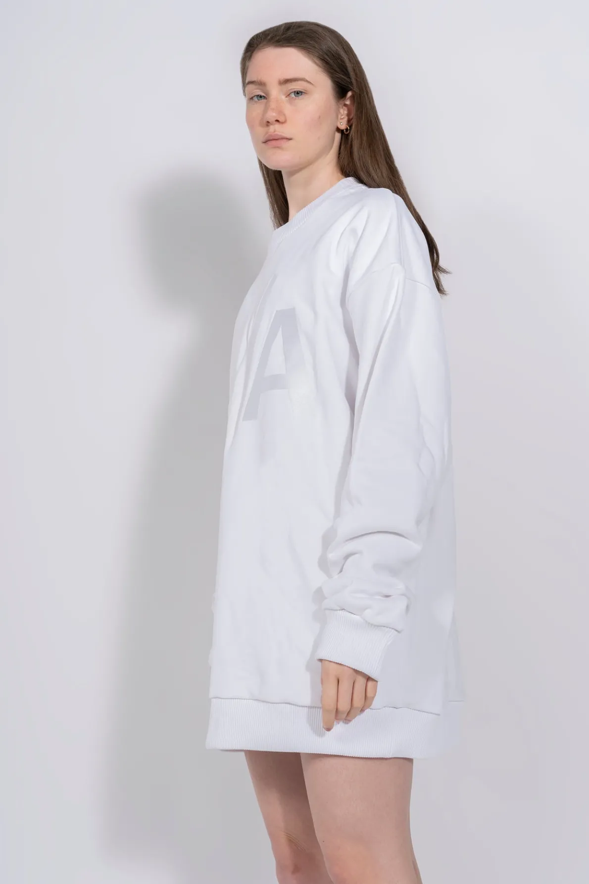 Description: A relaxed, comfy oversized white long sleeve fleece sweatshirt boasting the classic M'A embroidered logo atop a ribbed neckline. Timeless style and effortless comfort! Fabric: 55% COTTON, 45% POLYAMIDE size and fit: Oversized Yana is 5ft7 / 1.70 cm and is wearing a size Small (UK8)