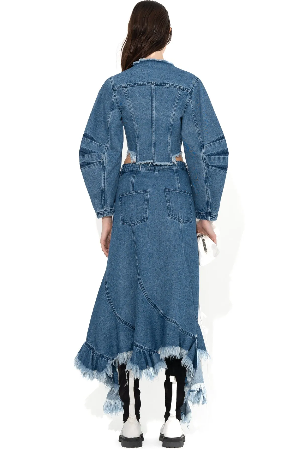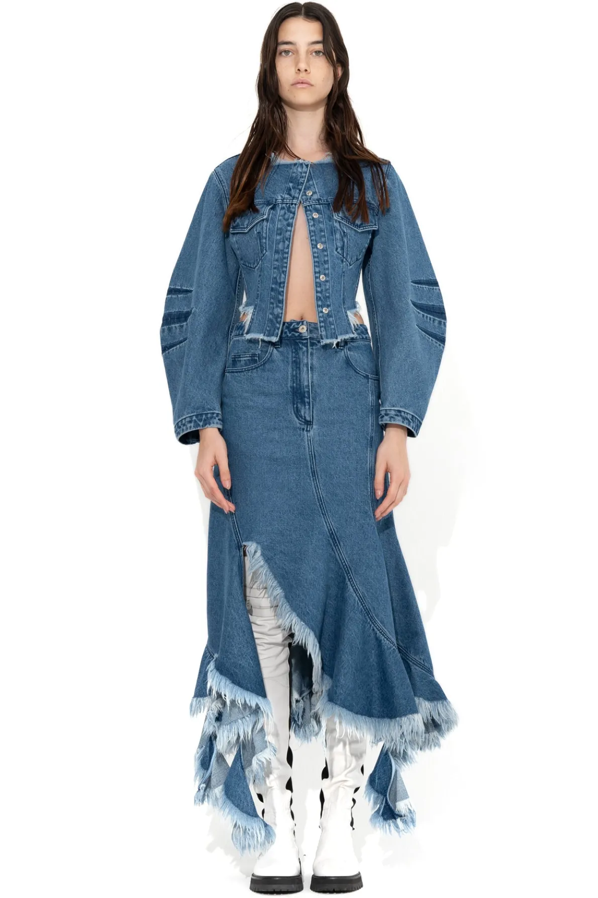 Description: Cropped coat in mid-blue denim that features round shape sleeves, front snap buttons, raw hem and round neckline. This mid-blue denim jacket captivates with its cropped fit, round shape sleeves, front snap buttons, raw hem, and round neckline – a timeless must-have! RST24 Collection is now Pre-Order