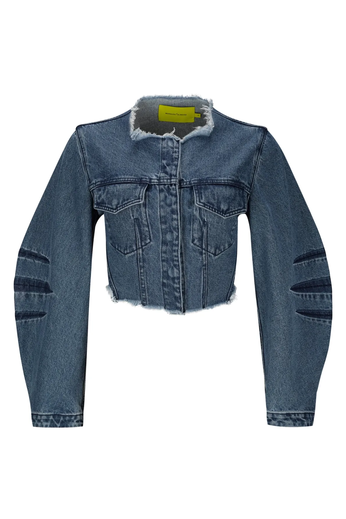 This mid-blue denim jacket captivates with its cropped fit, round shape sleeves, front snap buttons, raw hem, and round neckline – a timeless must-have!• Cropped• Round sleeves• Front snap buttons• Raw hem
