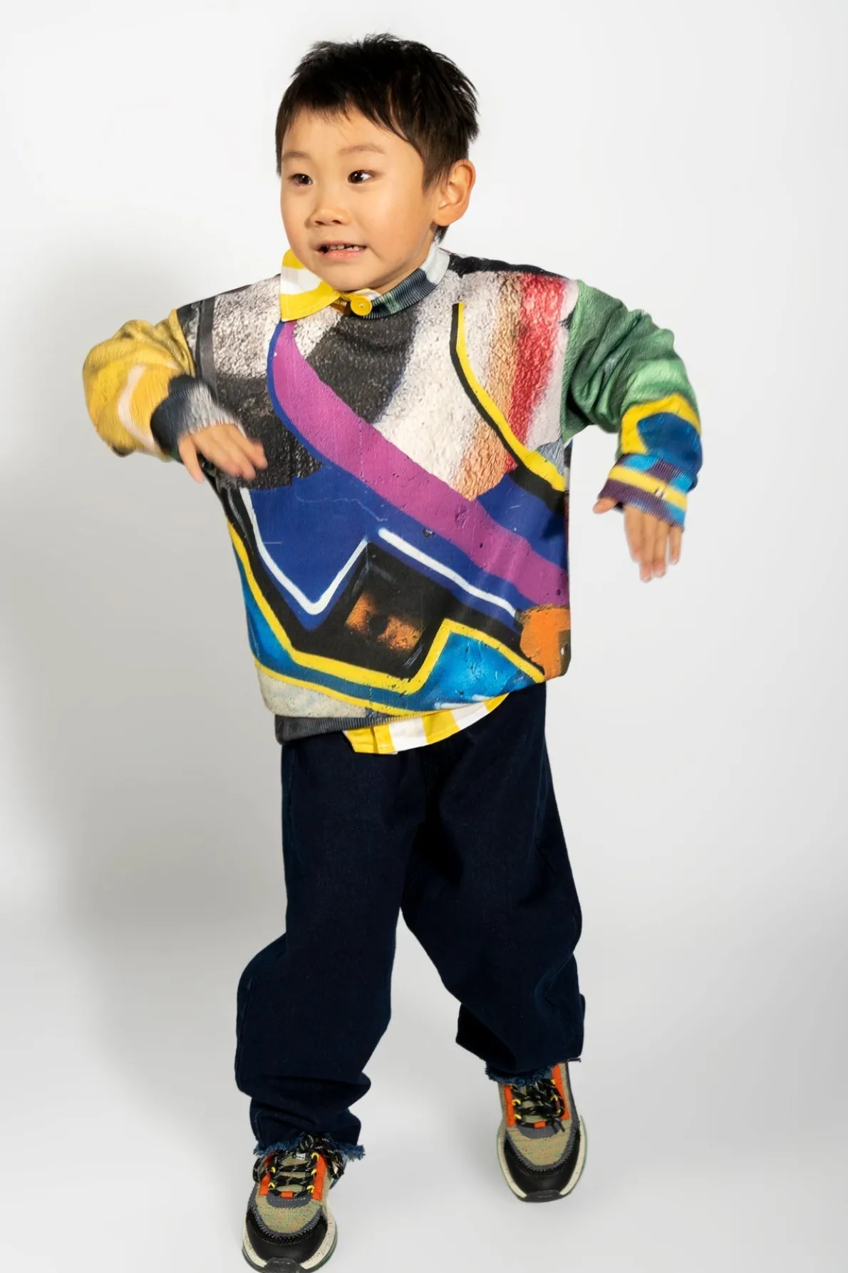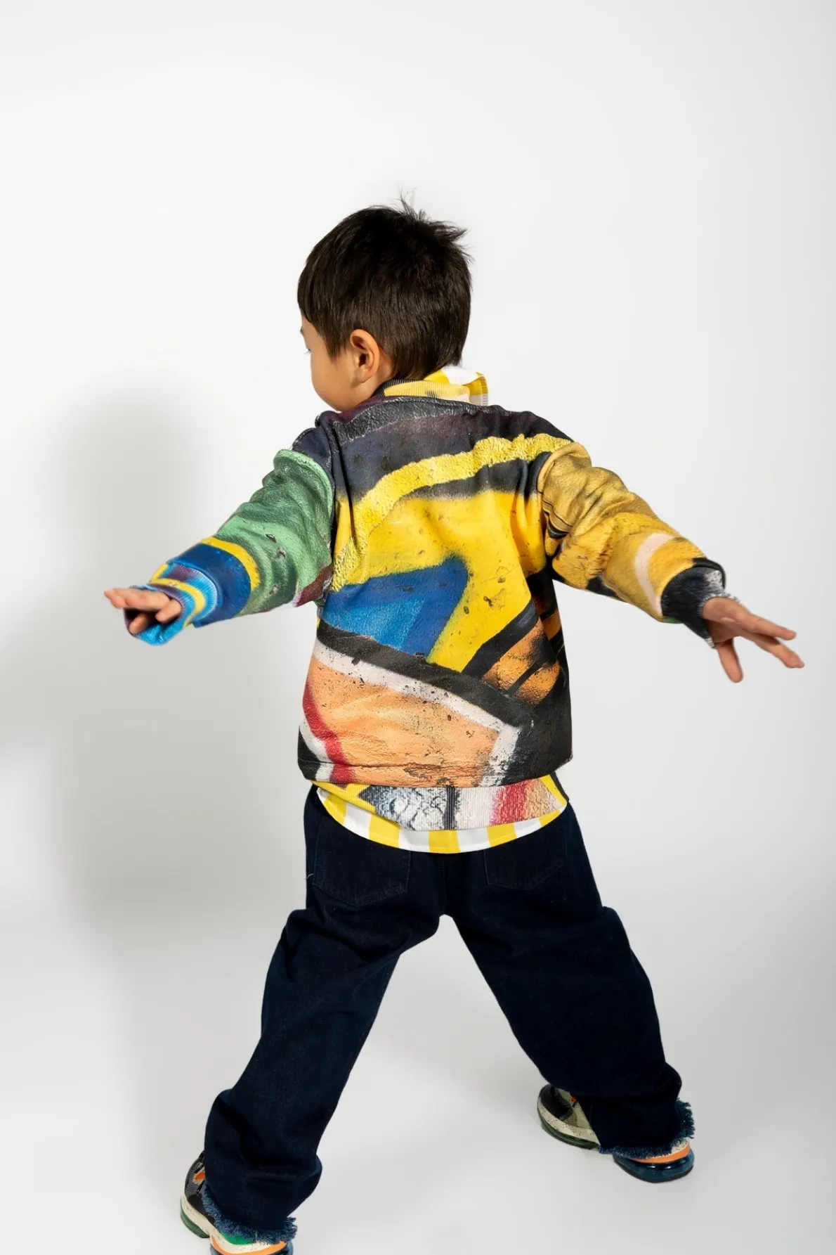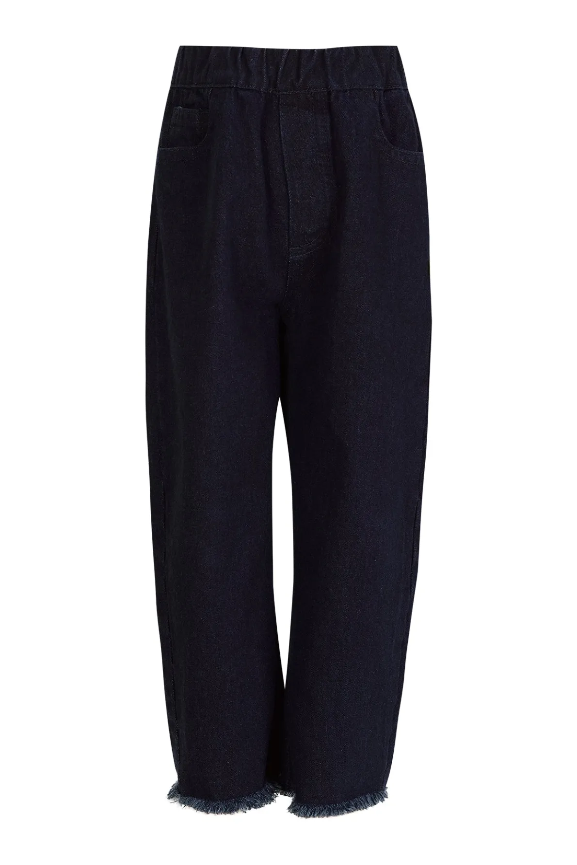 Denim 5 pocket baggy jeans with wide leg, elastic waist and raw hem. Fabric: Denim 85% Cotton, 15% Recycled Cotton size and fit: Product in pictures is size 5 years