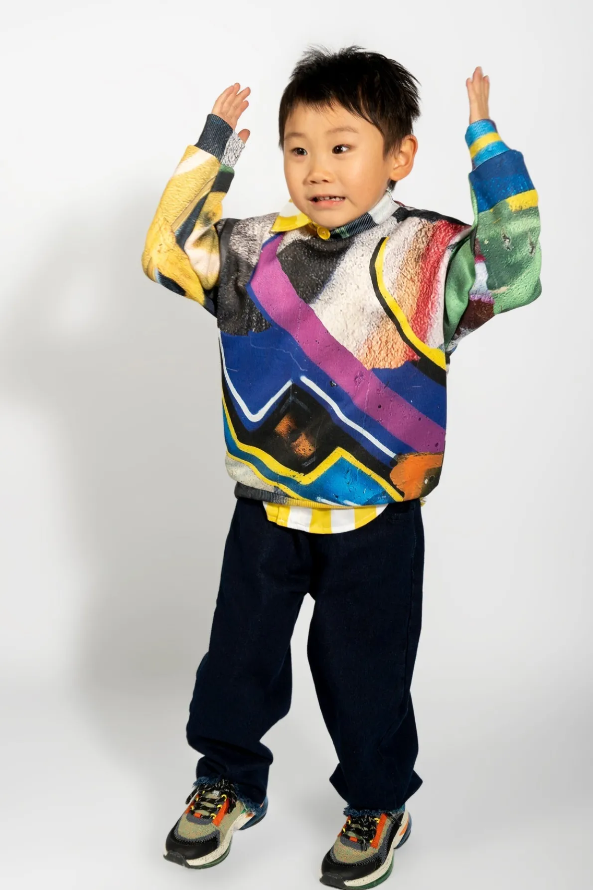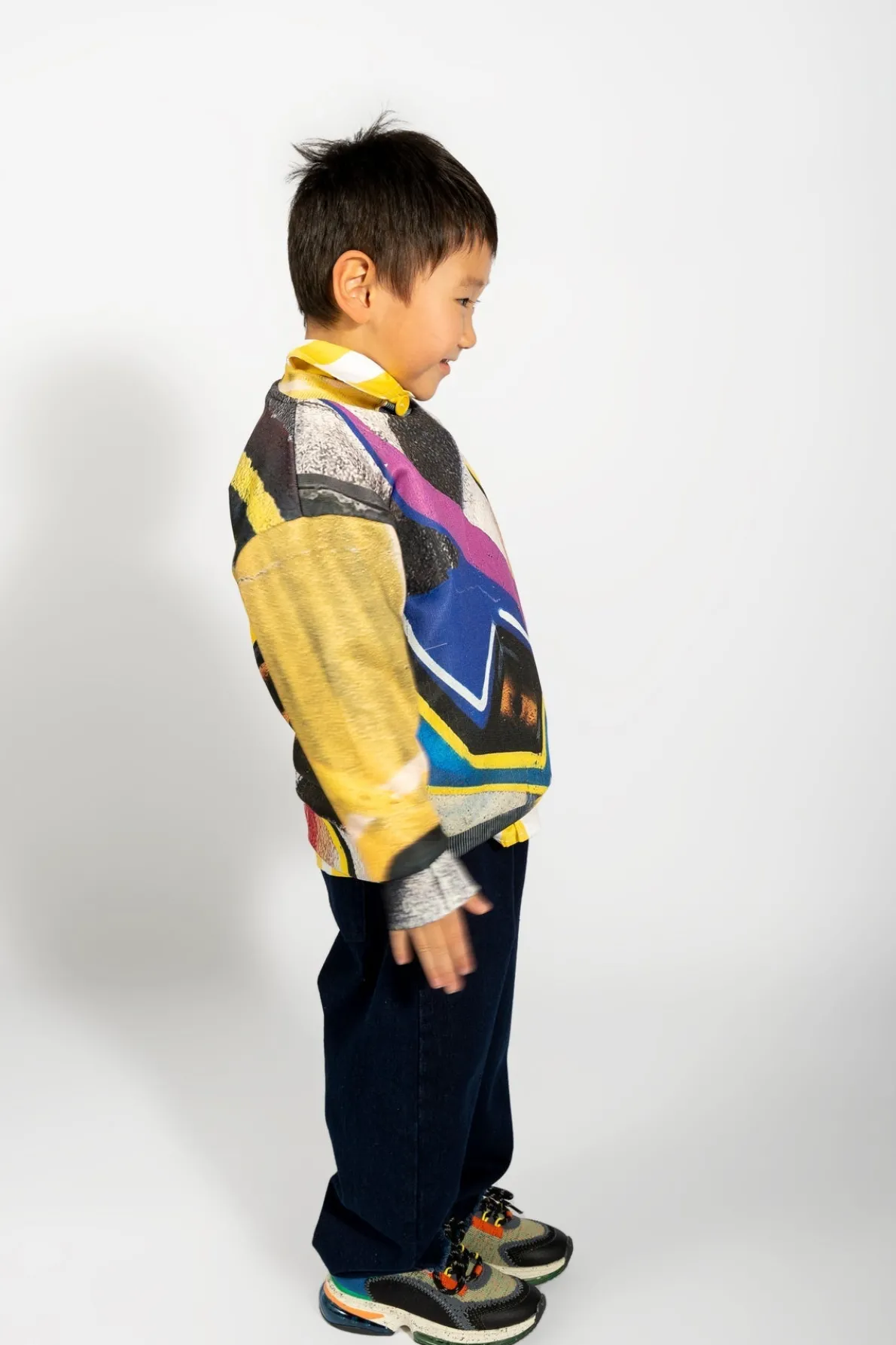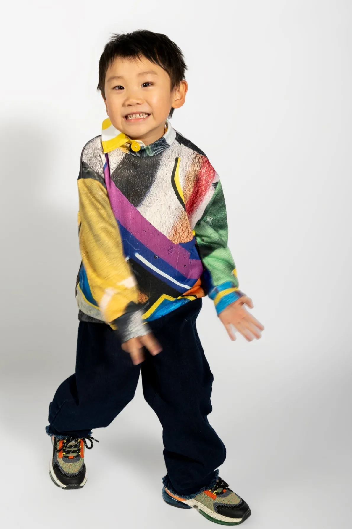 Denim 5 pocket baggy jeans with wide leg, elastic waist and raw hem. Fabric: Denim 85% Cotton, 15% Recycled Cotton size and fit: Product in pictures is size 5 years