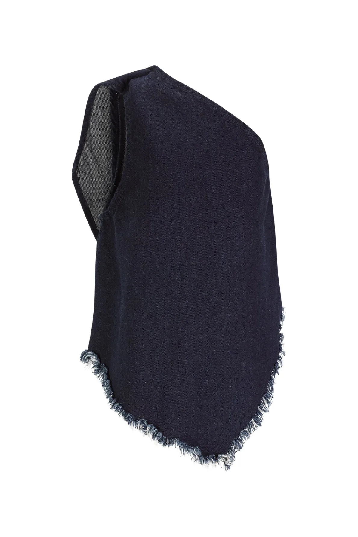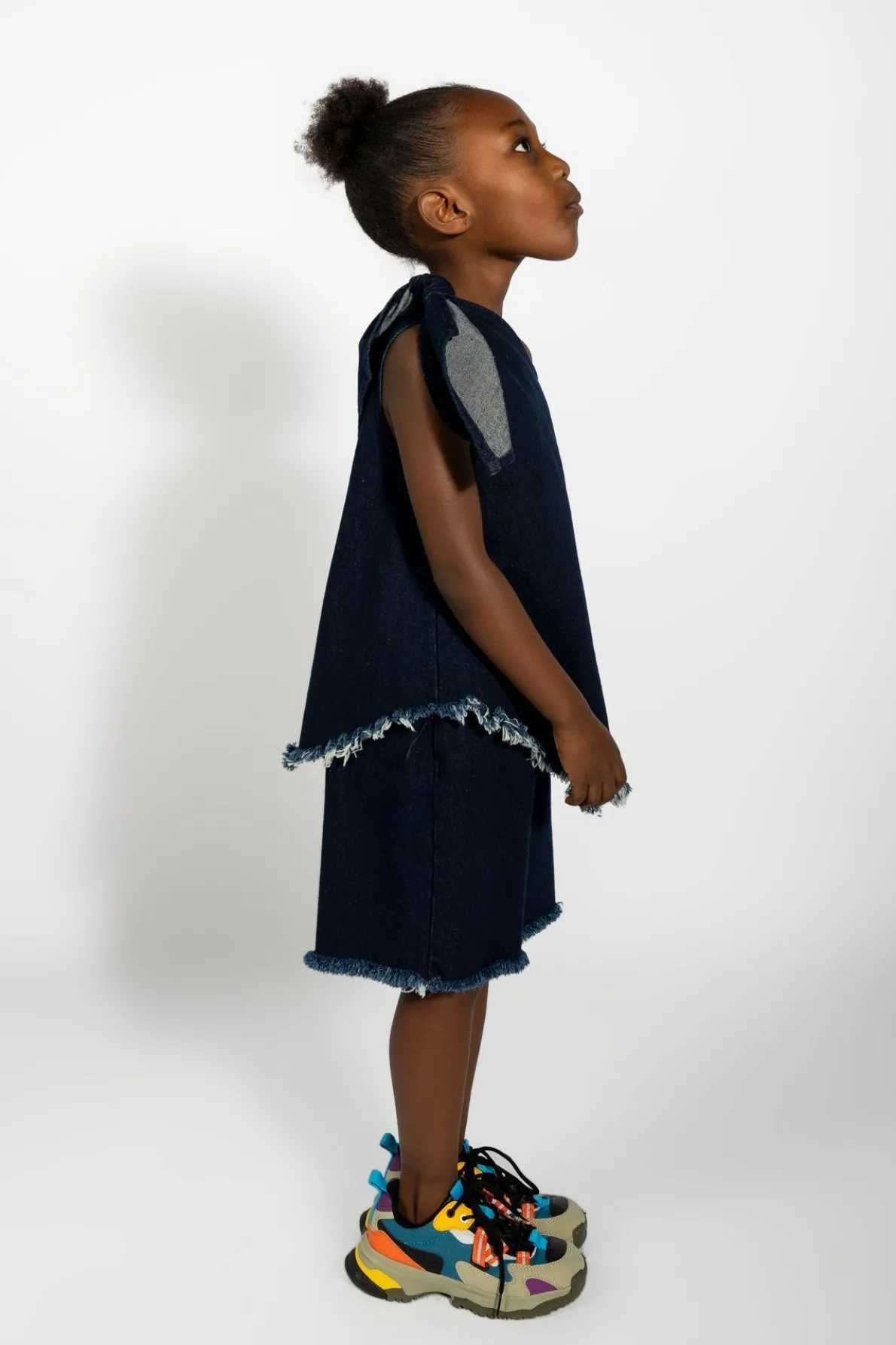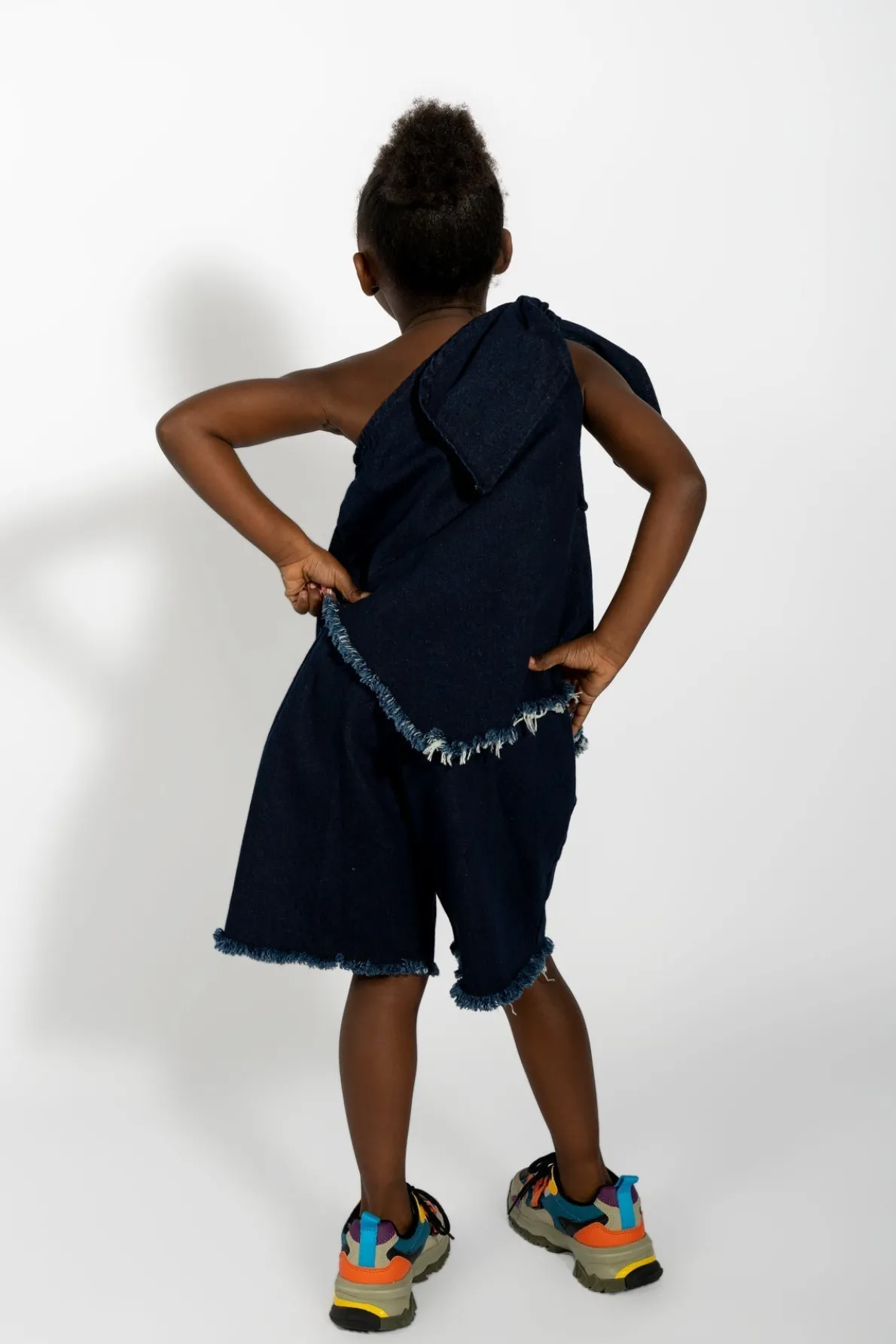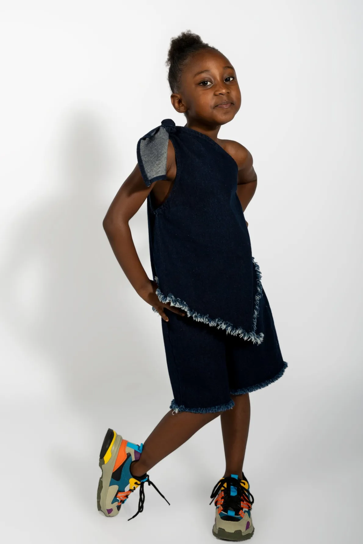One-shoulder kid-sized denim top with an asymmetrical, frayed hem perfect for playing and exploring!• Navy• One shoulder• Knot • Frayed hem
