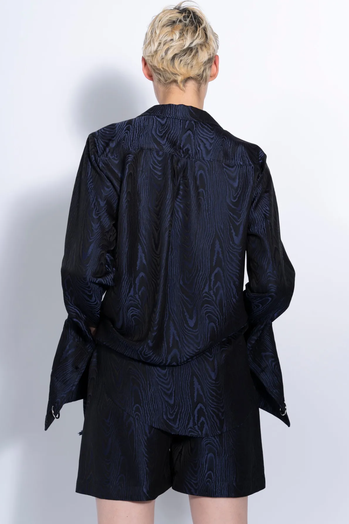These navy moire satin shirt has an oversized fit, long sleeves, cuff ring – a must-have for any fashionista!• Long Sleeves• Oversized• Cuff rings • Brocade