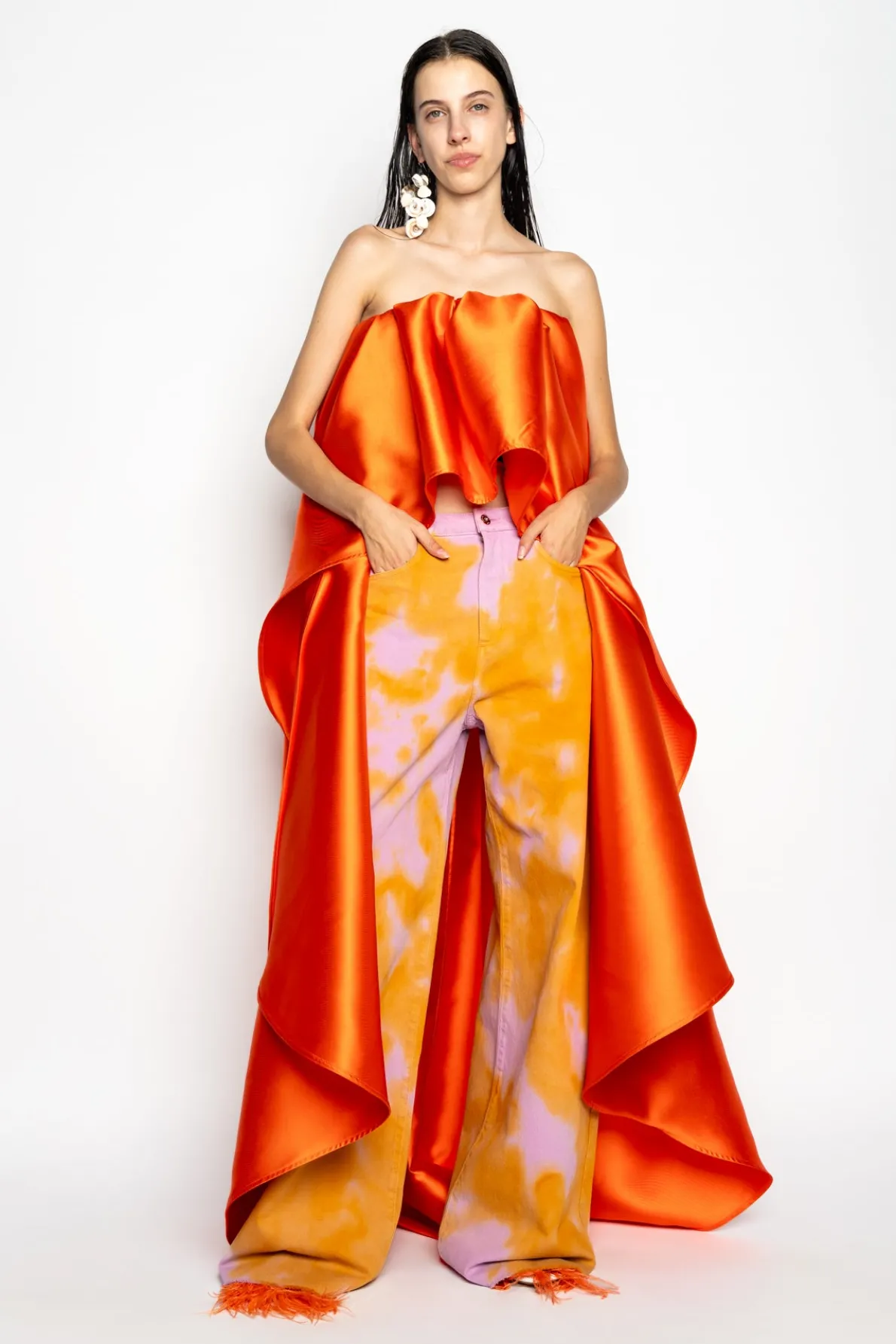 Description: Be bold in these M'A 5-pocket boyfriend jeans in cool orange and pink tie dye drill. These fashionable wide-leg trousers flaunt a comfortable fit with hight waist, as well as a raw hem. Fabric: Drill 50% Cotton, 25% Organic Cotton, 25% Pre-Consumer Recycled Cotton size and fit: Oversized and is w