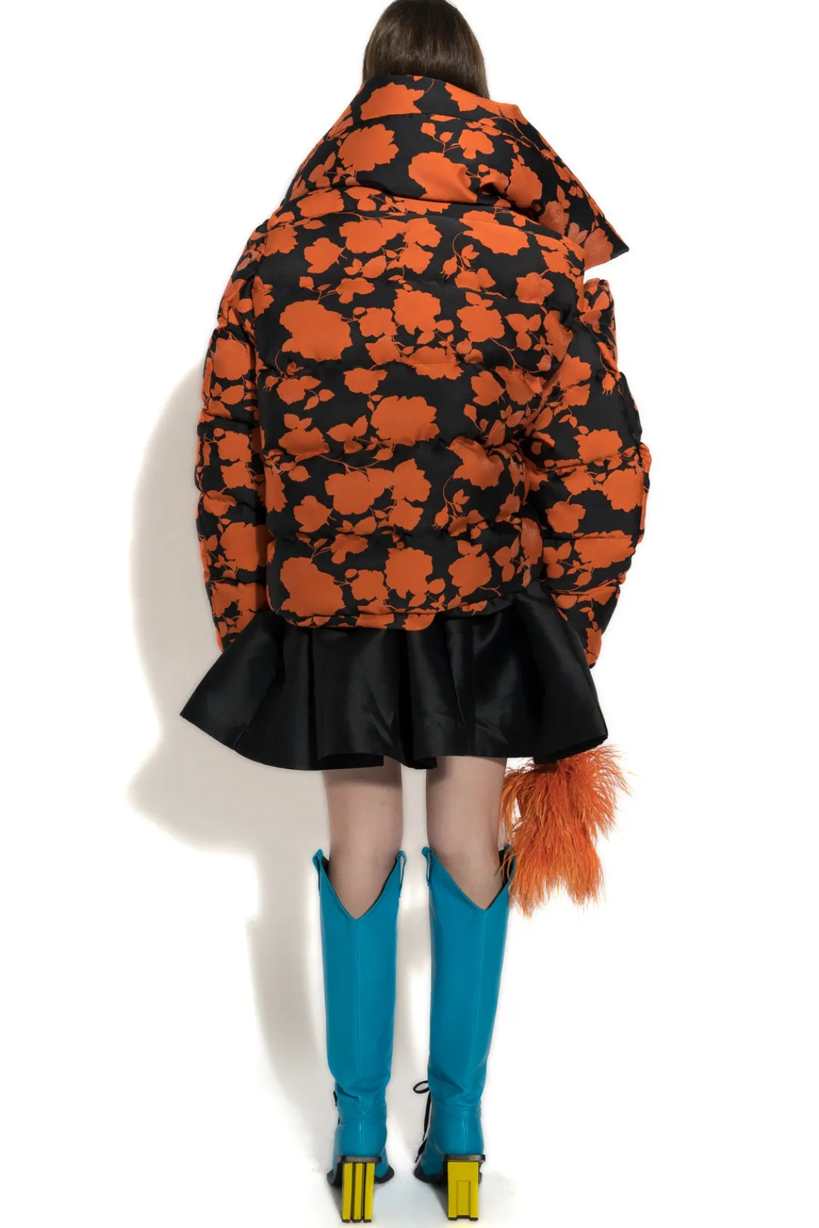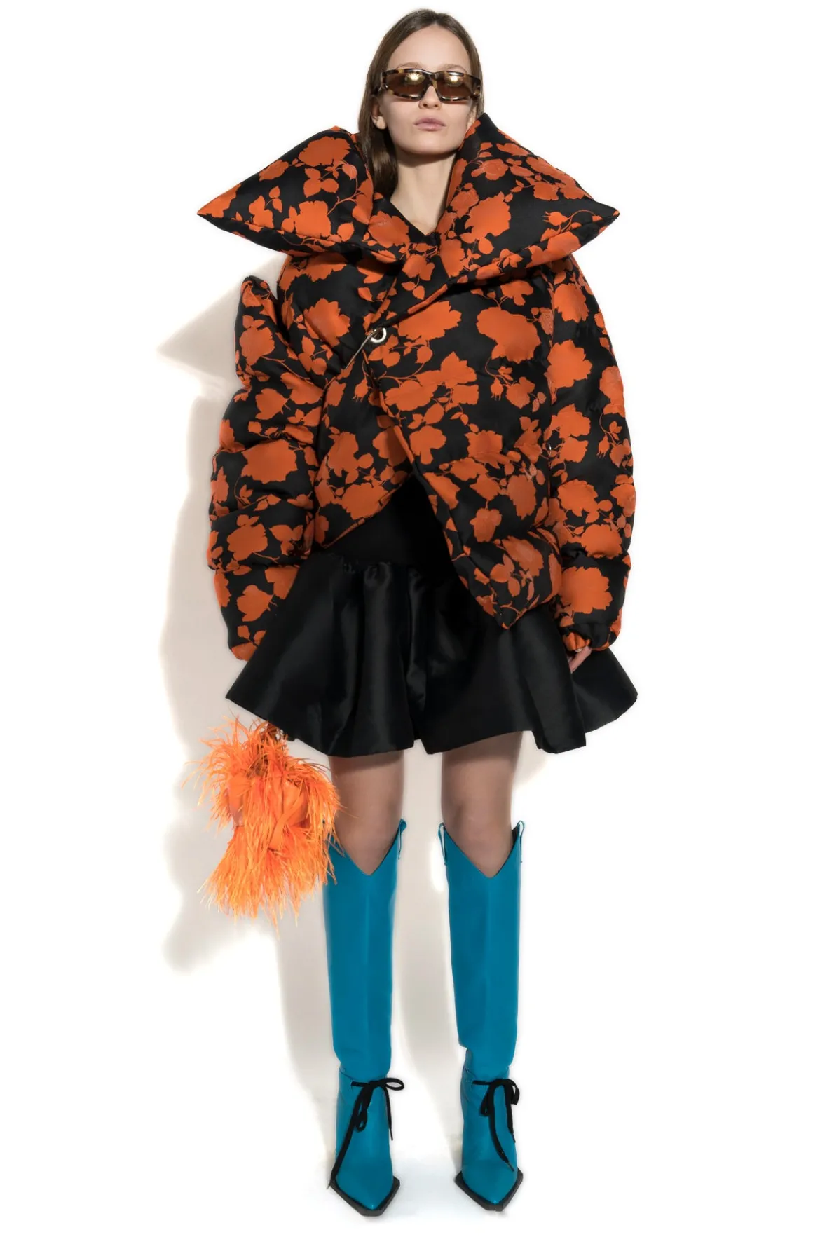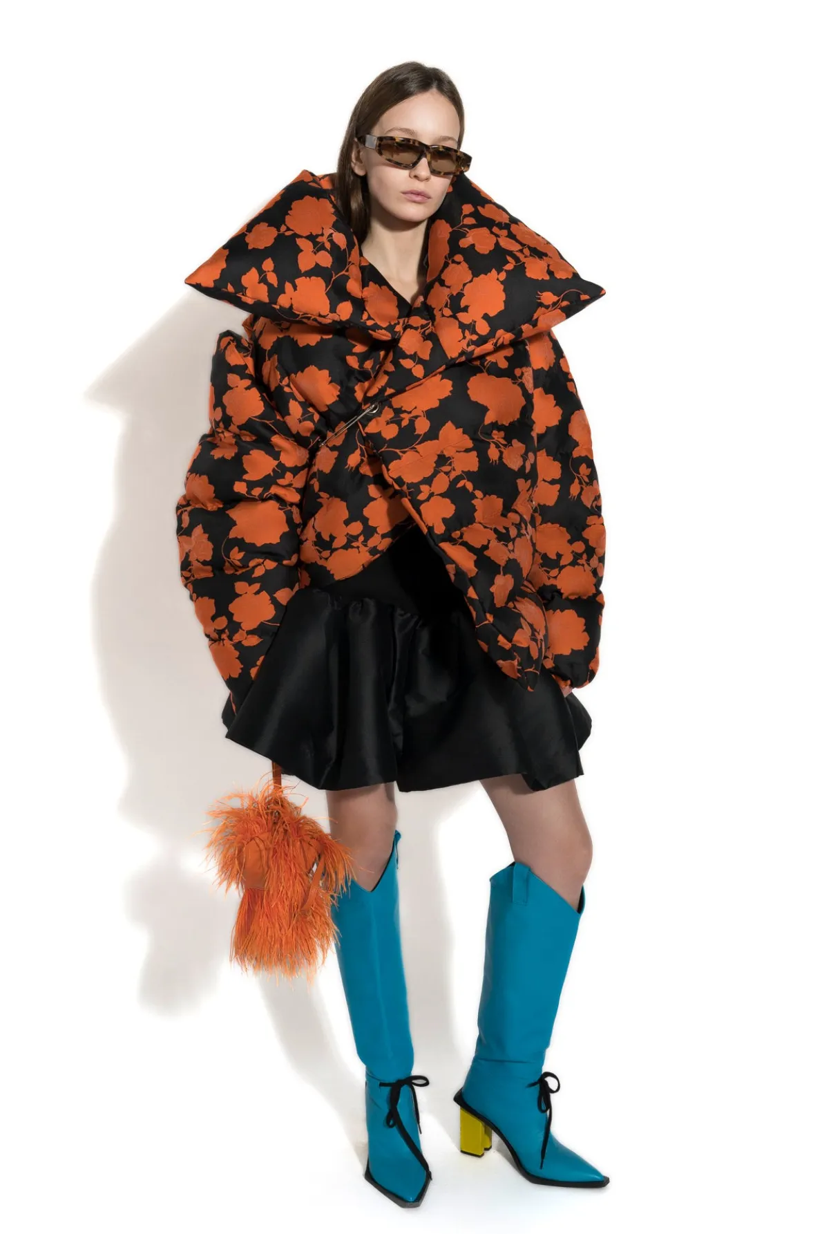Description: Enchant in the eye-catching style of the Classic M'A asymmetric duvet puffa jacket. This marvelous jacket features a black-and-orange floral brocade, a pointed open collar, a silver safety pin closure, an asymmetric hem, and a shoulder opening on the left side. Fabric: Main: 100% Polyester Filling: 90%