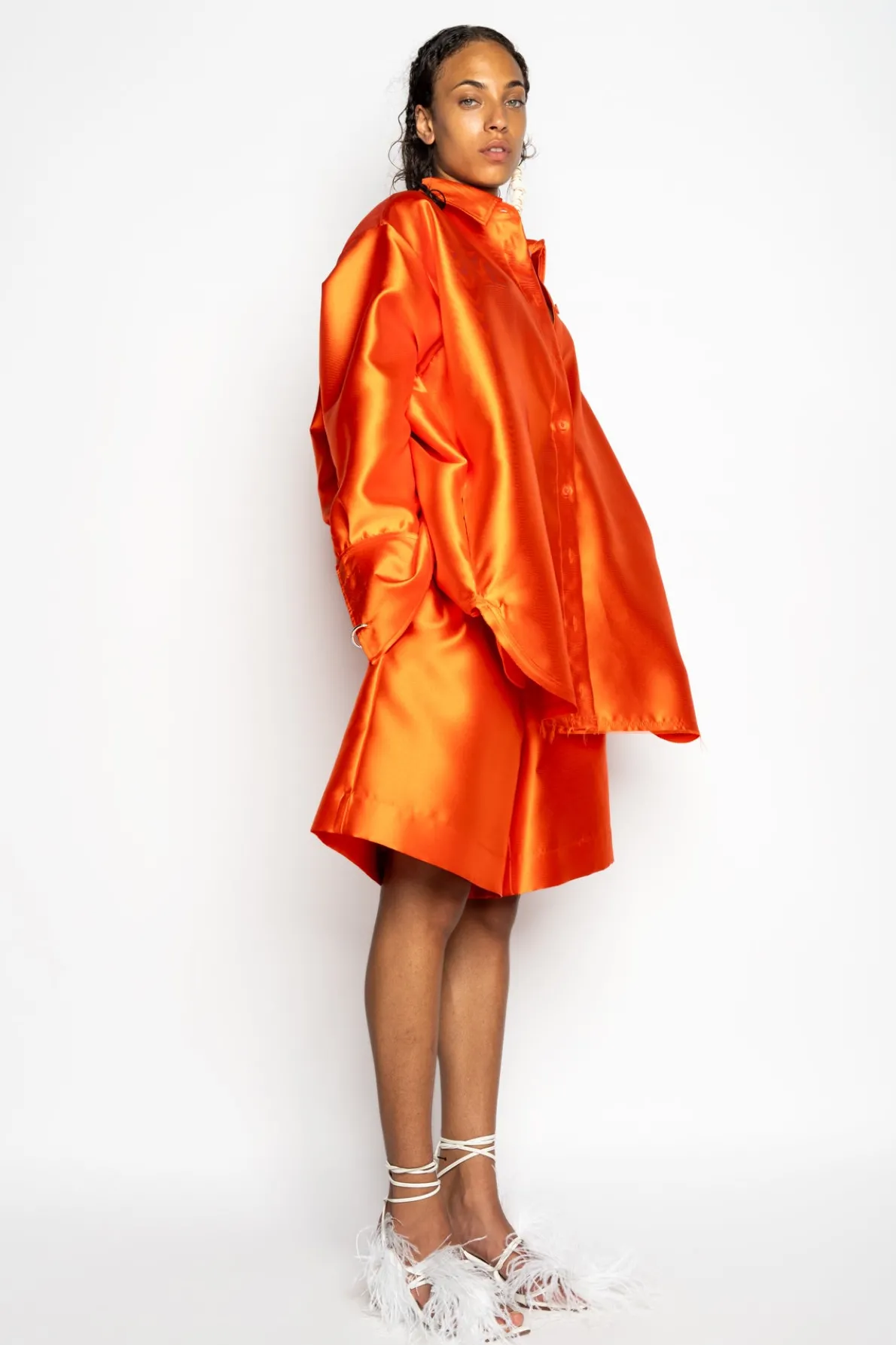 Description: Resplendent orange mikado, this overshirt boasts an oversized fit, long sleeves, ponty collar, big cuffs and front button closure. Sure to make heads turn!• Ponty collar• Front button closure• Long sleeves• Big cuffs Fabric: Mikado 100% Recycled Polyester size and fit: Oversized and is wearing a si