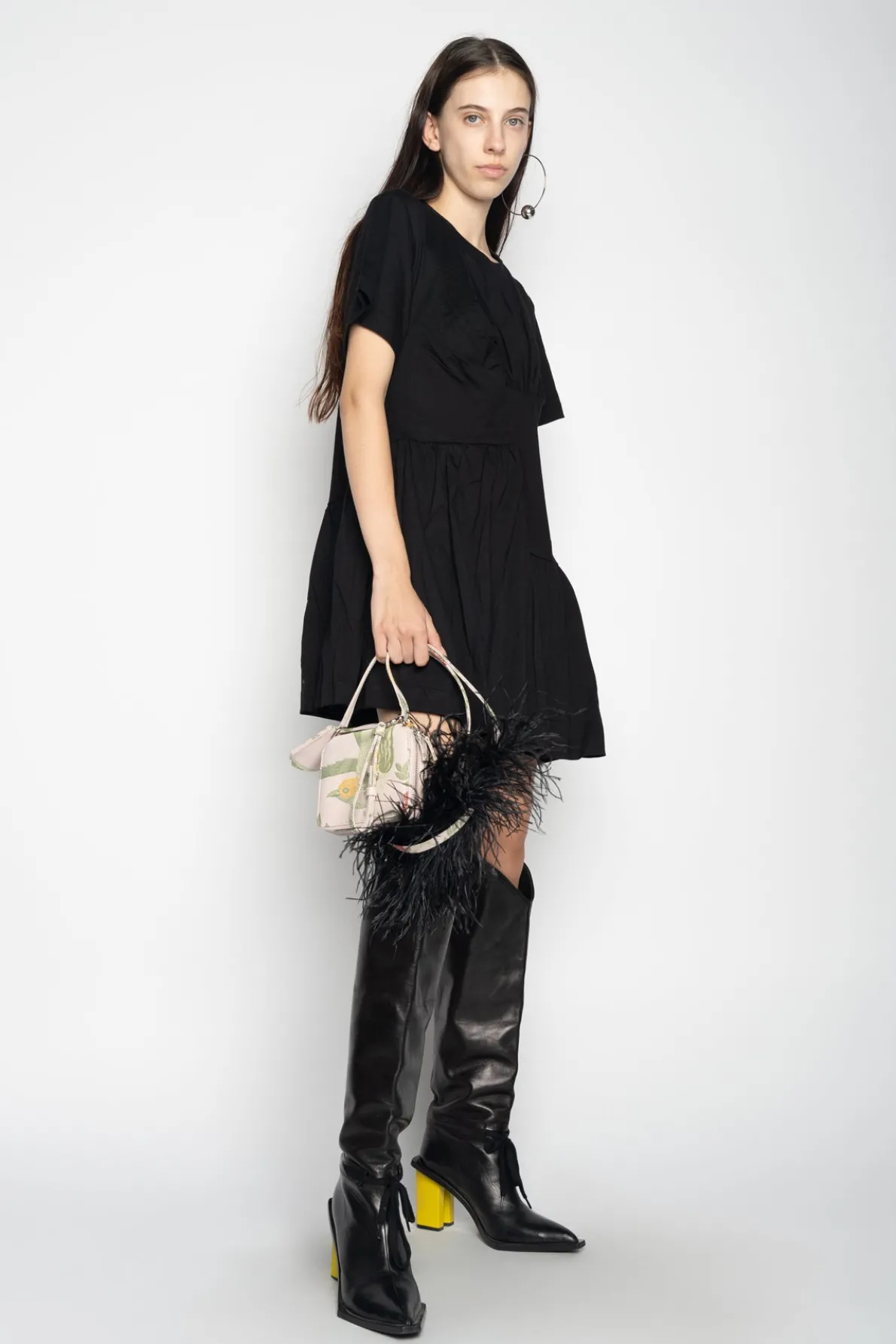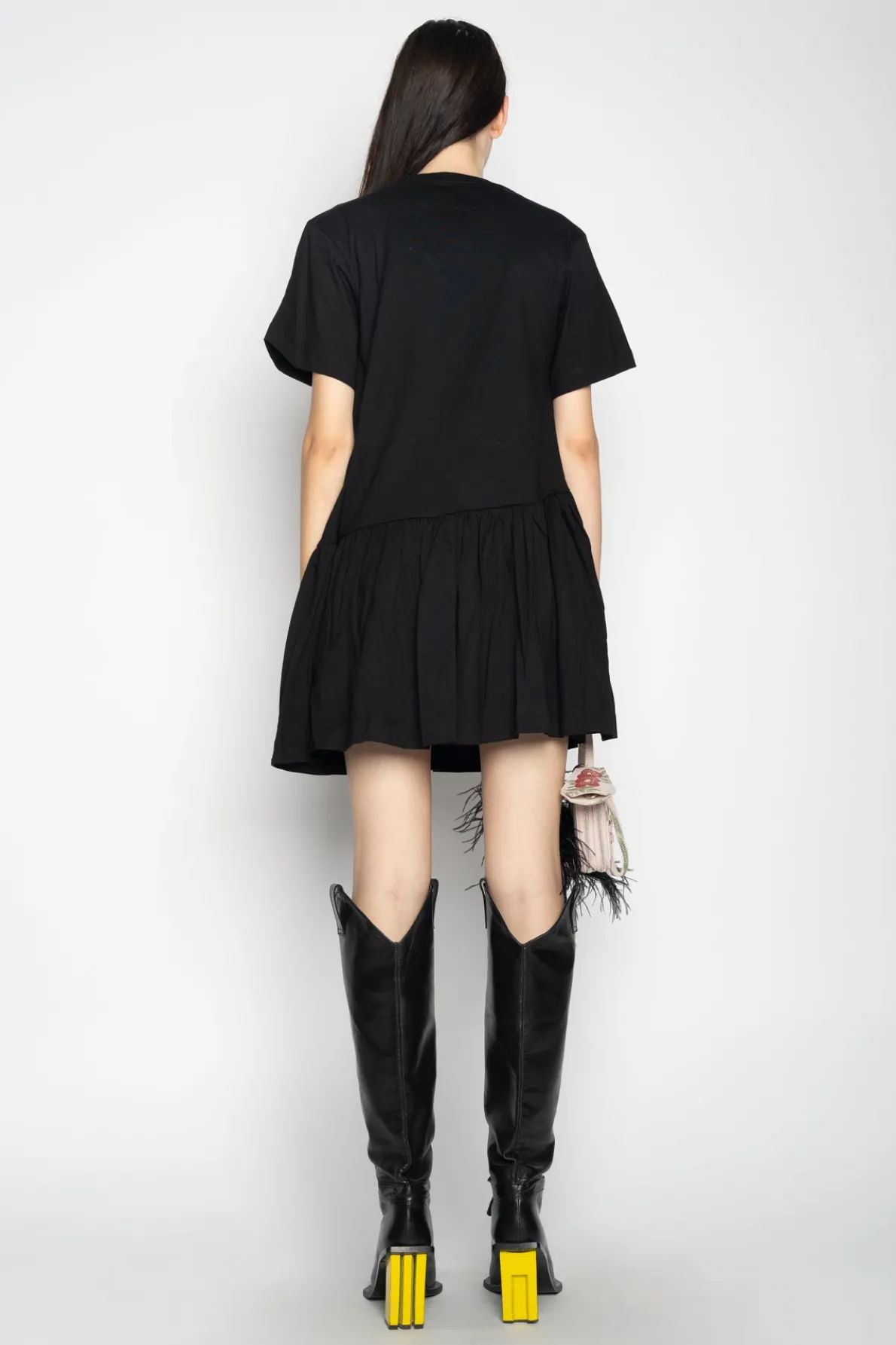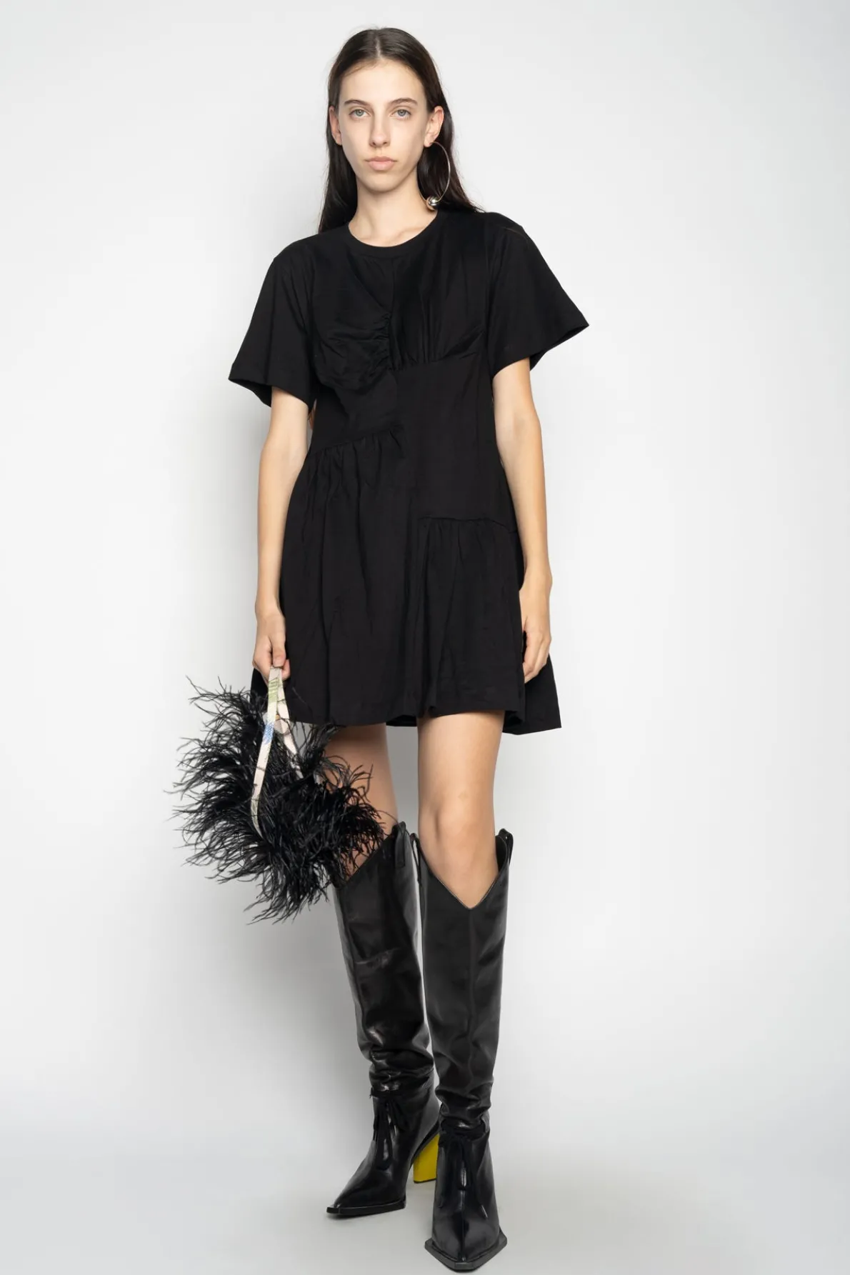 Take your style to the next level with this black cotton jersey dress! This stunning short sleeve number features flattering panelling and elegant ruched detailing to enhance your silhouette. Plus, it has a rib knit crewneck collar for an extra touch of sophistication.• Ruched front• Round neck• Short sleeves• Ruflled hem