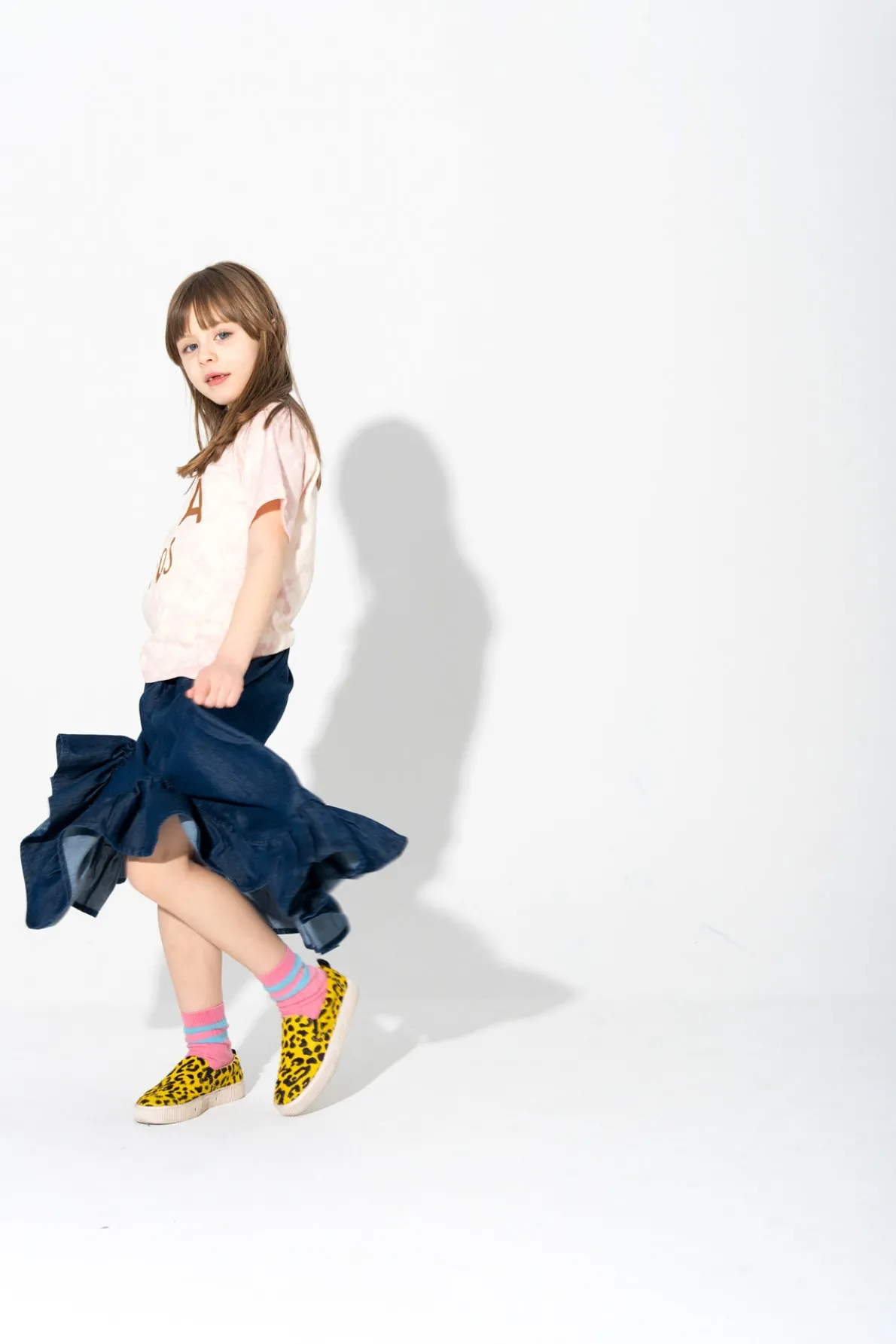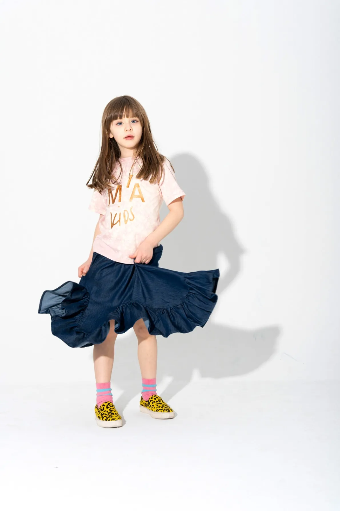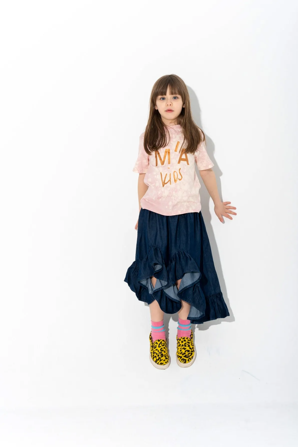 One shoulder top in denim with asymmetric and frayed hem. Fabric: Denim 85% Cotton, 15% Recycled Cotton size and fit: Product in pictures is size 5 years