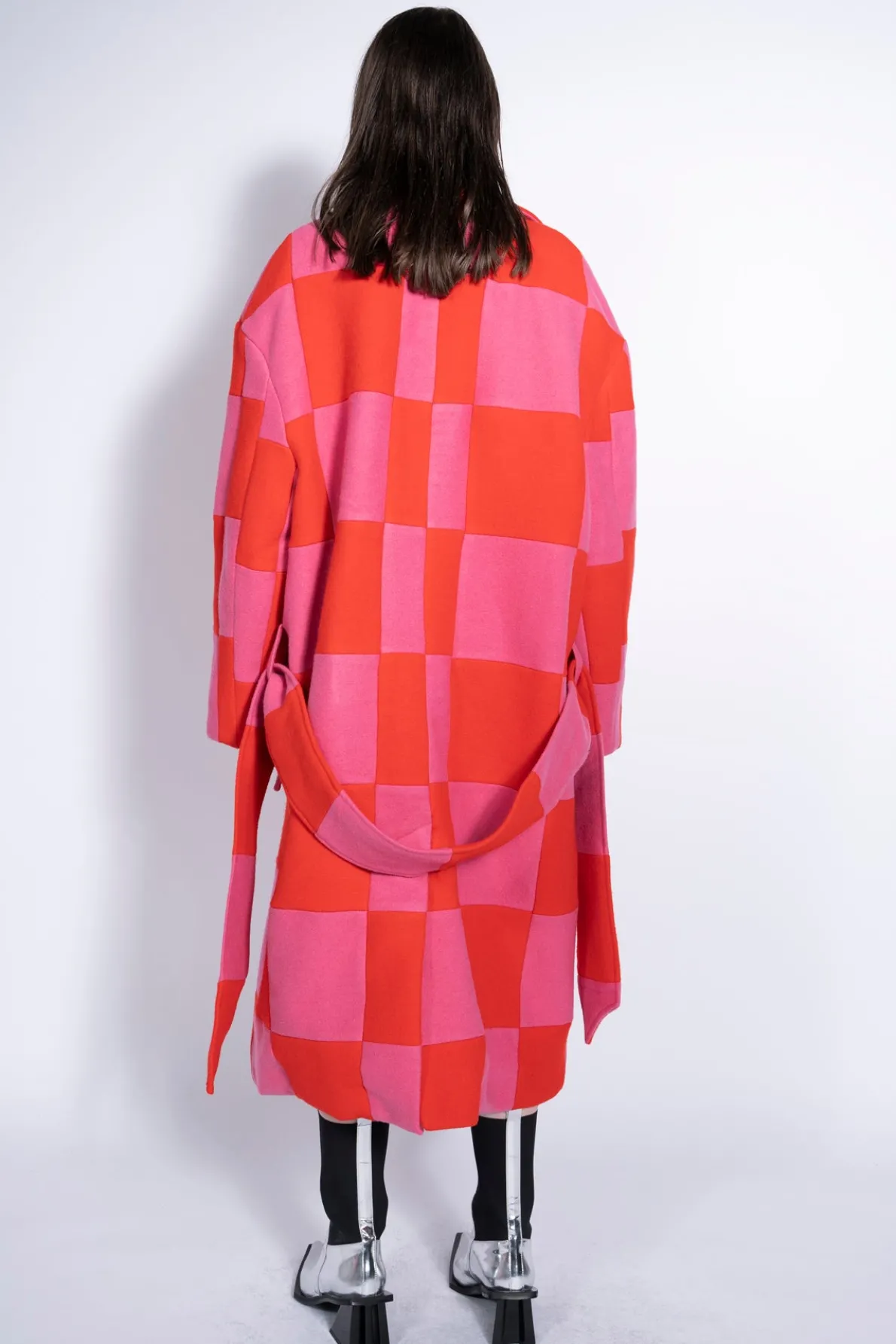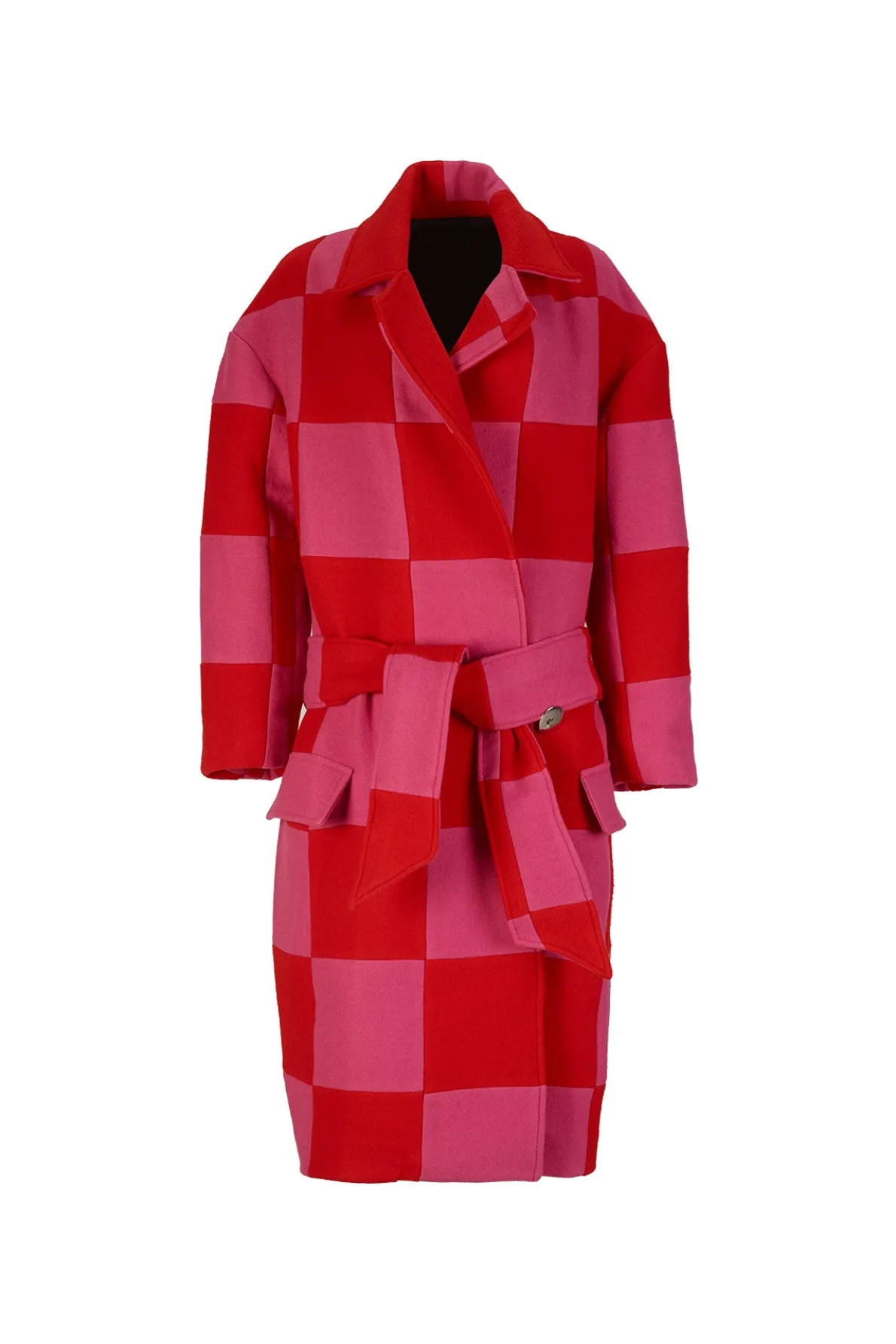 Description: This classic checkered long coat radiates with its vibrant shades of pink and red. Its wide collar and button detail at the front add a timeless touch of style. Fabric: FELT Main: 100% Wool / Lining: 100% Viscose size and fit: OVERSIZED Yana is 5ft7 / 1.70 cm and is wearing a size Small (UK8) Ple