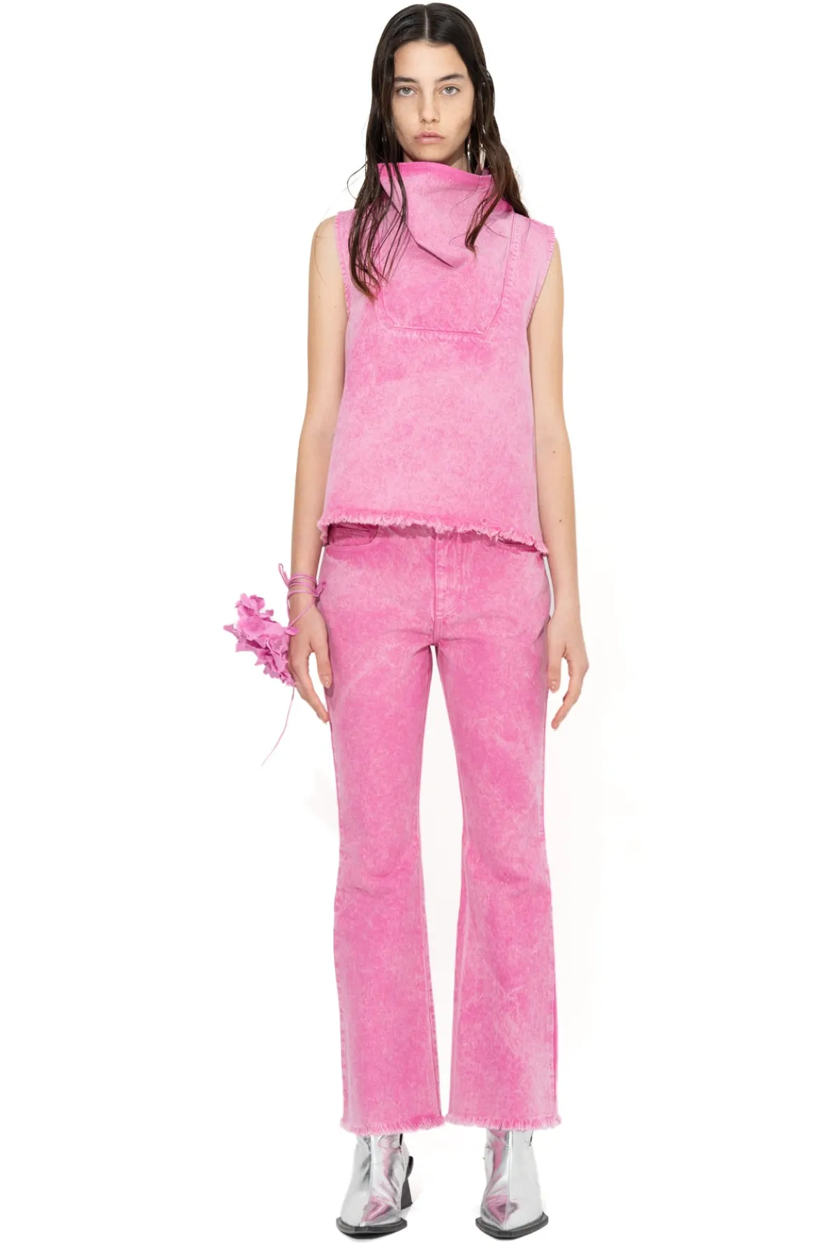 Description: Sleeveless top in pink-washed denim that features a cowl neck, back zip fastening and raw edges. This pink-washed denim sleeveless top will turn heads with its fashionable cowl neck, convenient zip closure, and signature raw edges! Enjoy the perfect blend of style and comfort! Fabric: Drill 50%Cotton,