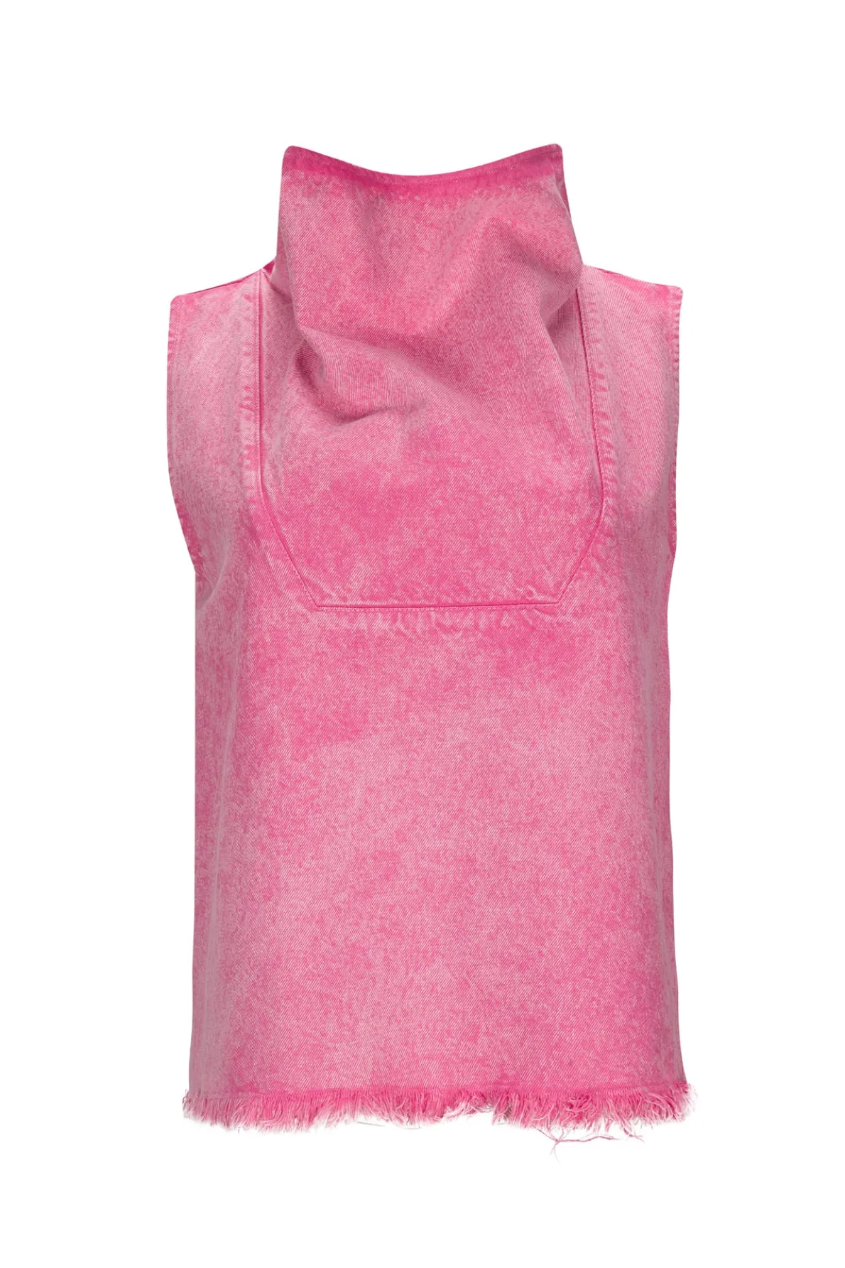 This pink-washed denim sleeveless top will turn heads with its fashionable cowl neck, convenient zip closure, and signature raw edges! Enjoy the perfect blend of style and comfort!• Sleeveless• Cowl neck• Zip closure• Raw hems
