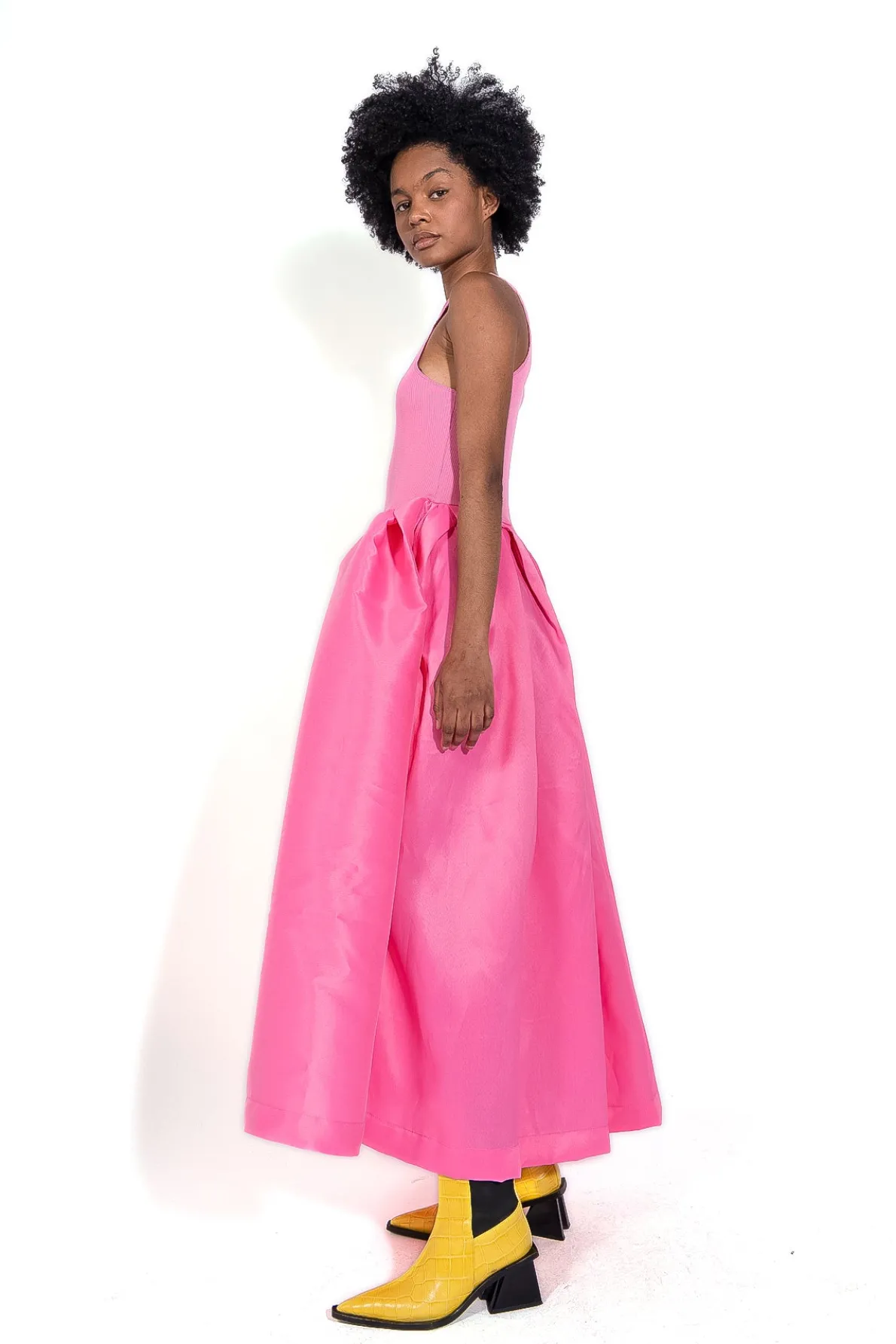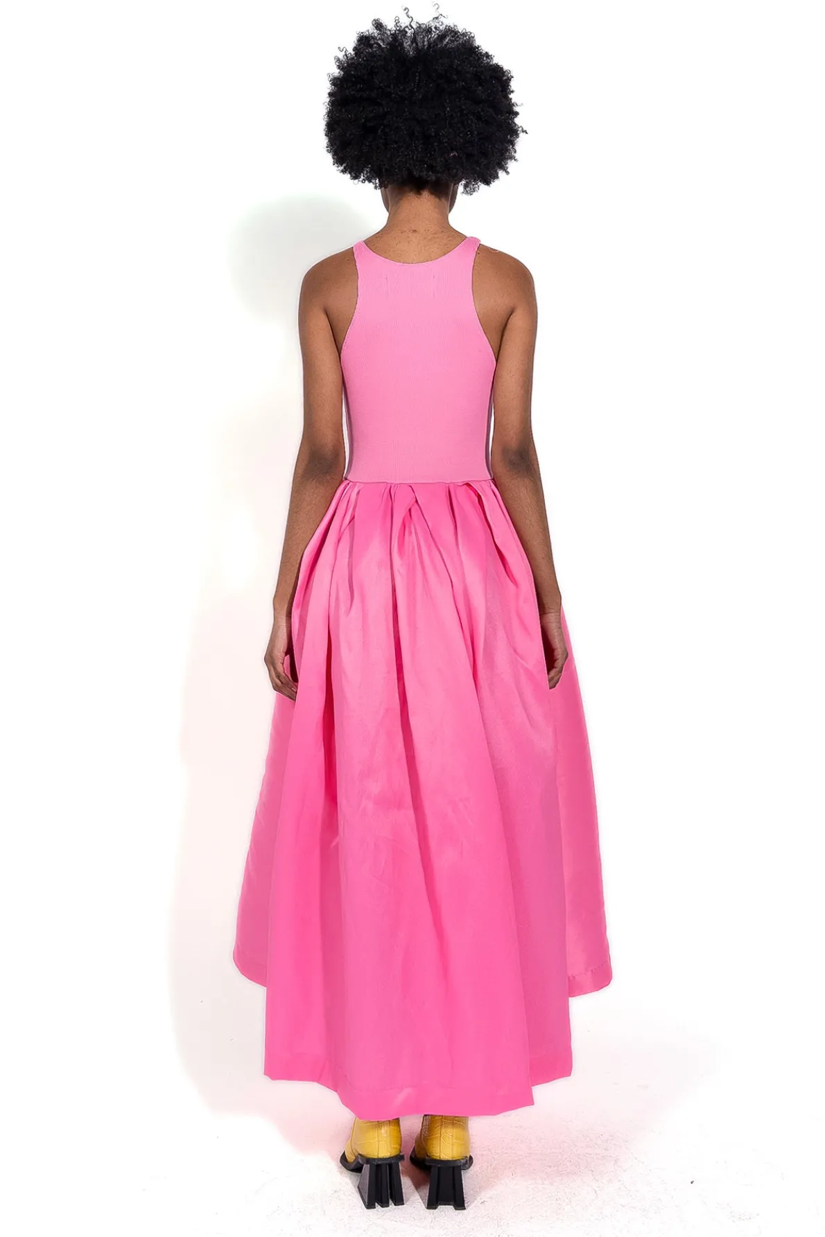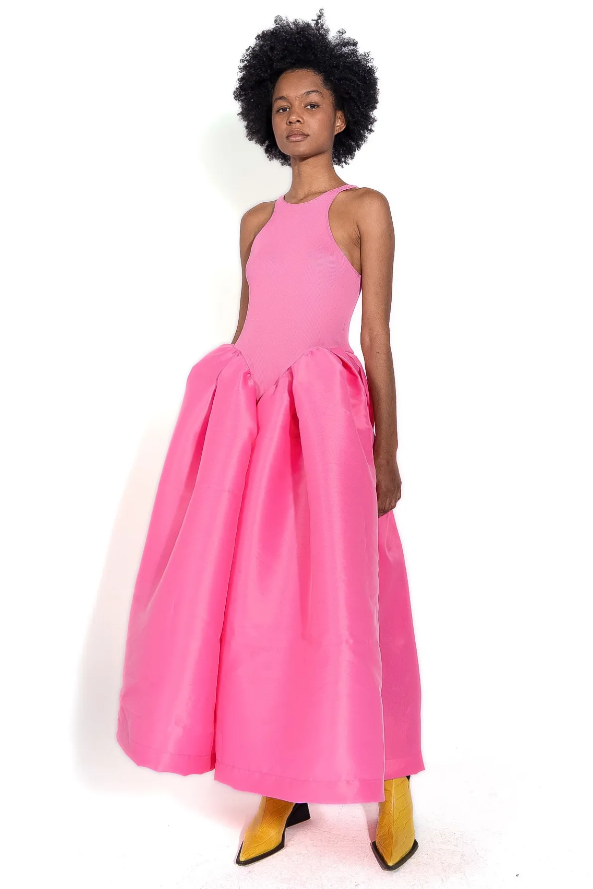 Description: Flaunt your fabulous style in this stylish long dress featuring a rib jersey tank top and a dreamy pink puff skirt. Fabric: Rib Jersey Rib: 97% Organic Cotton, 3% Elastane / Fabric: 85% Recycled Polyester, 15% Silk Made with organic cotton, recycled polyester and silk size and fit: Fitted Whitne