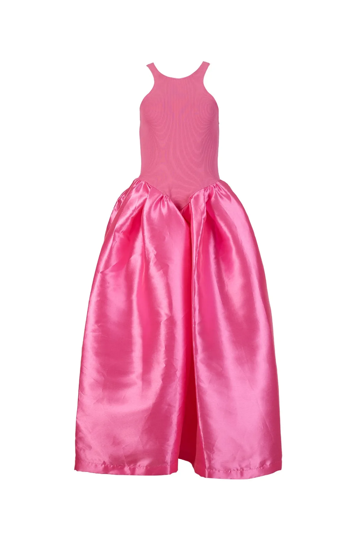 Flaunt your fabulous style in this stylish long dress featuring a rib jersey tank top and a dreamy pink puff skirt.• Bright pink• Sleeveless• Halterneck• Puff skirt