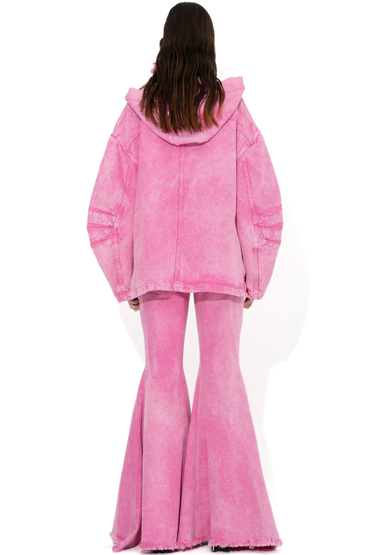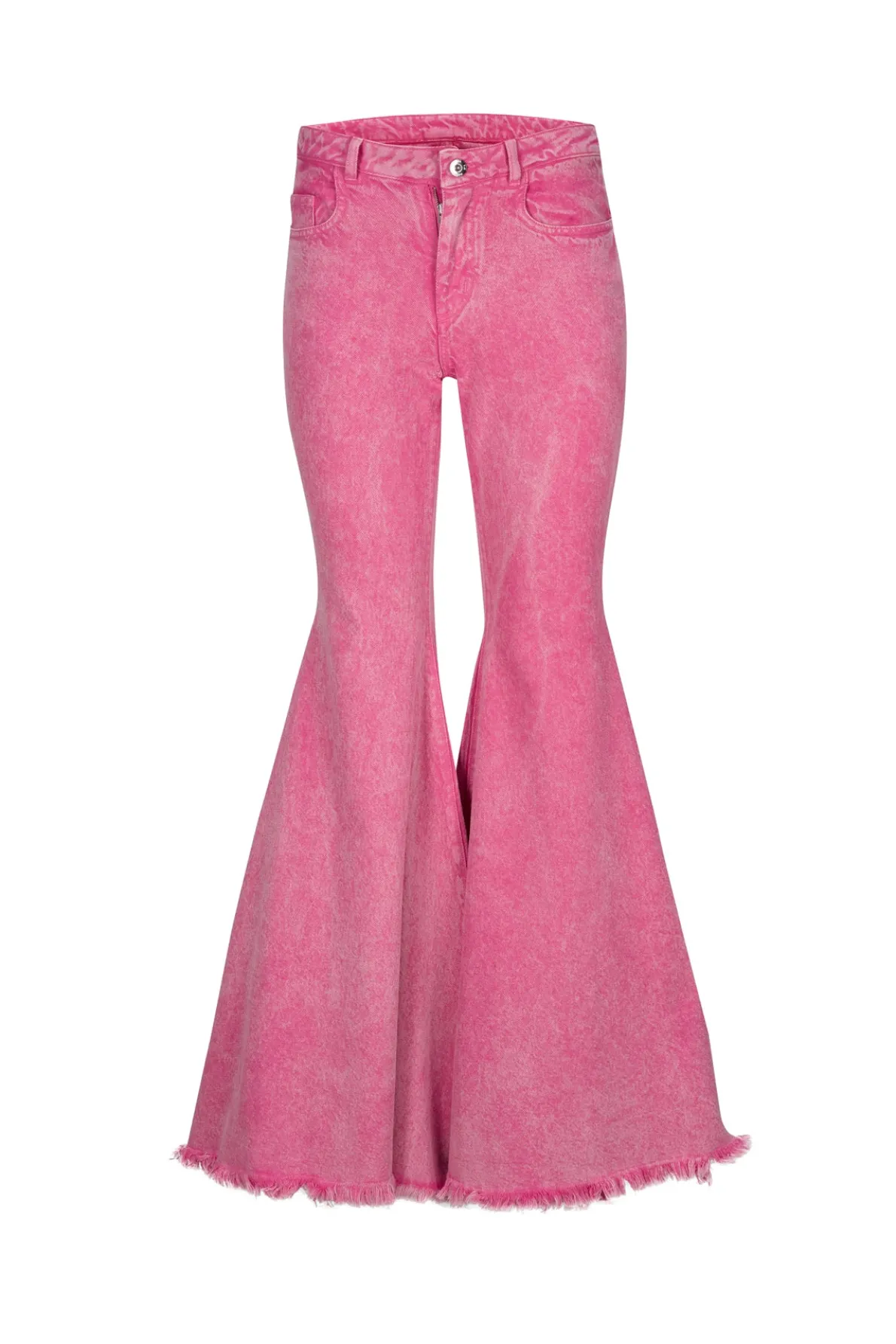 Description: Pink denim trousers with extreme flare style, five pockets, and frayed hem. This style has a small quantity of elastane for a better fit and an amazing silhouette. These pink trousers feature an ultra-flared style, five pockets, and a raw-edge hem for a striking silhouette. Added elastane shows off the