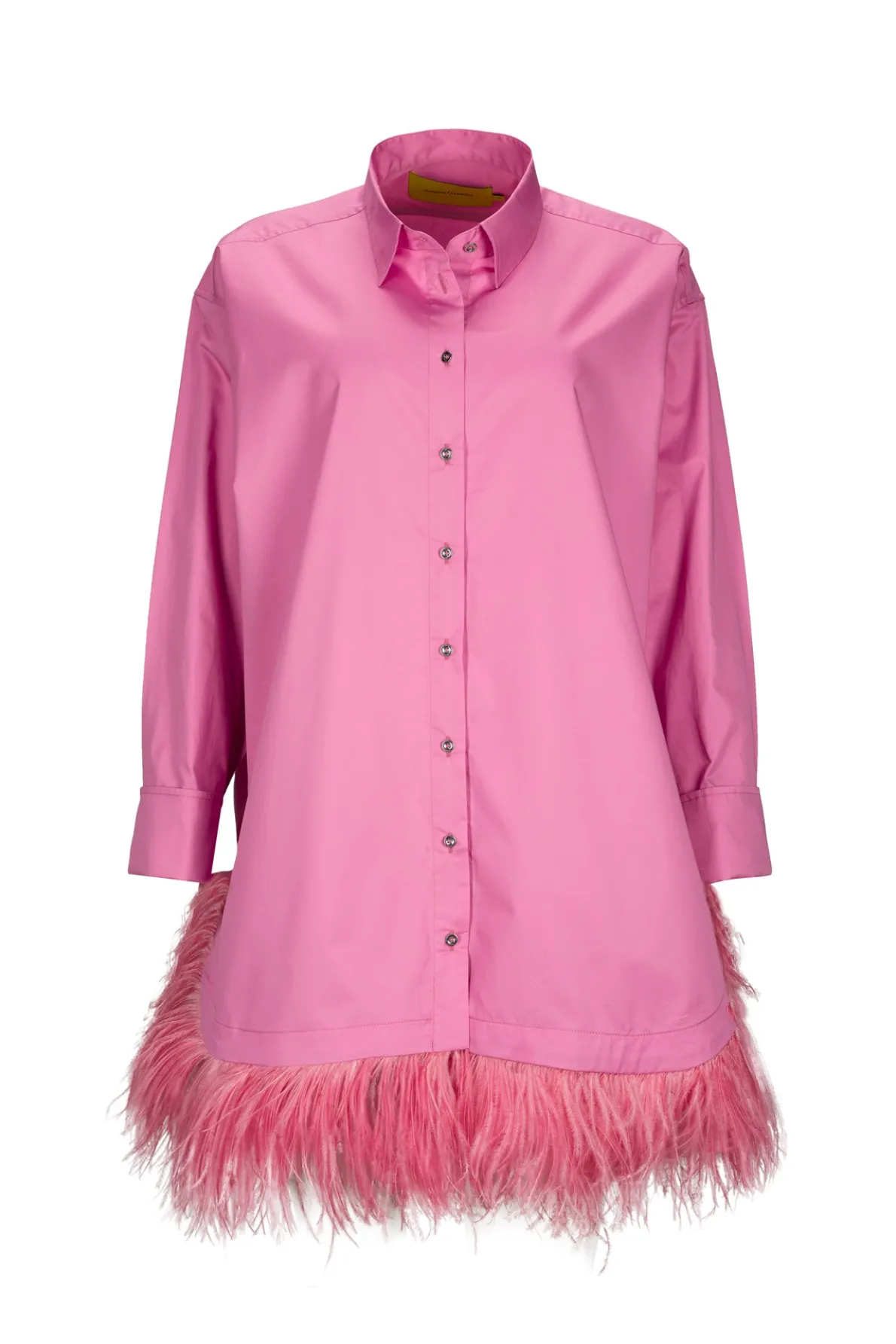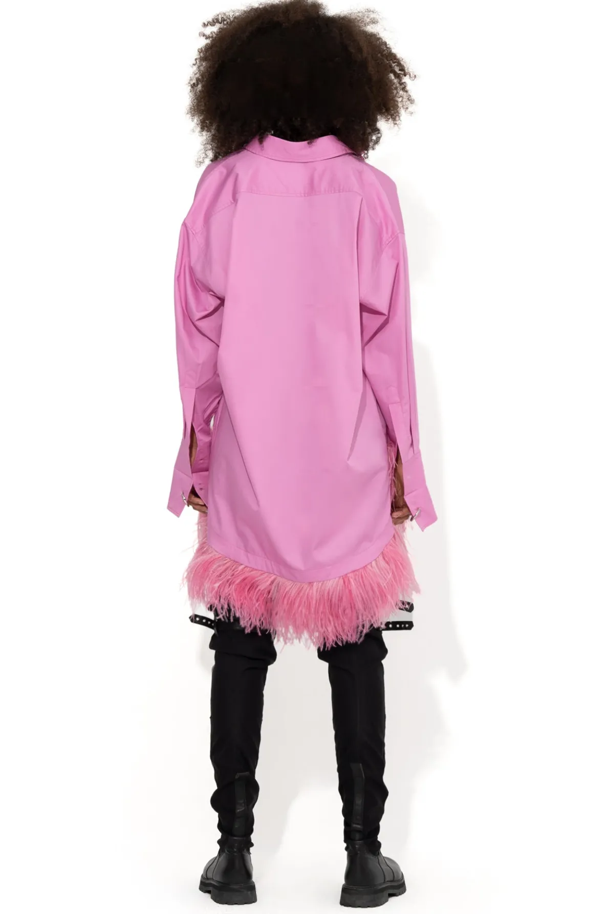 Description: Shirt dress in pink shirting with long sleeves. This dress has a button up front and feathers along the bottom hem. Stay stylish and comfortable in this pink feather hem shirt dress. This dress features a pink shirting fabric with long sleeves and a button-up front, as well as a playful touch with its un