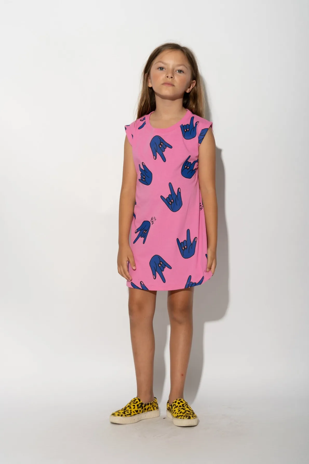 With a playful print of hands all over it, plus a comfortable cut, this t-shirt dress is perfect for kids who want to look cool and feel free, all at once. Wear it to school, to the park, to your next playdate – this dress is always in style!• Pink• Hands print• Short sleeves• Mini length