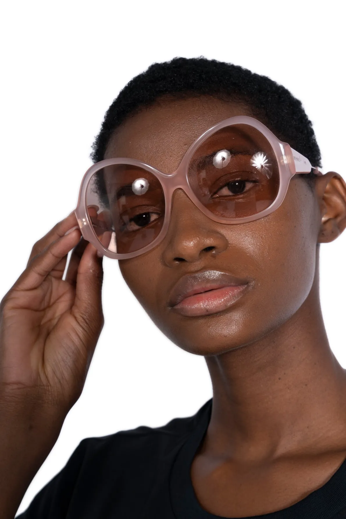 Gloriously oversized round sunglasses with a pink frame and lens that will take your look to the next level.• Round• Light pink frame• Light pink lenses• Silver logo