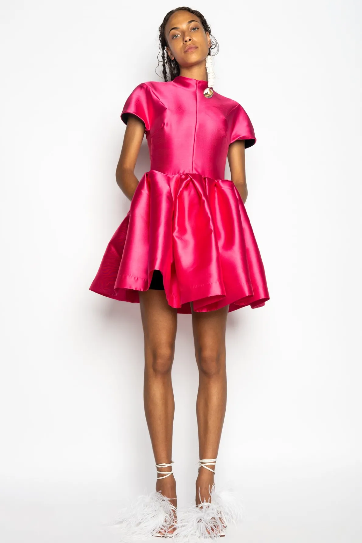 Description: Delight in this vibrant pink Mikado dress that features a mini silhouette, short sleeves, a high neckline, cinched waist and a voluminous skirt! • Cinched• Puff skirt• Short sleeves• Mini length Fabric: Mikado 100% Recycled Polyester size and fit: True to sizeEloisa is 5ft10 / 1.79 cm and is we