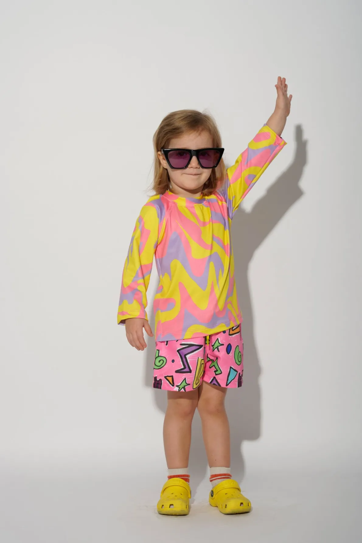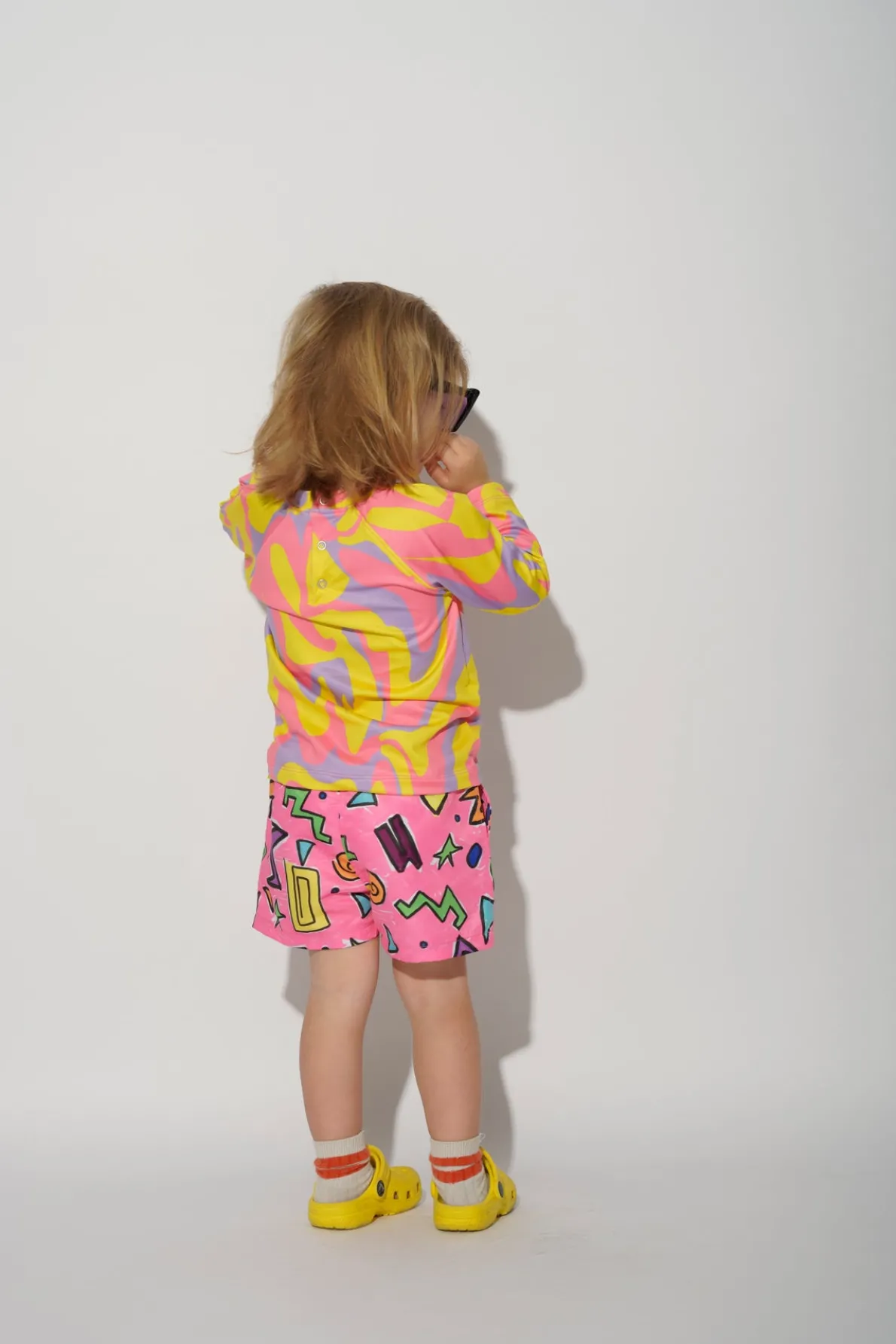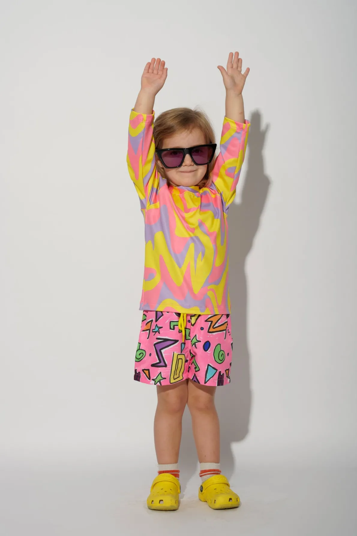 Make a splash in these playful pink print swimwear shorts, featuring a comfy elastic waistband – perfect for getting your kid on!• Squiggle print• Elastic waist• Recycled Polyester• Short length