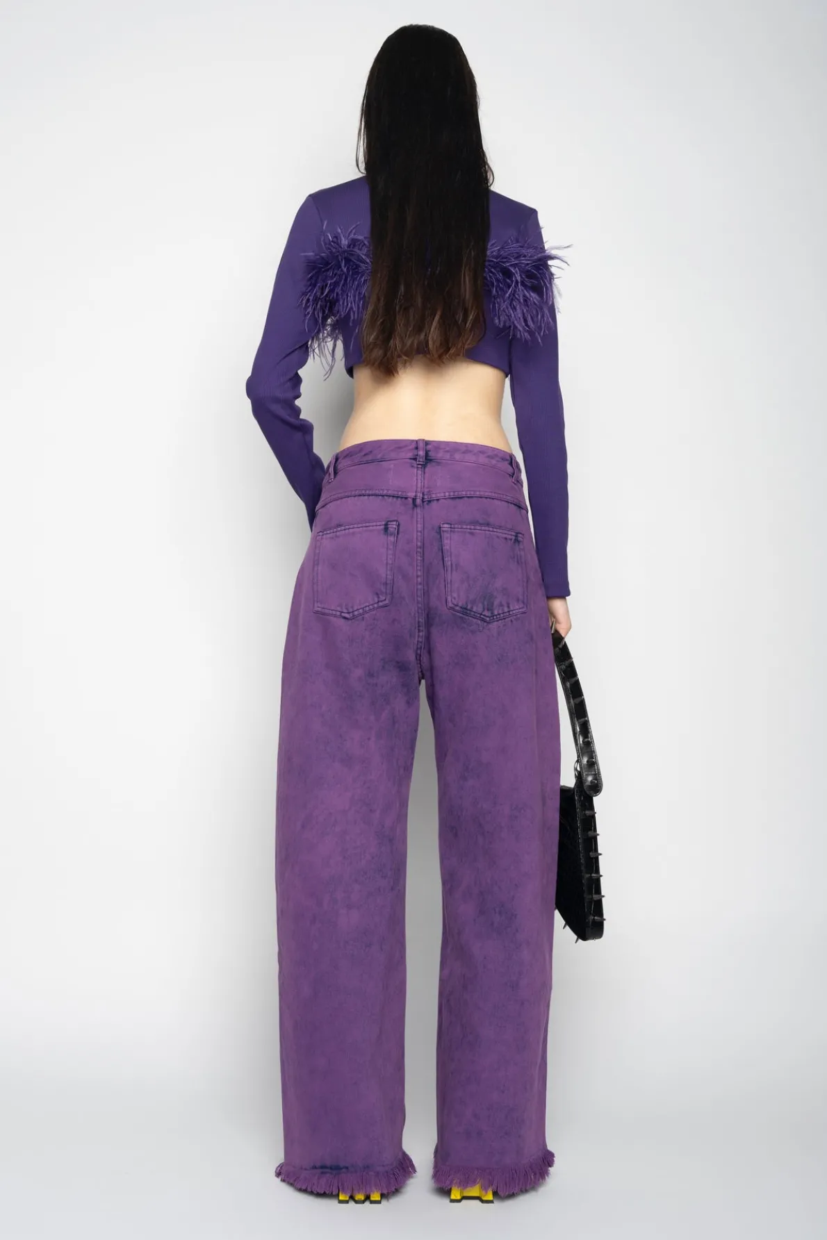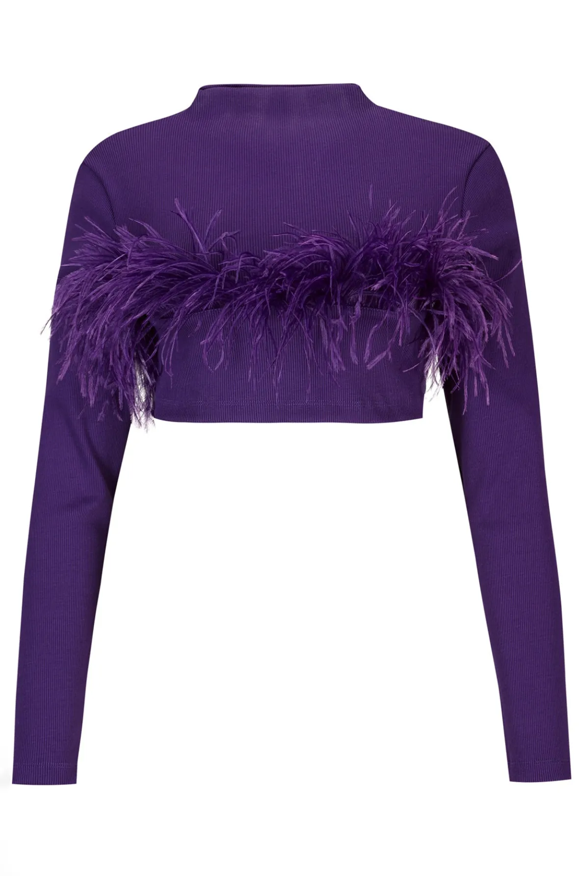 Slip into this stylish purple cropped top crafted from rib jersey, featuring a high neckline, long sleeves and delicate feathers adorning the hem! Perfect for creating a fresh and vibrant look.• Purple• Feathers• High neckline• Cropped
