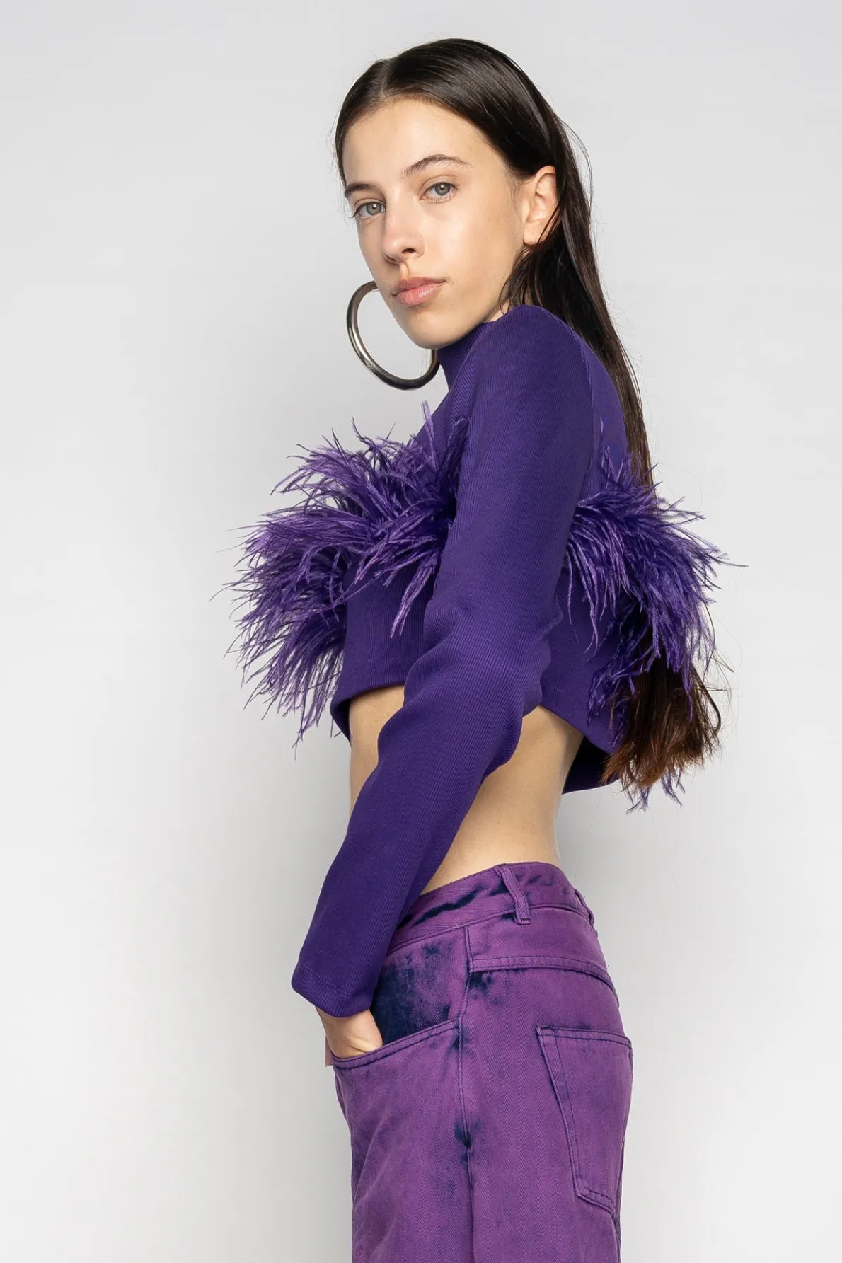 Description: Slip into this stylish purple cropped top crafted from rib jersey, featuring a round neckline, long sleeves and delicate feathers adorning the hem! Perfect for creating a fresh and vibrant look. Fabric: Rib Jersey Main: 97% Organic Cotton, 3% Elastane Trim: 100% Feathers size and fit: Fitted Beatri