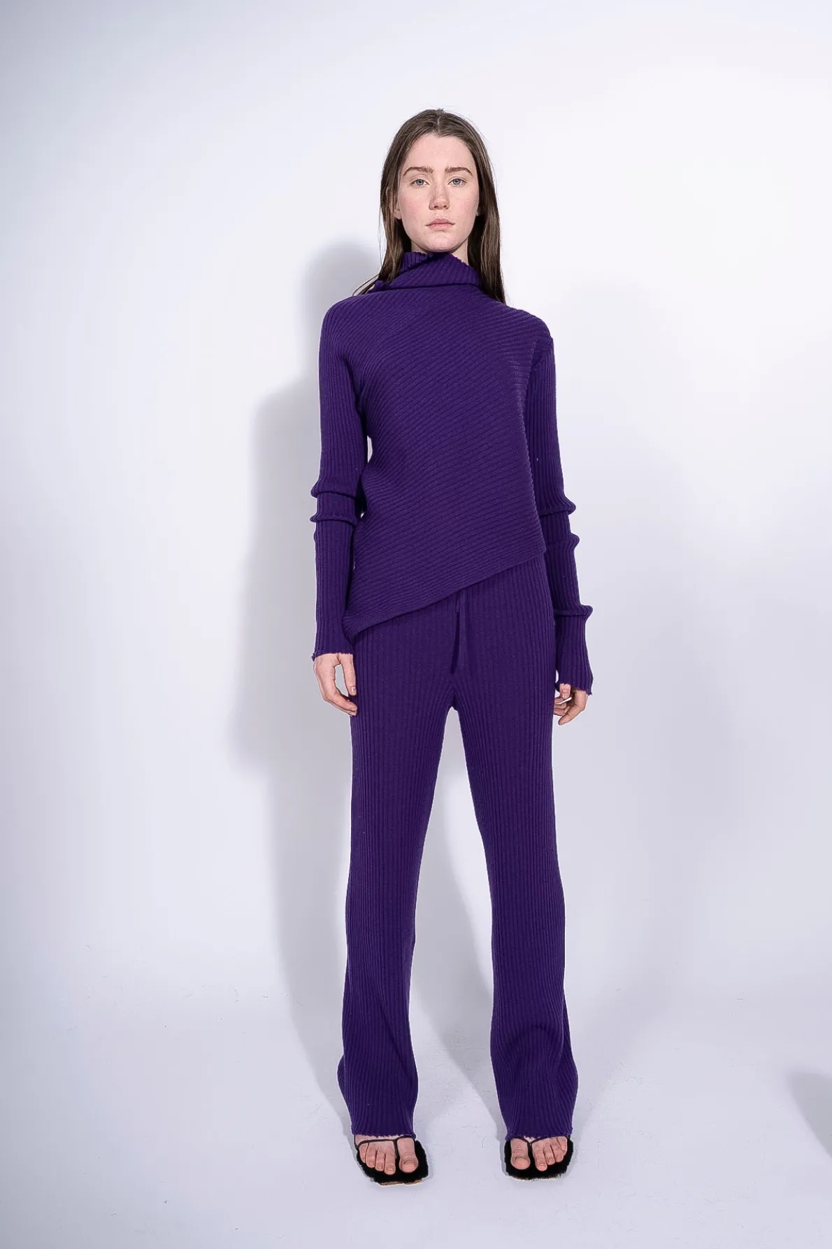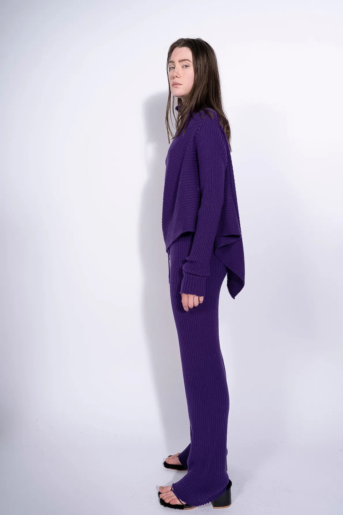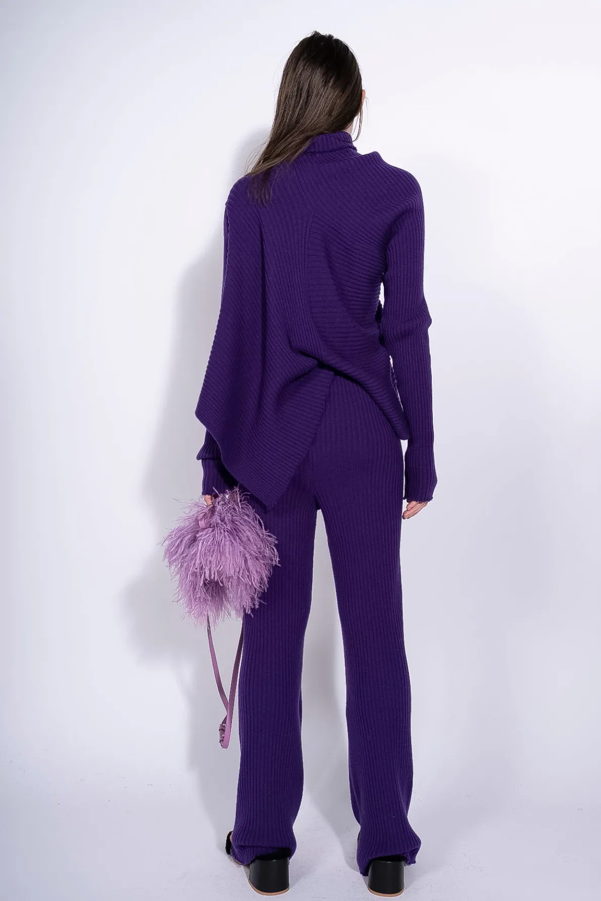 Purple wool trousers featuring an elasticated waistband with a drawstring fastening, a high waist and an unfinished hem.• Purple• Elastic waistband• Drawstring fastening• Raw hem