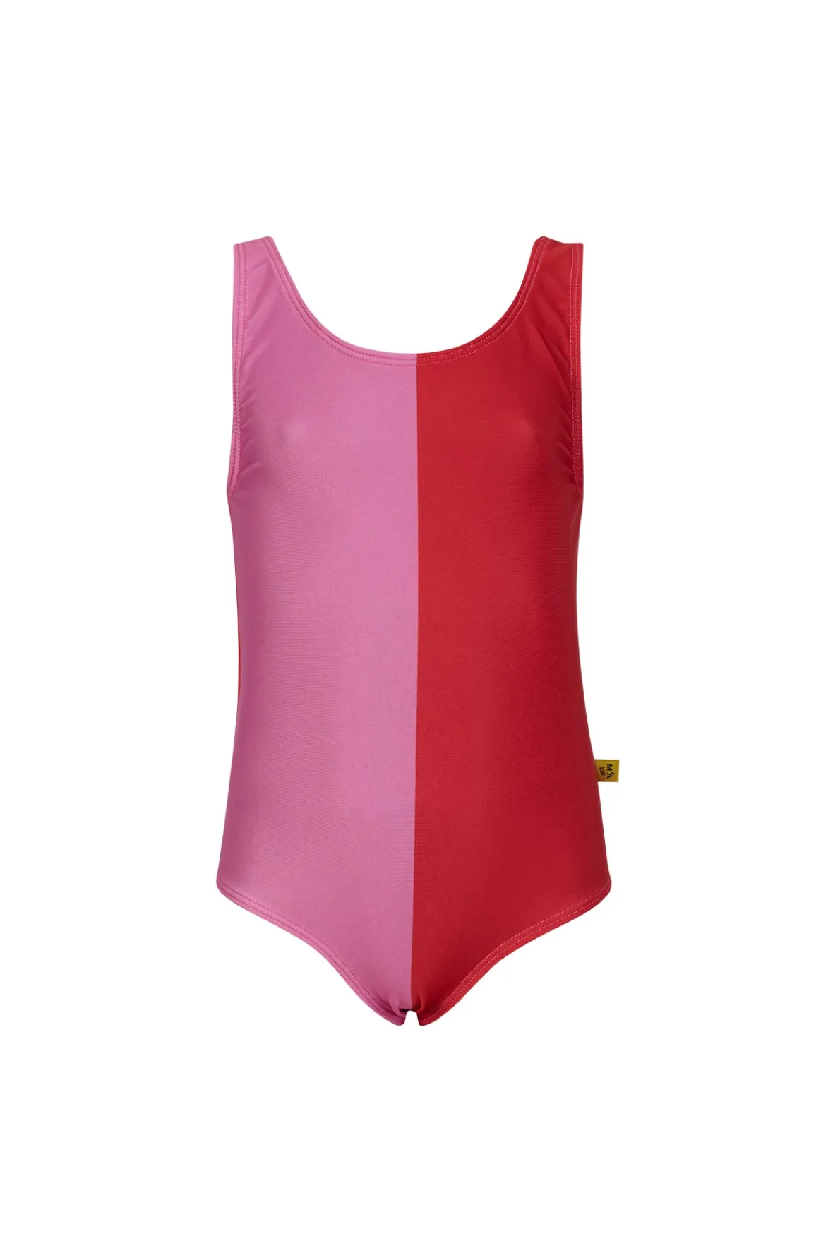 Make a splash in these playful pink and red striped swimsuit.• Red and pink• Stripes• U neckline• Sleeveless