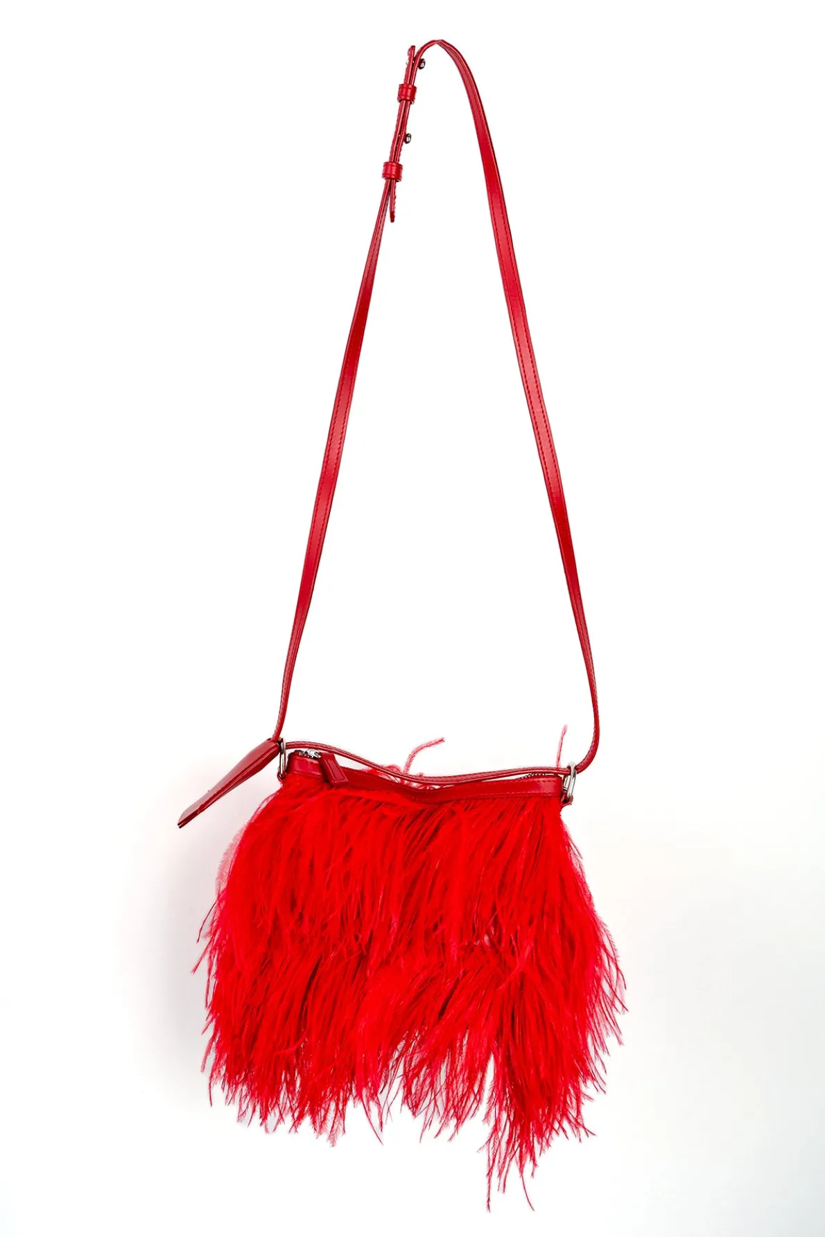 Marvel at the stunning, lightweight red feathers adorning this soft red leather bag! Conveniently fasten it with a zip, secure your items in the inside pocket, and wear the strap crossbody, as a handbag, or even as a clutch around your wrist.• Red• Leather• Feathers• Shoulder and hand straps