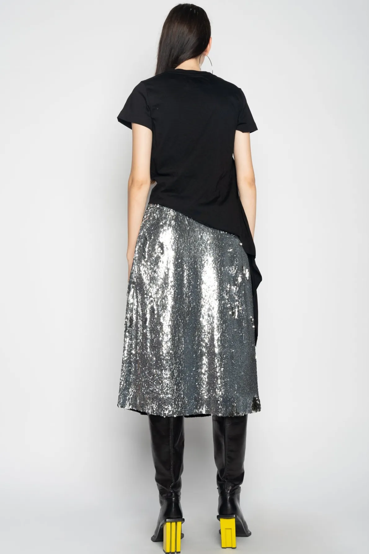Glistening silver sequins in an elegant midi-length design, cinched with an elastic waistband – this classic skirt is sure to be a staple in your wardrobe!• Mid-length• Invisible zipper• Sequins• Silver