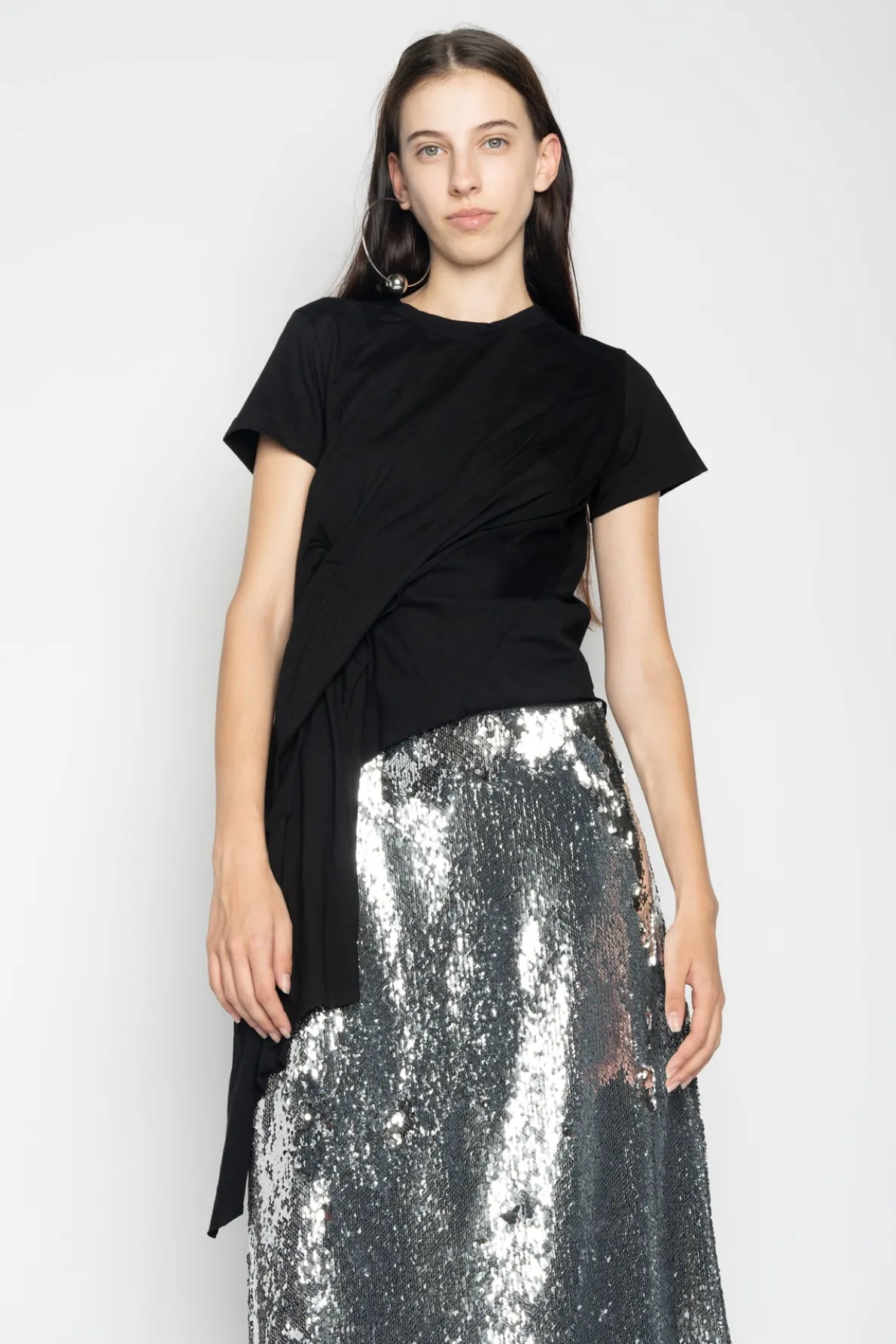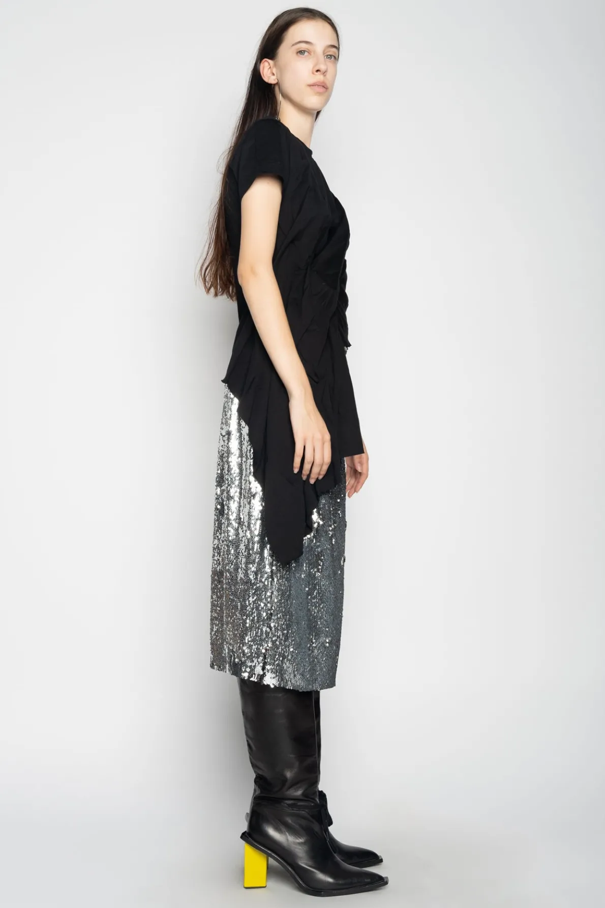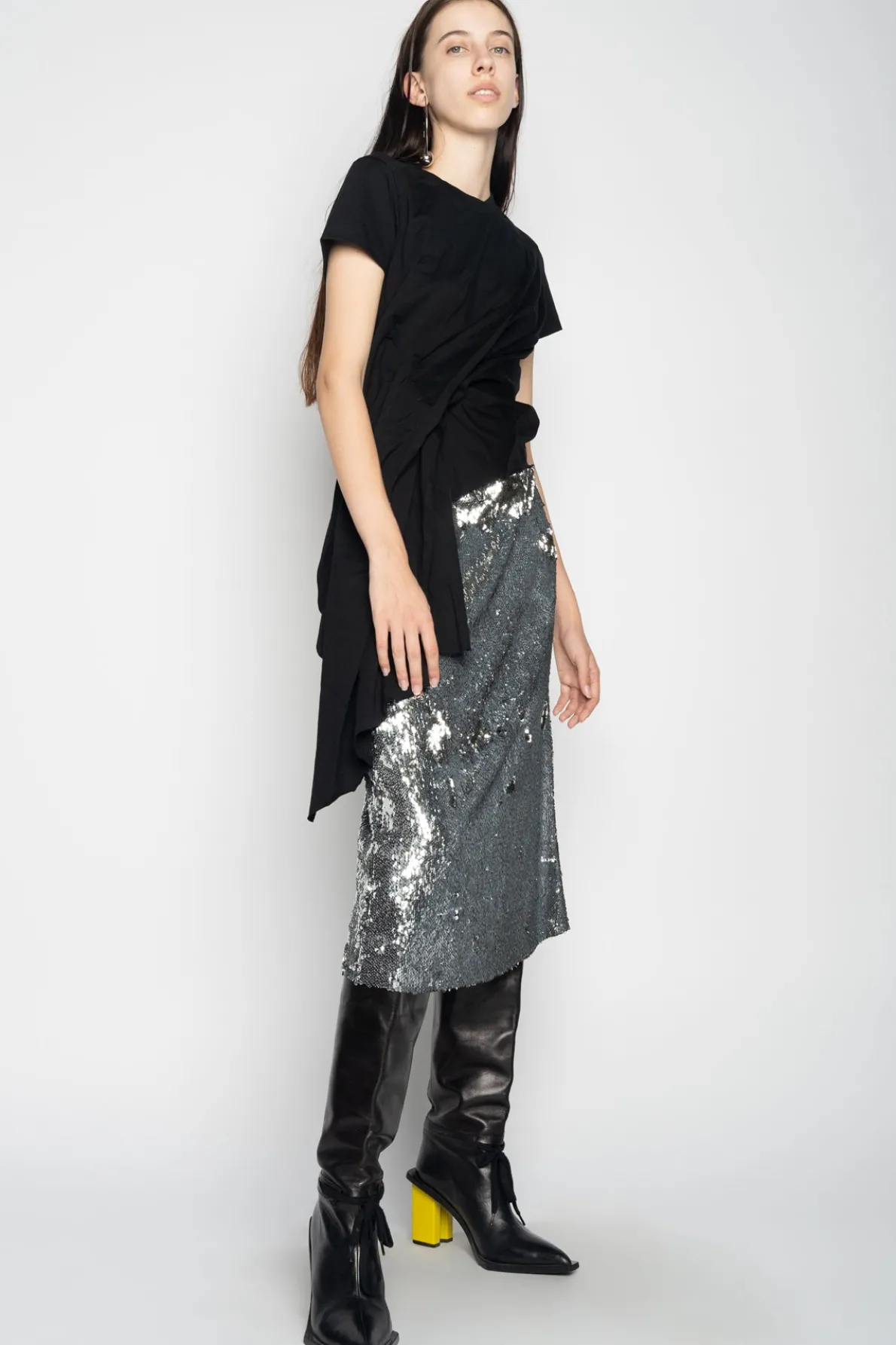 Description: Glistening silver sequins in an elegant midi-length design, cinched with an elastic waistband – this classic skirt is sure to be a staple in your wardrobe! Fabric: SEQUINS MAIN: 97% Polyester / 3% Elastane +100% Pet sequins LINING: 97% Polyester / 3% Spandex size and fit: TRUE TO SIZE Beatriz is 5ft8