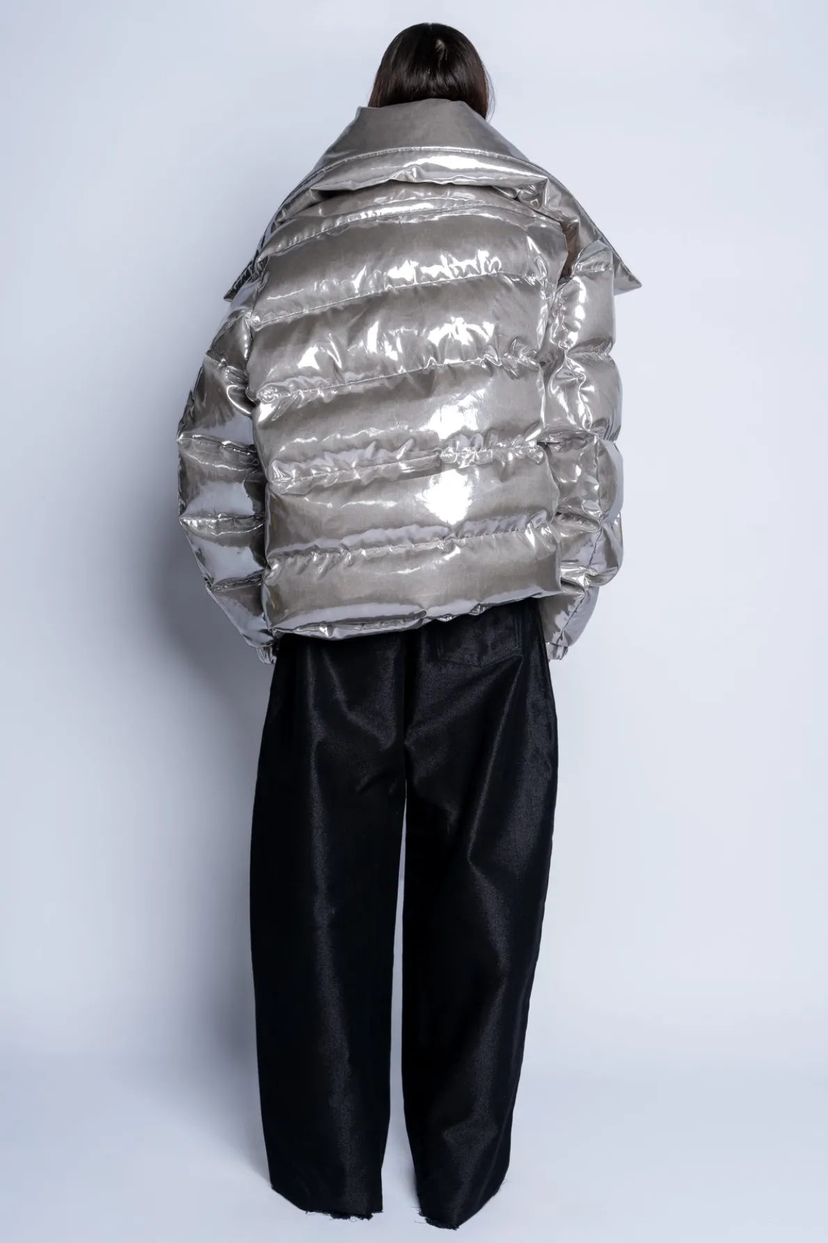 Description: Classic M'A PUFFA Jacket in luxurious silver! Flaunt this stylishly-pointed open-collar silhouette, secured by a striking silver safety pin closure. Boasting an asymmetric hem and an eye-catching opening on the left shoulder, this jacket is a must-have in your wardrobe. Fabric: Main: 100% Recycled Poly