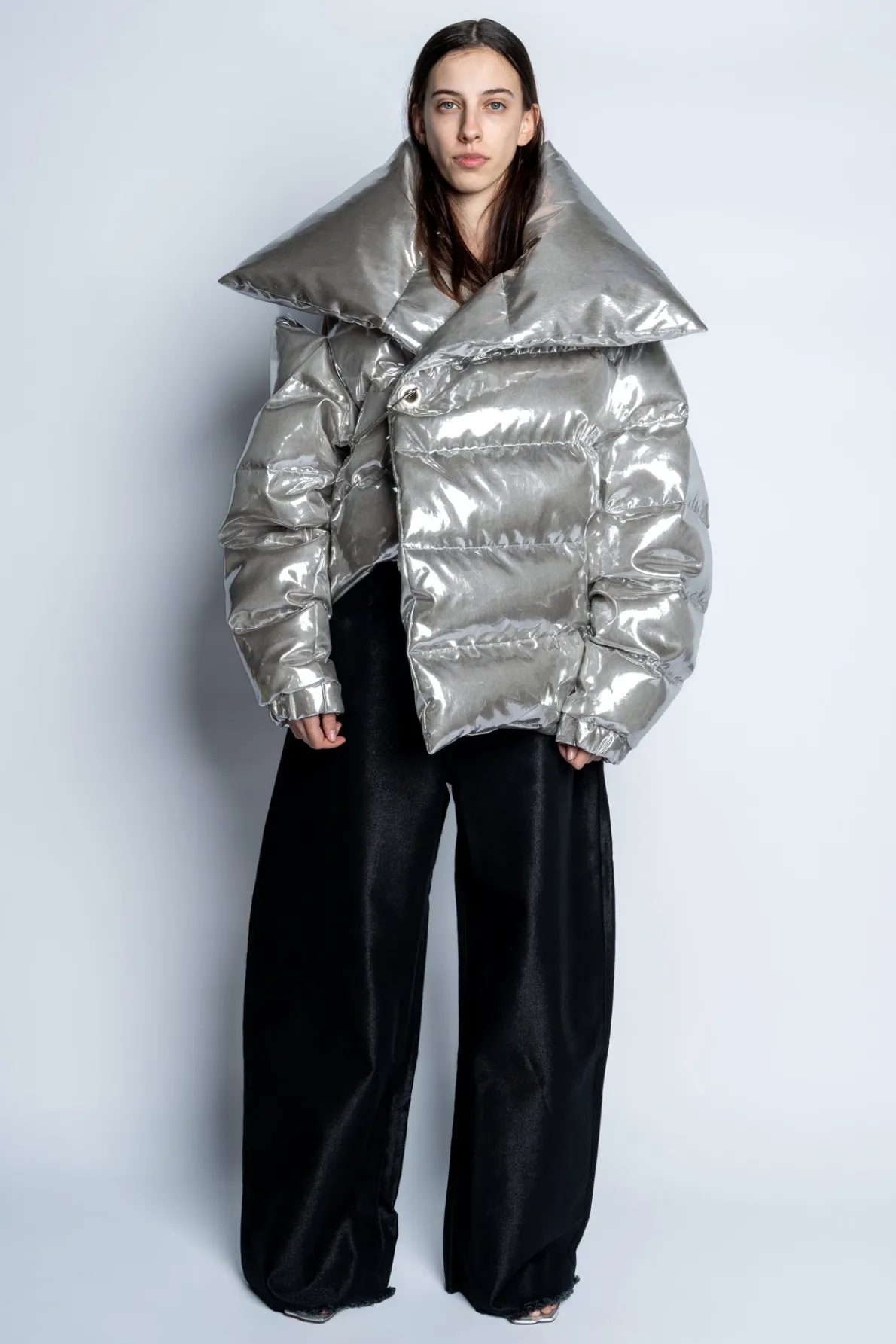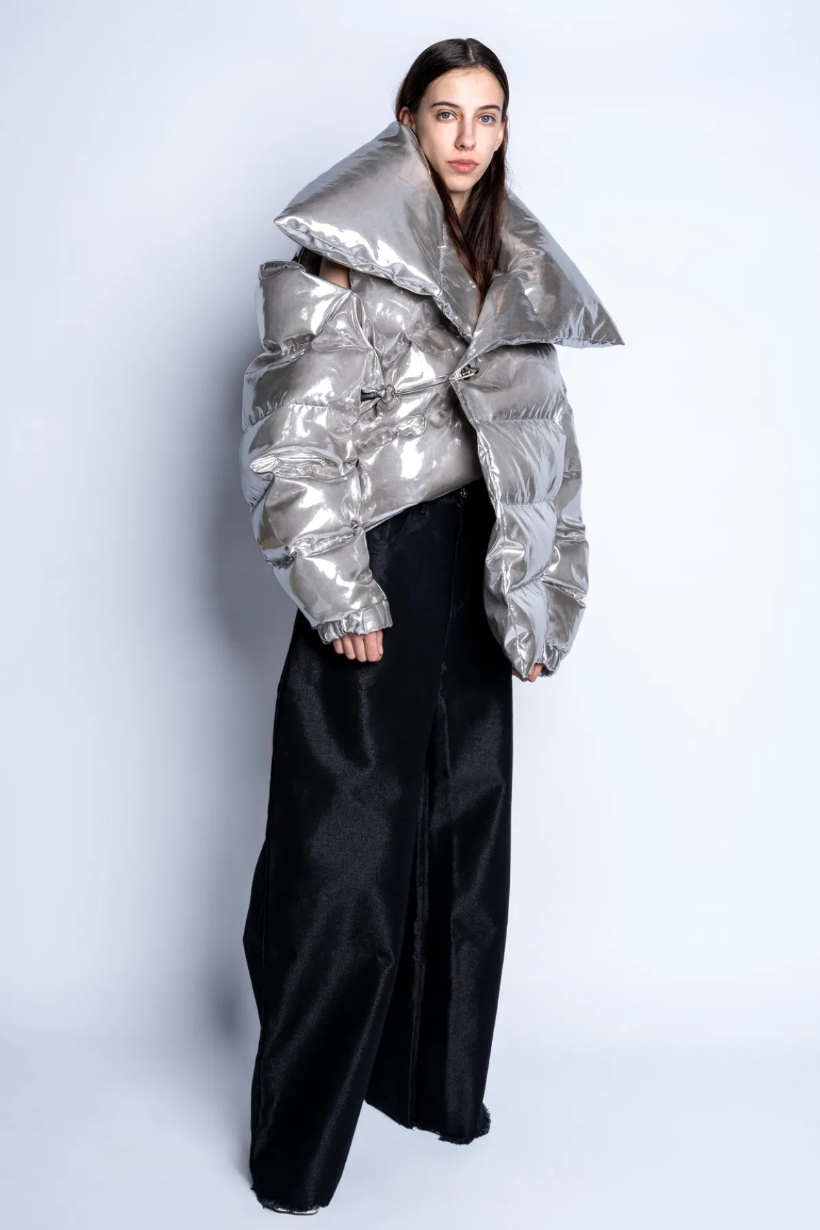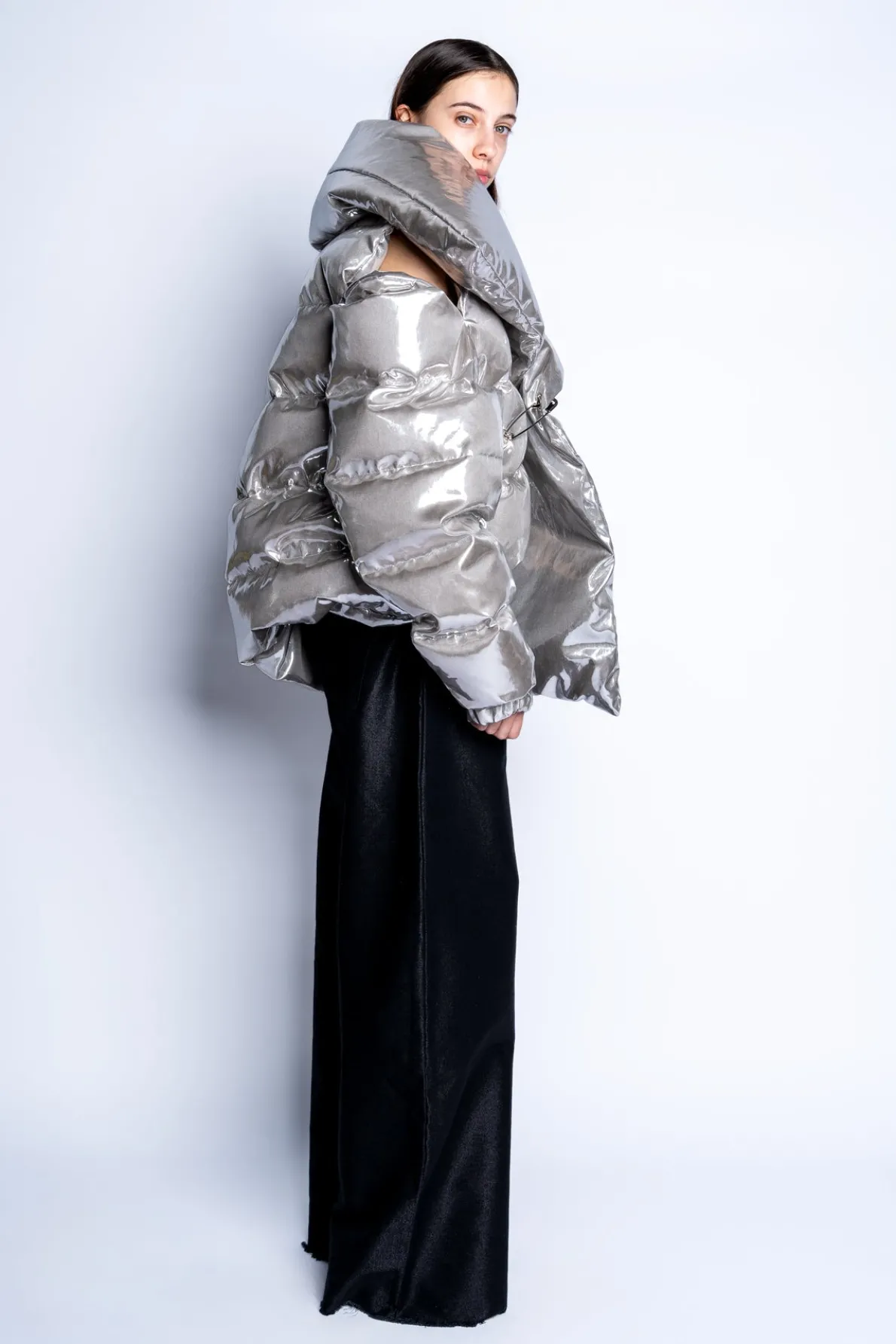 Classic M'A PUFFA Jacket in luxurious silver! Flaunt this stylishly-pointed open-collar silhouette, secured by a striking silver safety pin closure. Boasting an asymmetric hem and an eye-catching opening on the left shoulder, this jacket is a must-have in your wardrobe.• Puffa• Asymmetric silhouette• Side shoulder opening• Silver safety pin closure