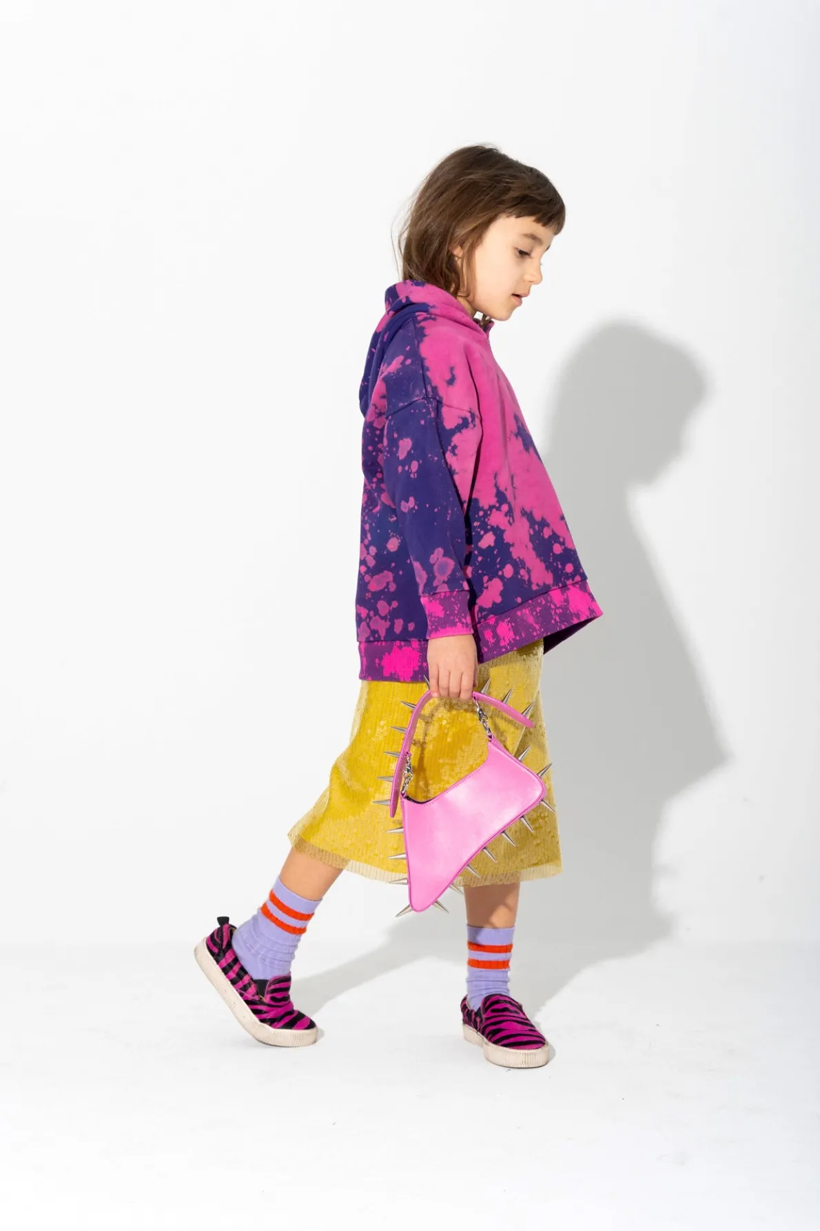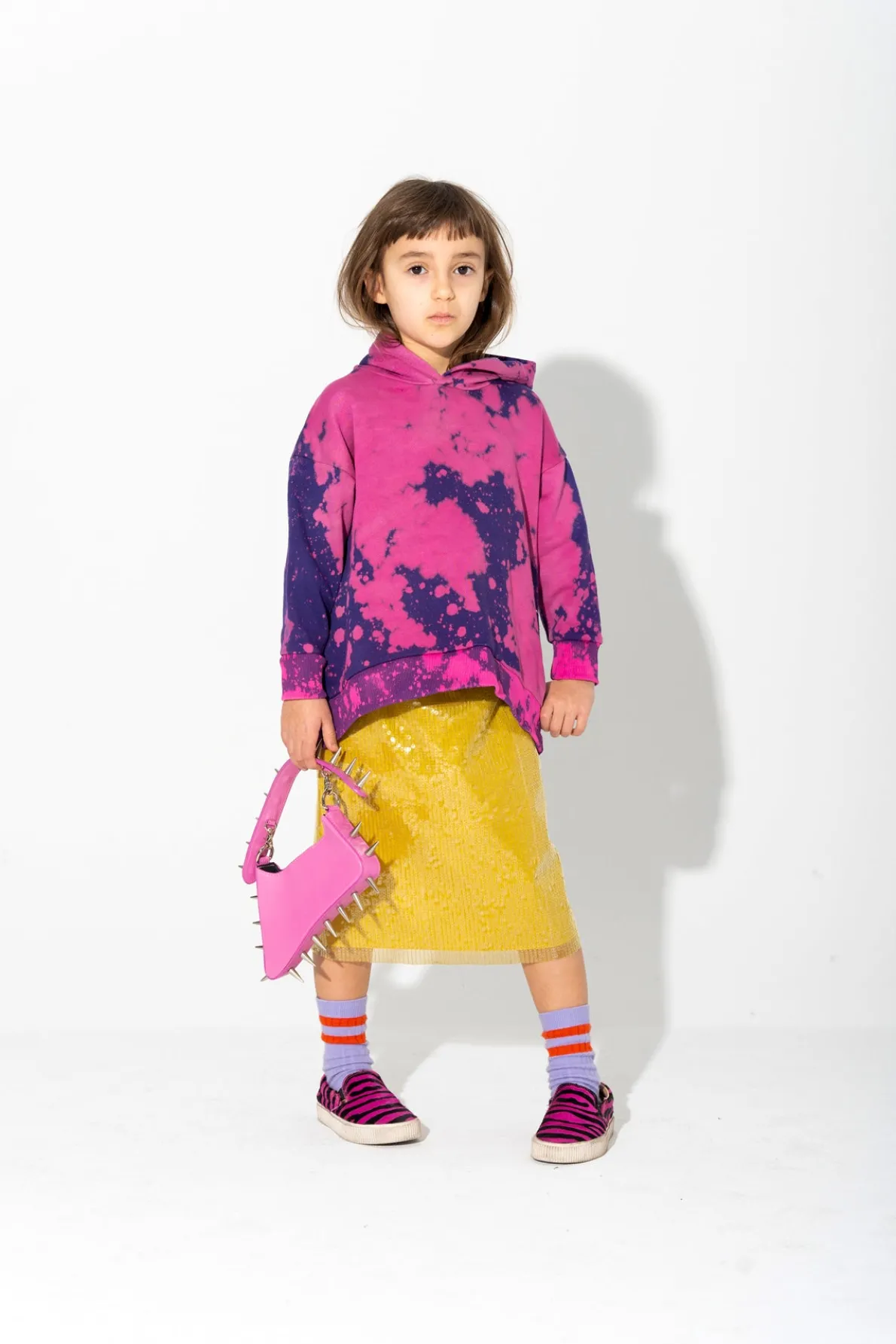 This fun and funky purple and pink fleece hoodie brings the splatter, complete with ribbed cuffs perfect for kids!• Splattered• Purple and Pink• Long sleeves• Ribbed cuff