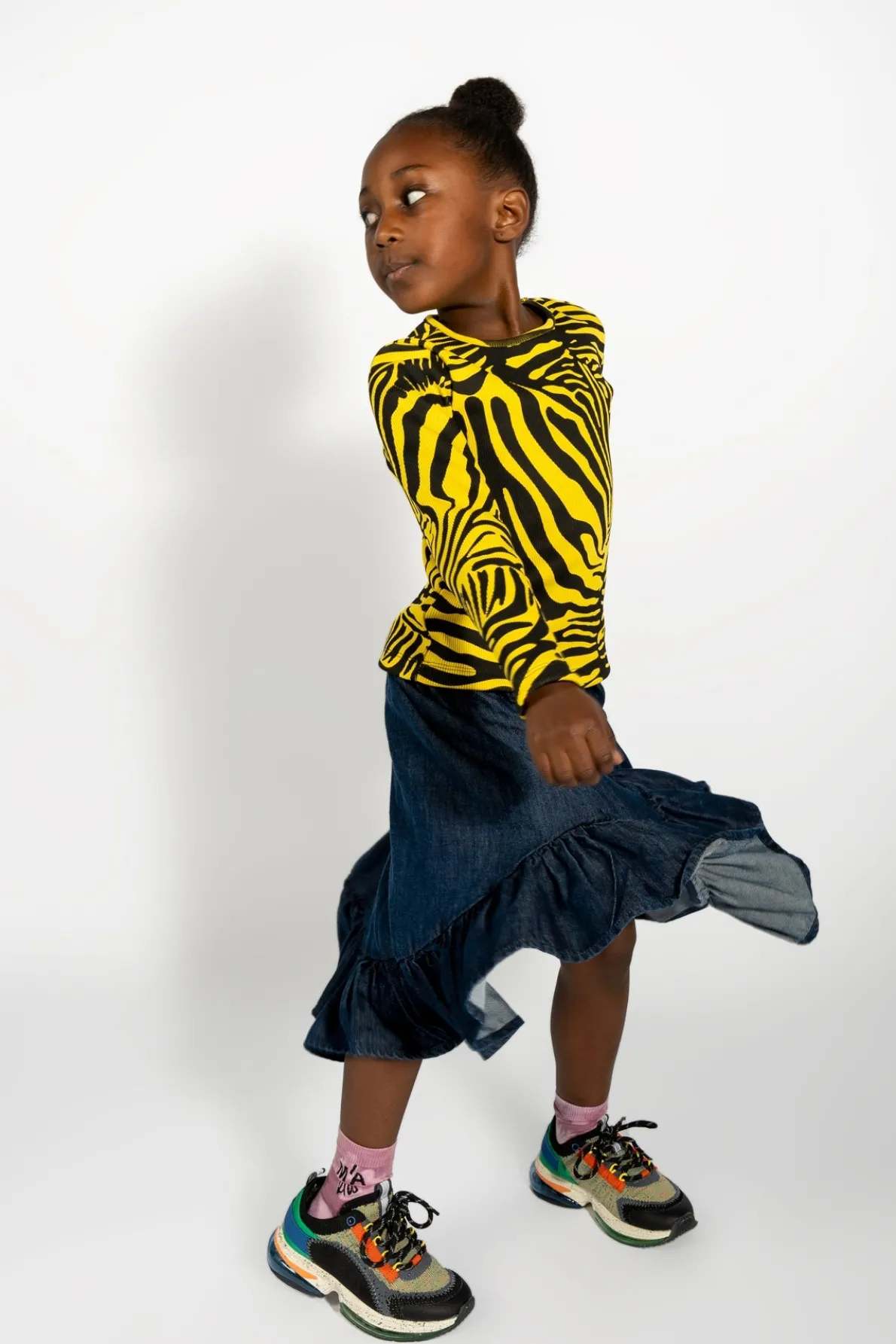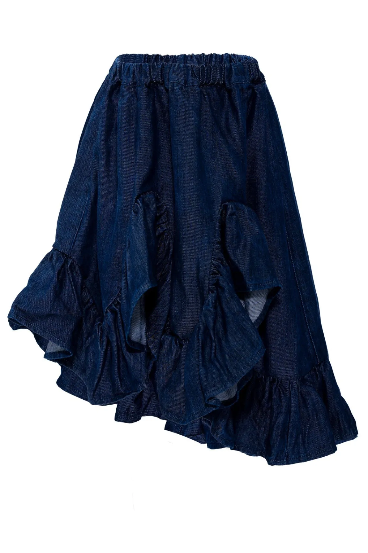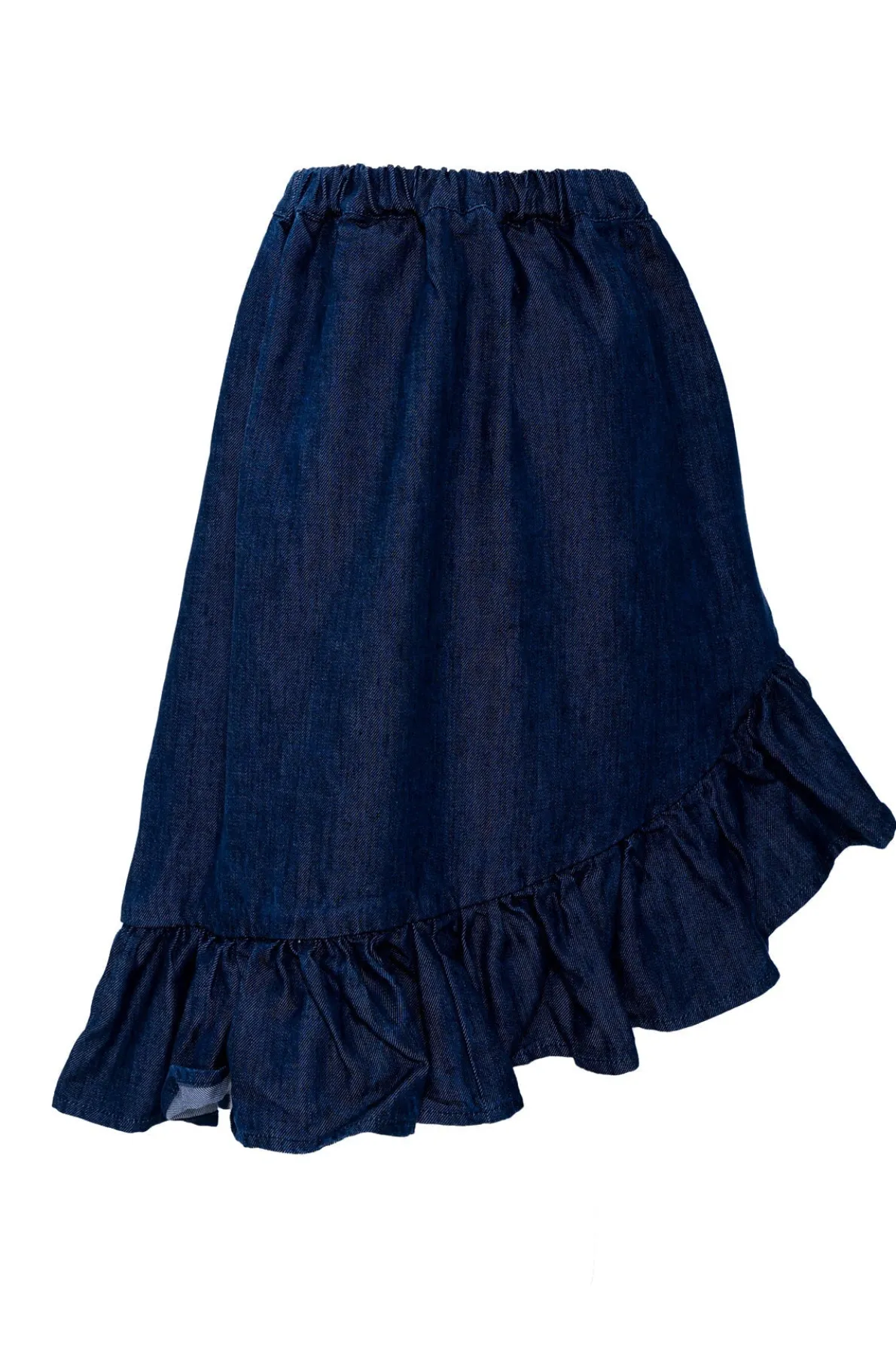 Tencel midi skirt sports an asymmetrical ruffled hemline and elastic waist – ready for your kid's fun fashion adventures!• Mid-length• Asymmetric • Ruffled hem• Elastic waist