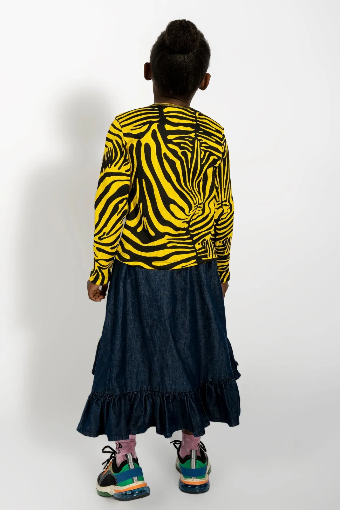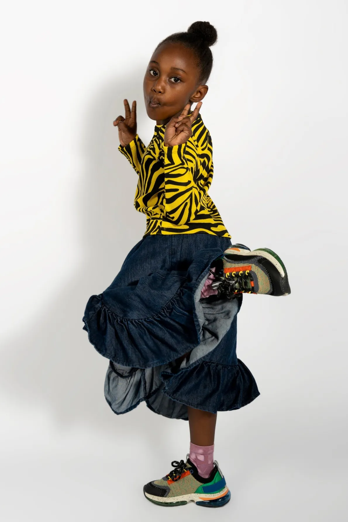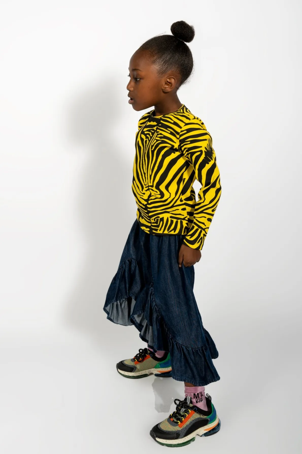 Tencel midi skirt sports an asymmetrical ruffled hemline and elastic waist – ready for your kid's fun fashion adventures!• Mid-length• Asymmetric • Ruffled hem• Elastic waist