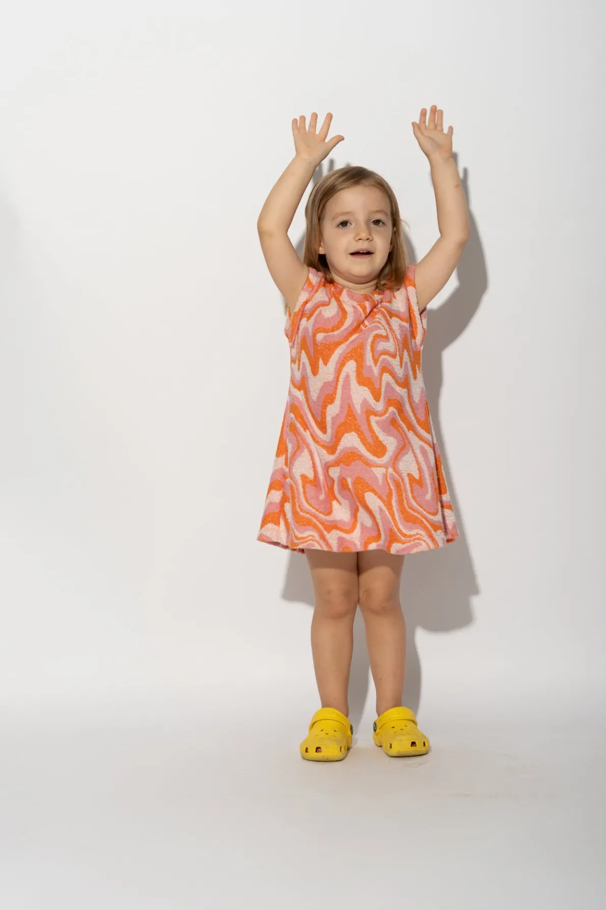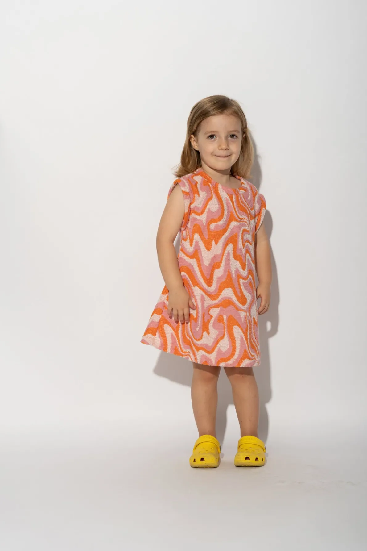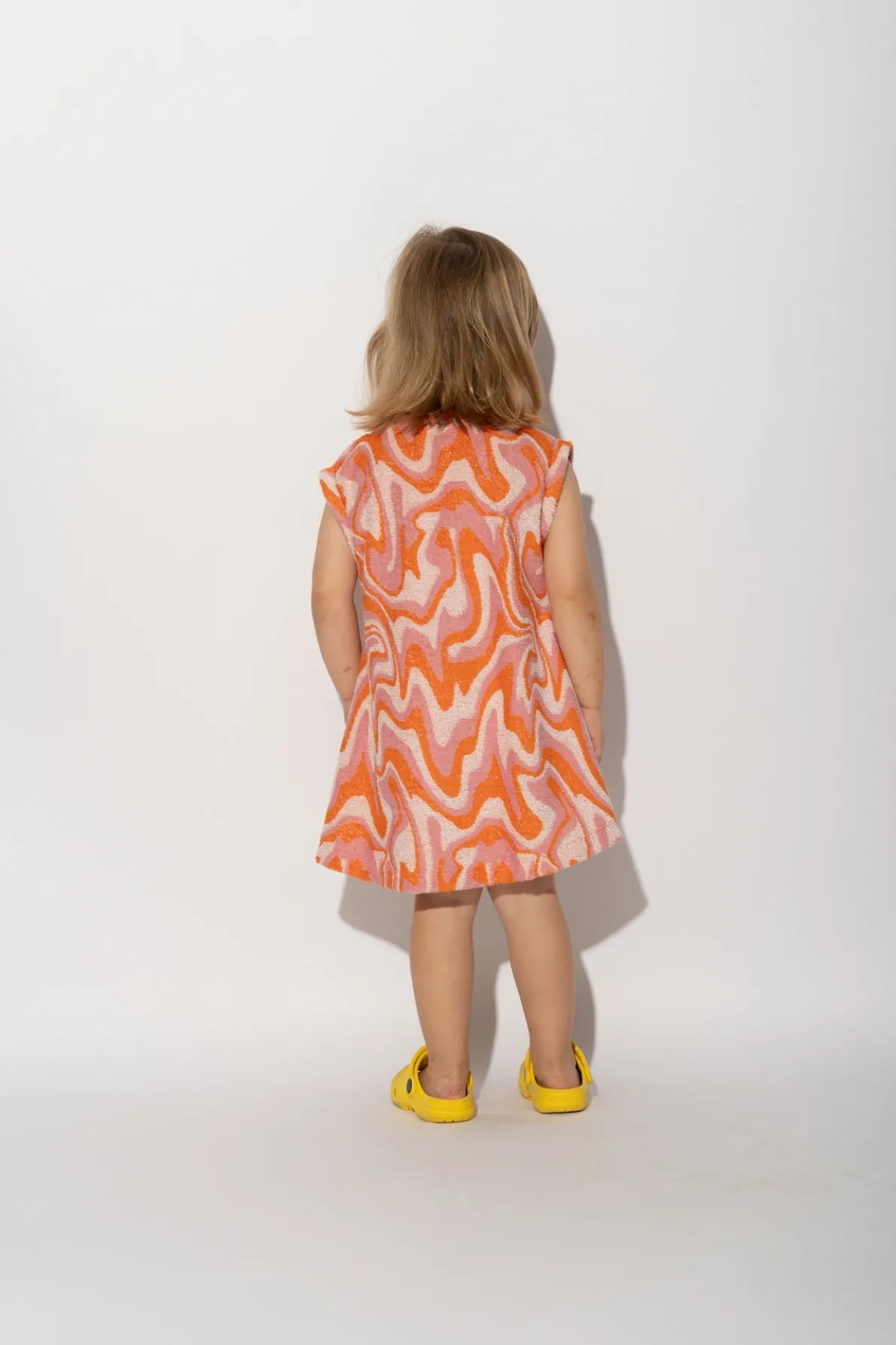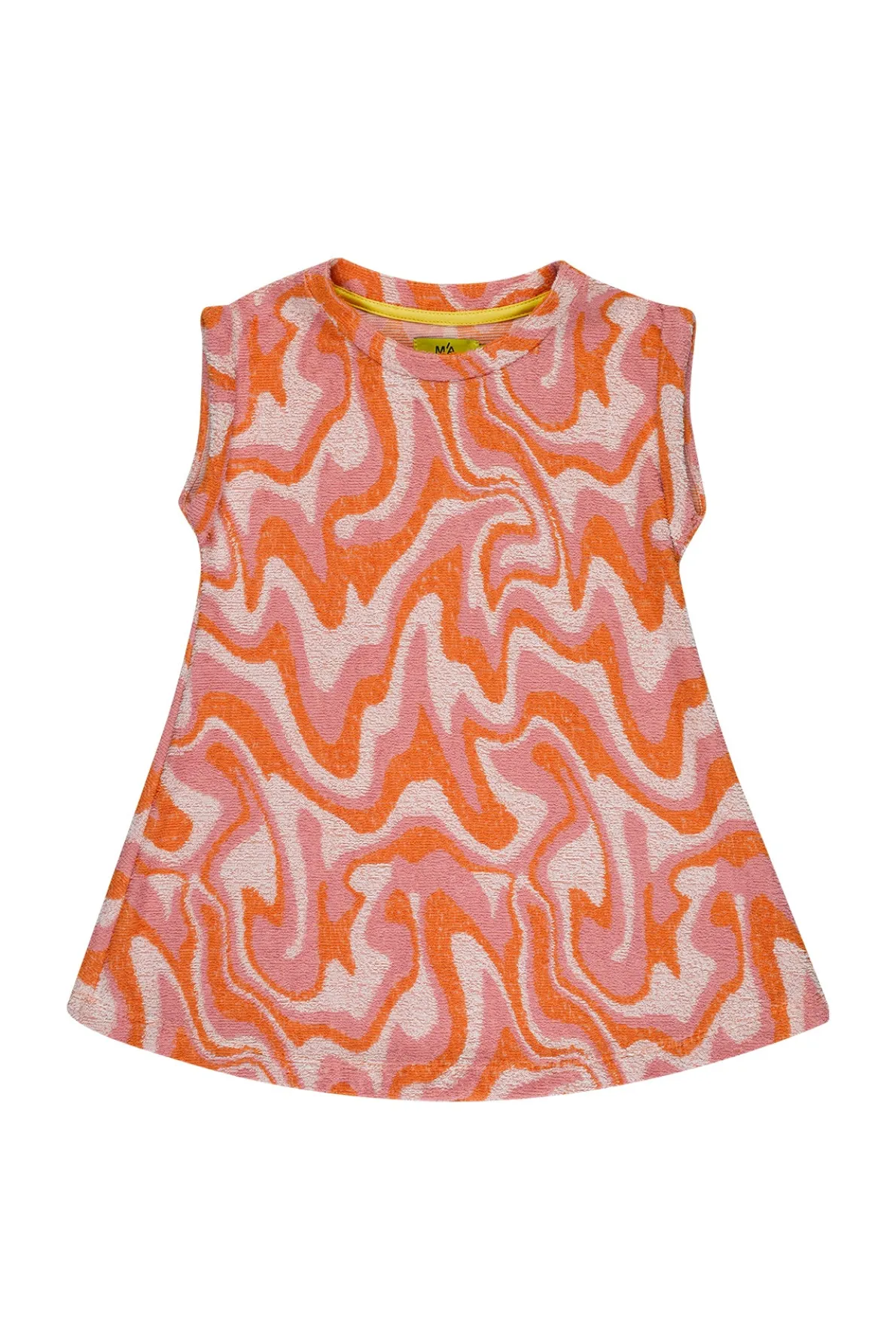 This dress is a wave of fun (literally)! Perfect for kids on the go, this t-shirt dress has a playful wavy print that'll make you stand out. Plus, no worries about getting hot and bothered, since it's sleeveless and short length. • Terry wavy print• Sleeveless• Round neck• Short length