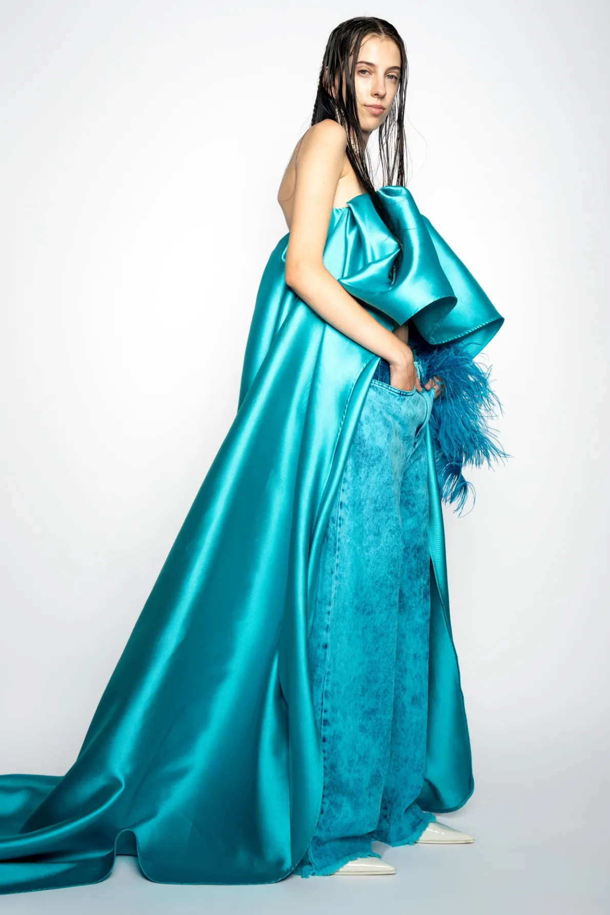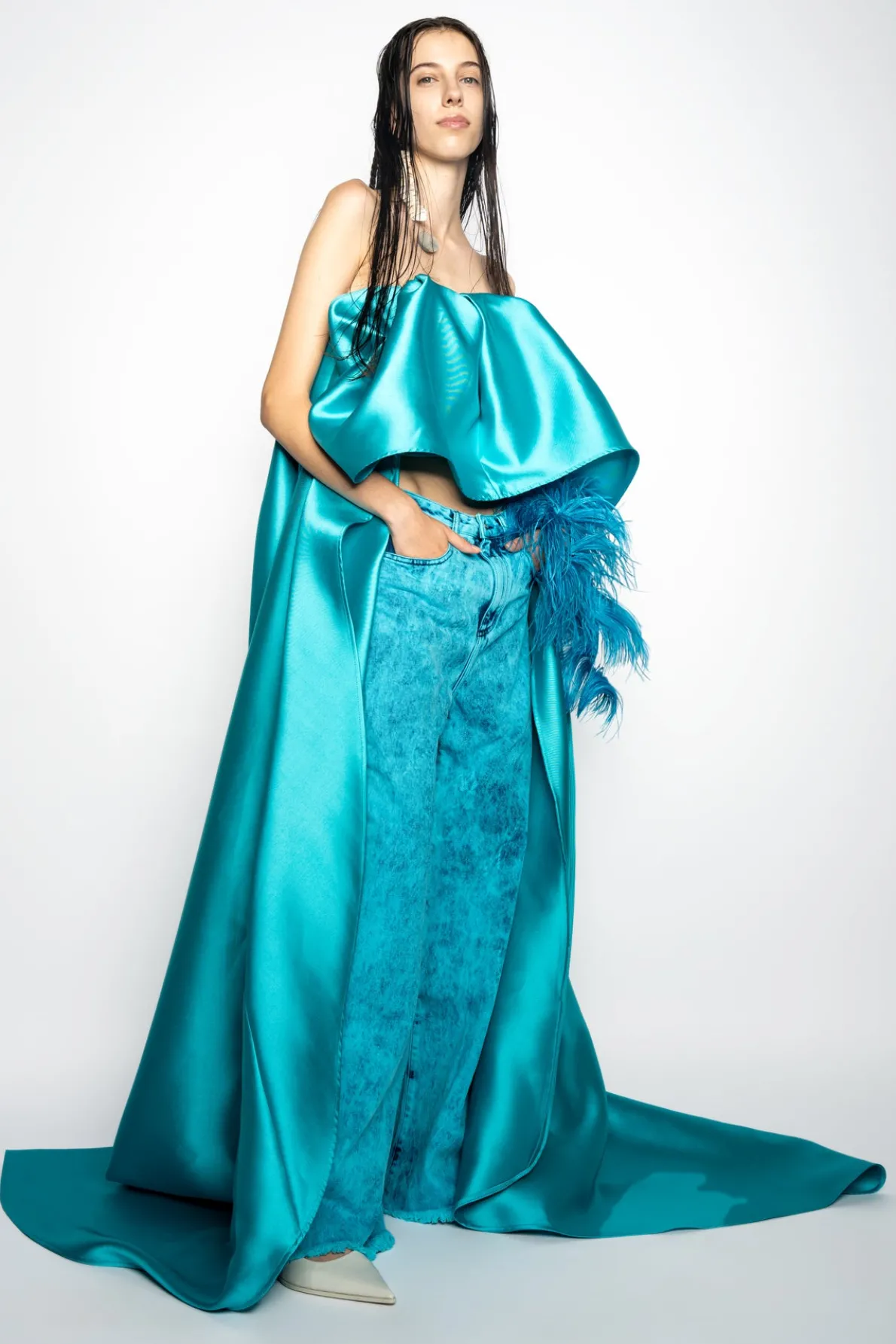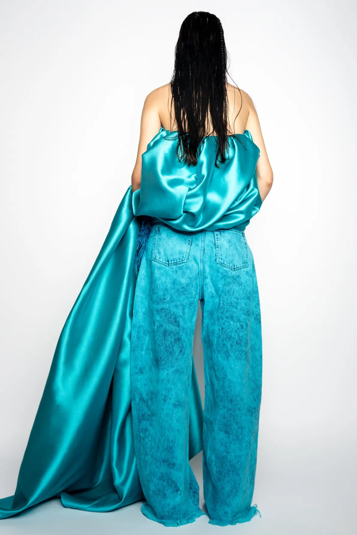 Description: Classic M'A 5-pocket boyfriends in vibrant turquoise overdyed denim. These wide-leg jeans provide a relaxed, dropped-waist fit with an irresistibly raw hem.• Overdye• Oversized• Drop waist• Five pockets Fabric: Denim 62% Cotton 38%Pre-Consumer Recycled Cotton size and fit: Oversized Beatriz is 5ft8