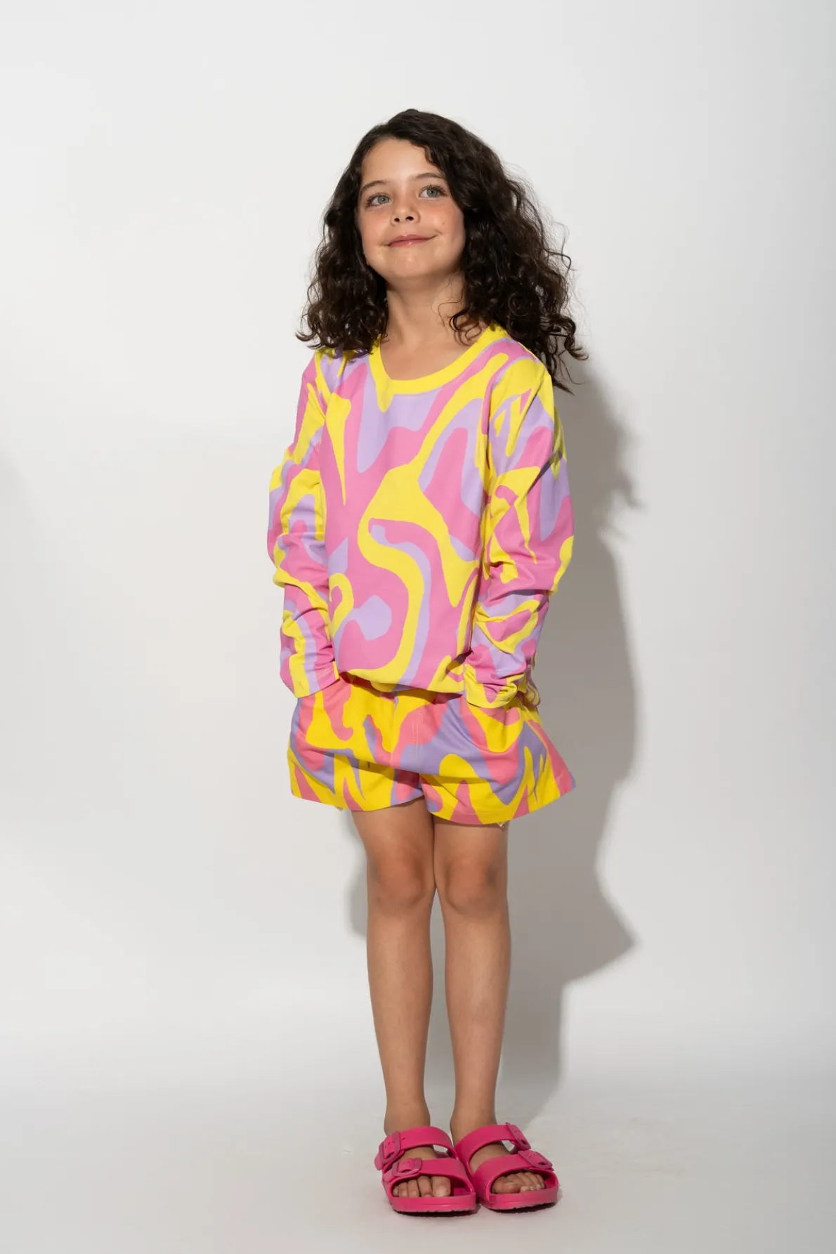 Get ready to groove in our Short Shorts! These funky bottoms feature a playful elastic waistband that will keep your little one comfortable while they run, jump, and play. Made with lightweight printed drill fabric, they're perfect for all-day wear and will add a pop of colour to any summer outfit. • Wavy print• Yellow, pink and lilac• Short fit• Elastic waistband