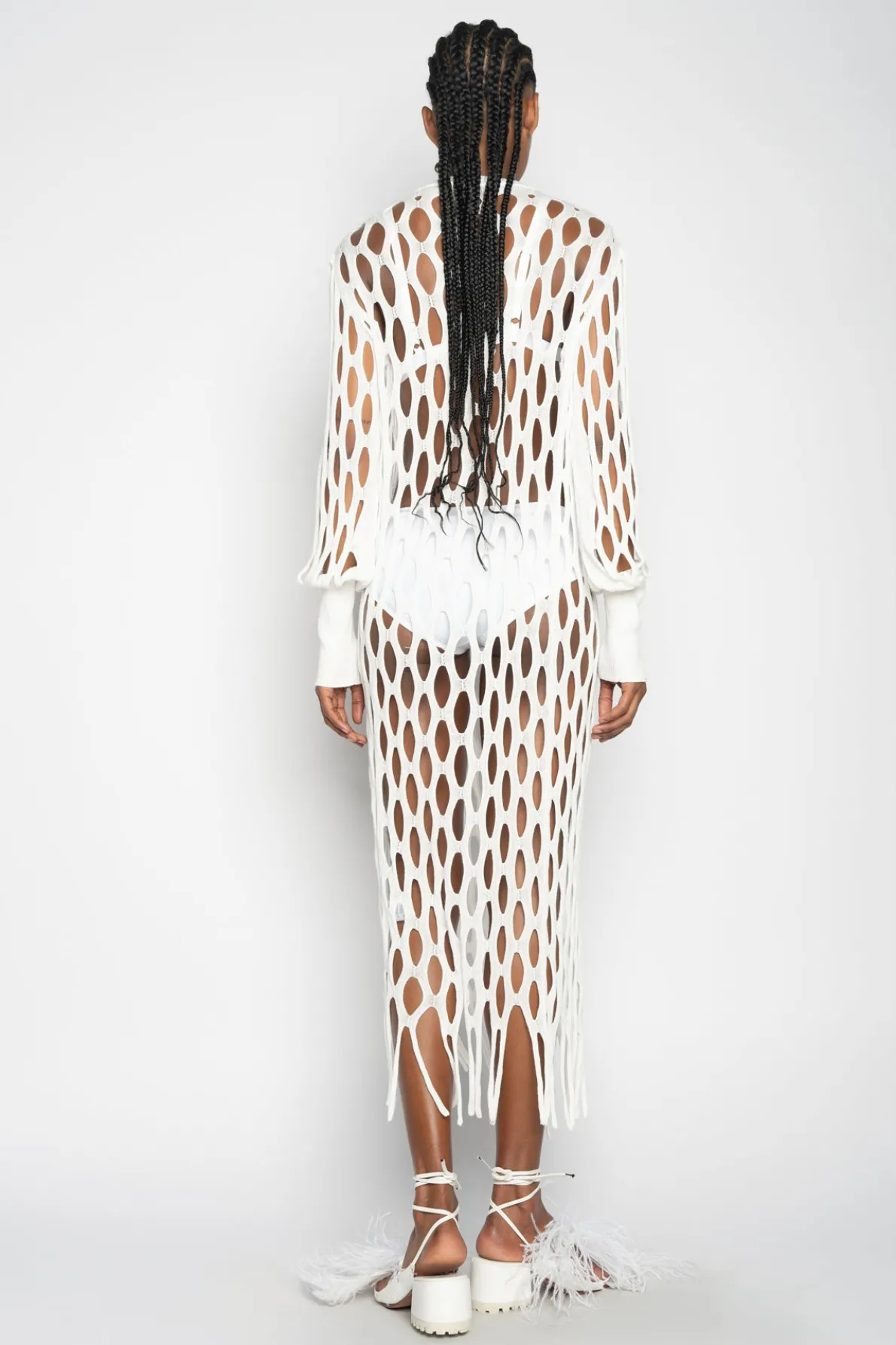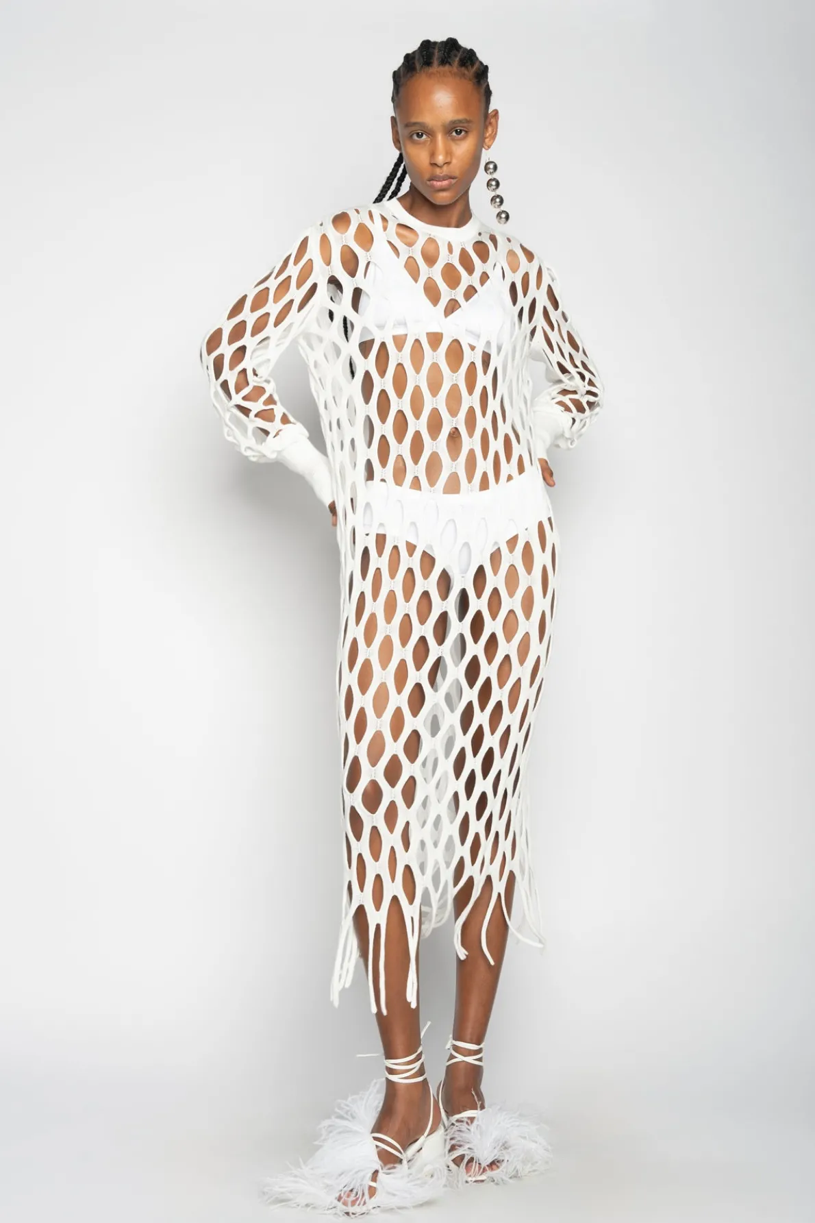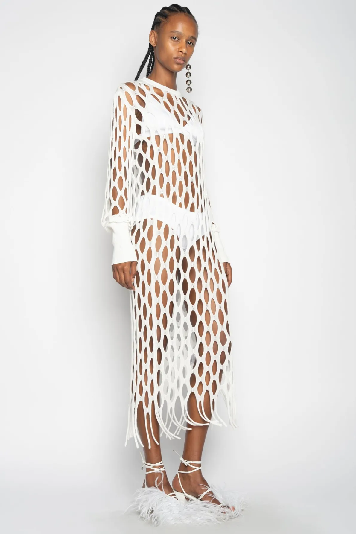 Delight in this ethereal white net dress with ribbed cuffs, a delicately raw hem, and a stunning neckline.• Mid-length• Raw hem• Ribbed cuffs• Long sleeves