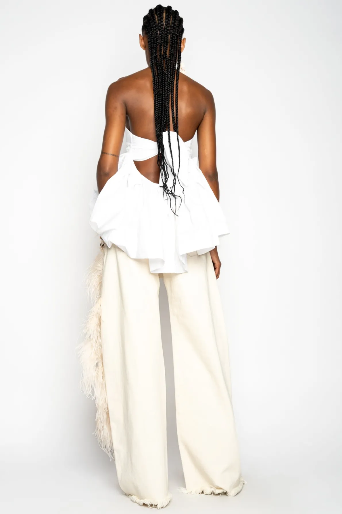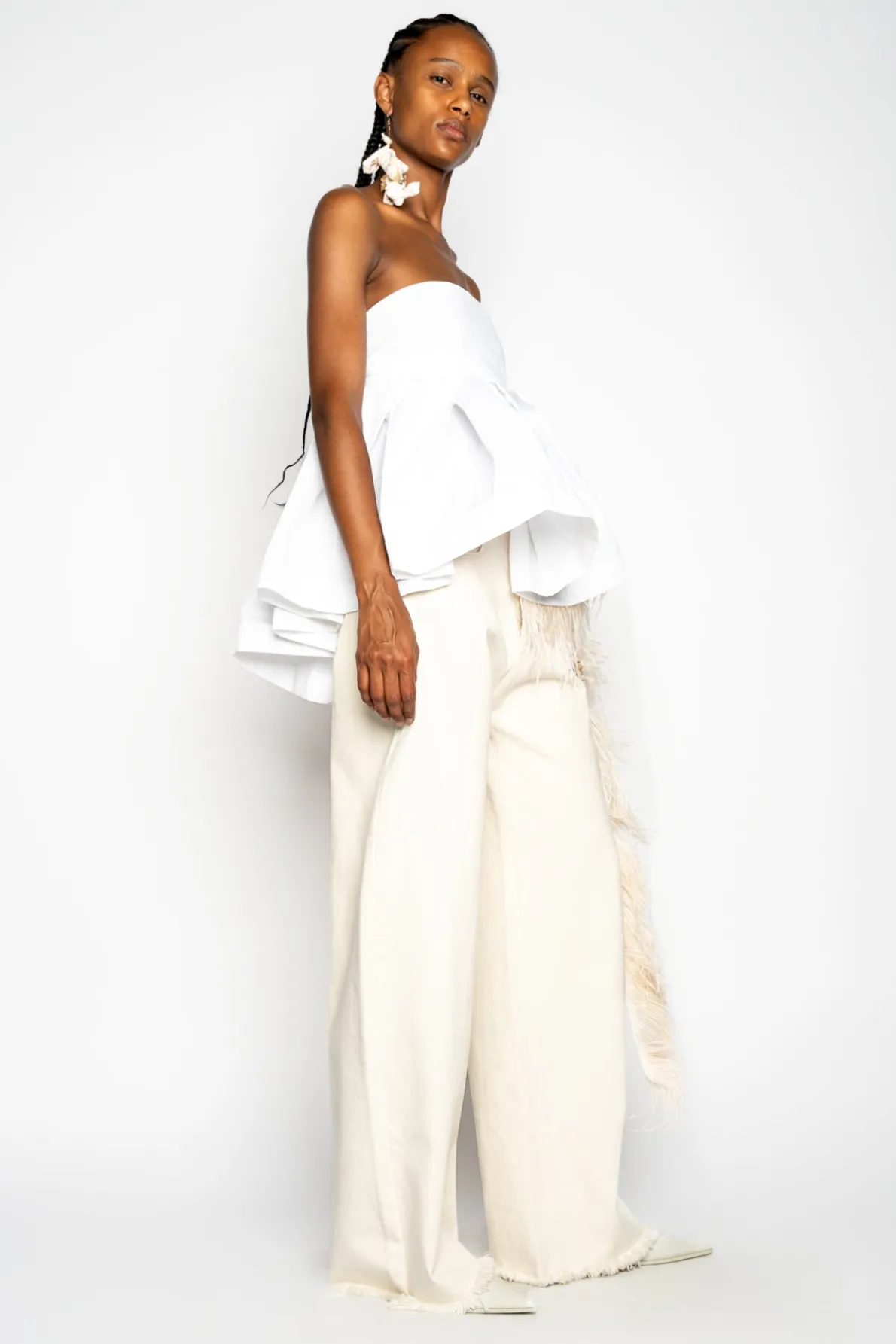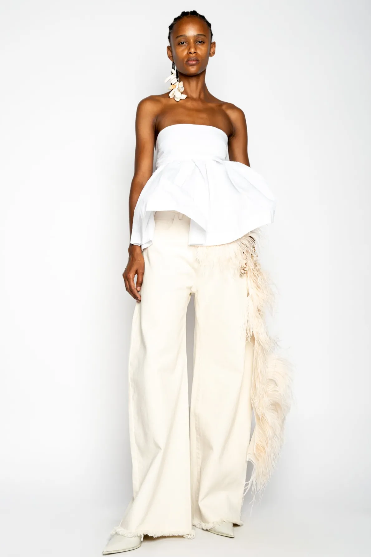 This white, strapless top is crafted from textured cotton fabric and features a delightful peplum hem, complete with a back tie knot.• Strapless• Textured cotton• Peplum hem• White