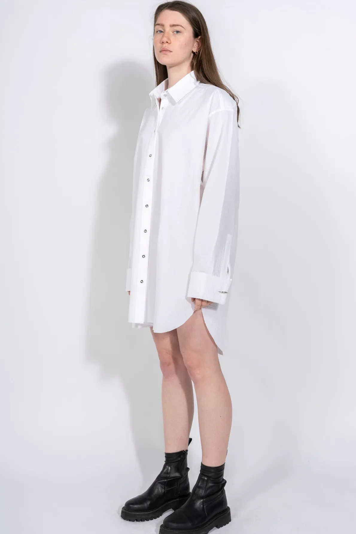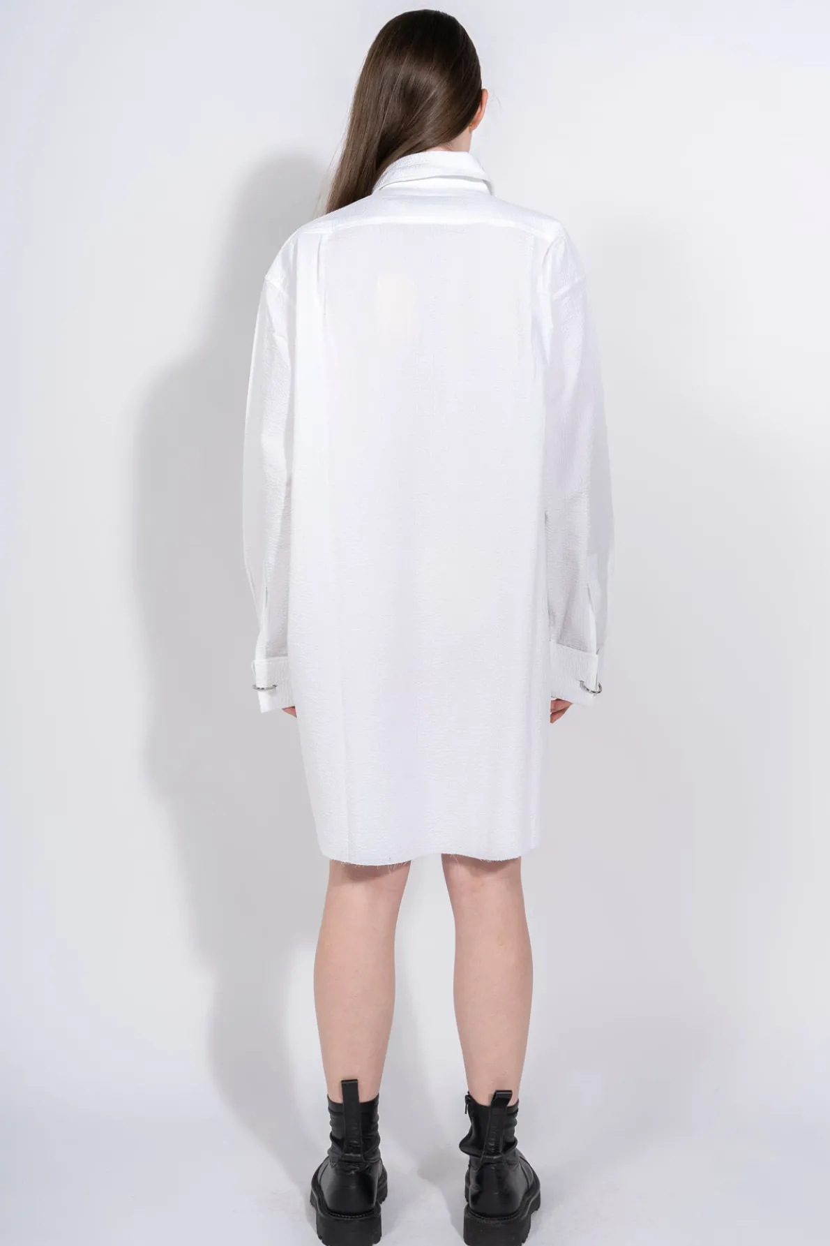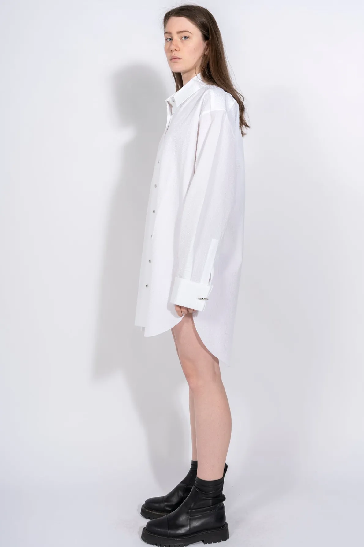 Description: Classic M'A XXL long-sleeve button-up shirt in white textured cotton with a high neck collar, fold-up cuffs with metal rings and unfinished asymmetrical hem. Fabric: TEXTURED SHIRTING 100% COTTON Made of natural fibers. size and fit: OVERSIZED Yana is 5ft7 / 1.70 cm and is wearing a size Small (UK8)