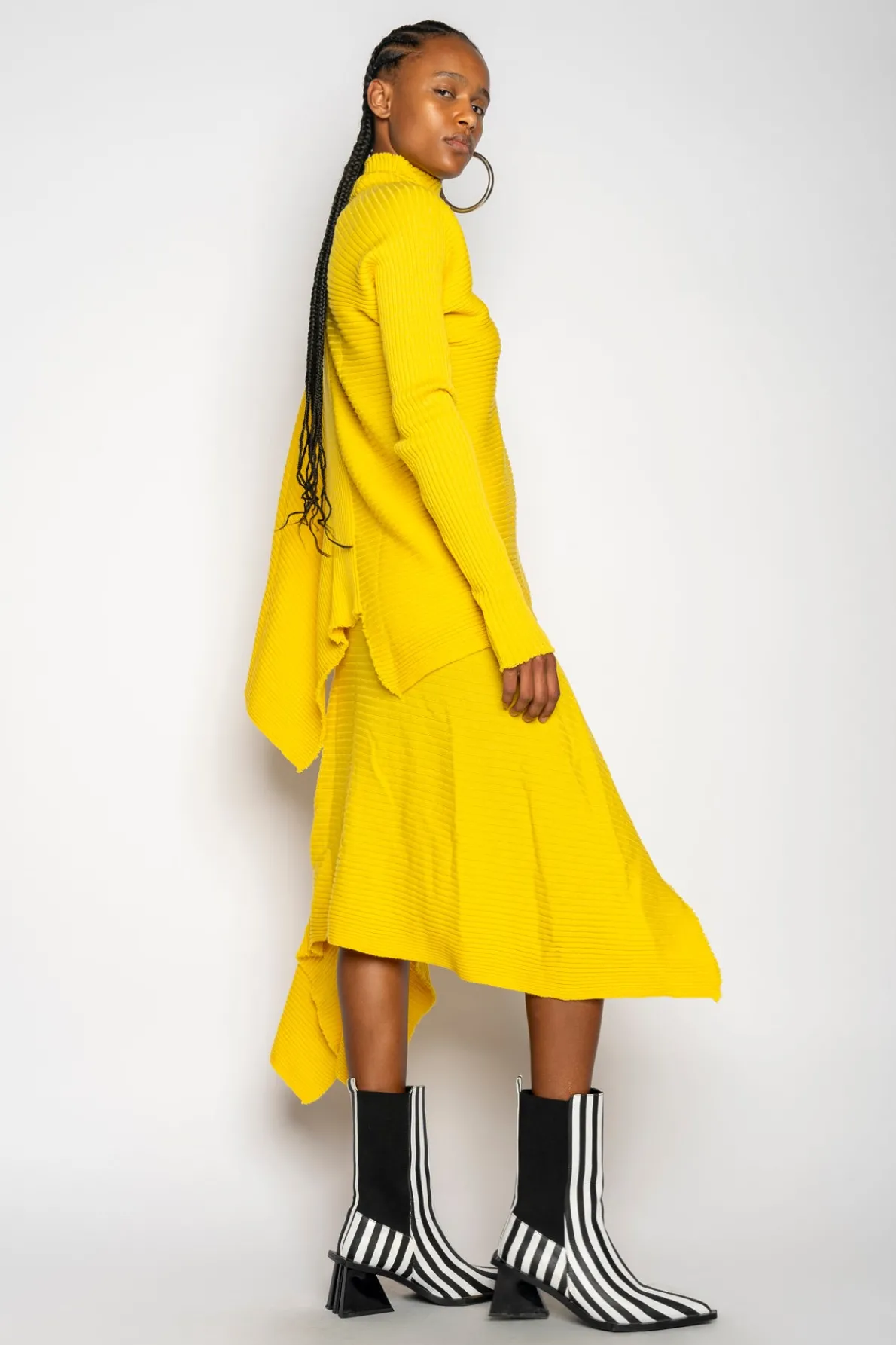 Description: Asymmetric sweater in yellow wool. With a slashed cowl neck, signature M'A raw hemlines and longline sleeves. Fabric: Extrafine Wool / Merino 100% Extrafine Wool / Merino Made of mulesing free wool – animal cruelty free. size and fit: True to size Priscila is 5ft7 / 1.76 cm and is wearing a size Sm