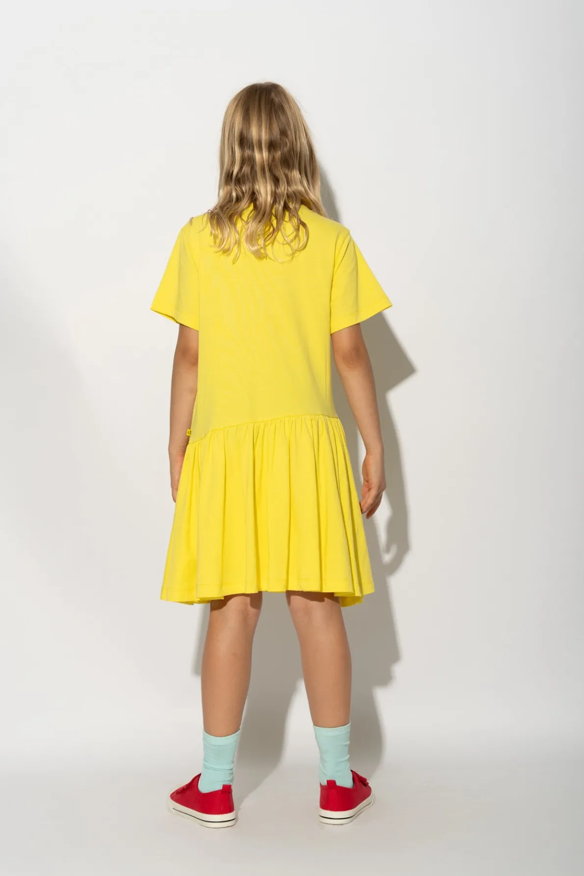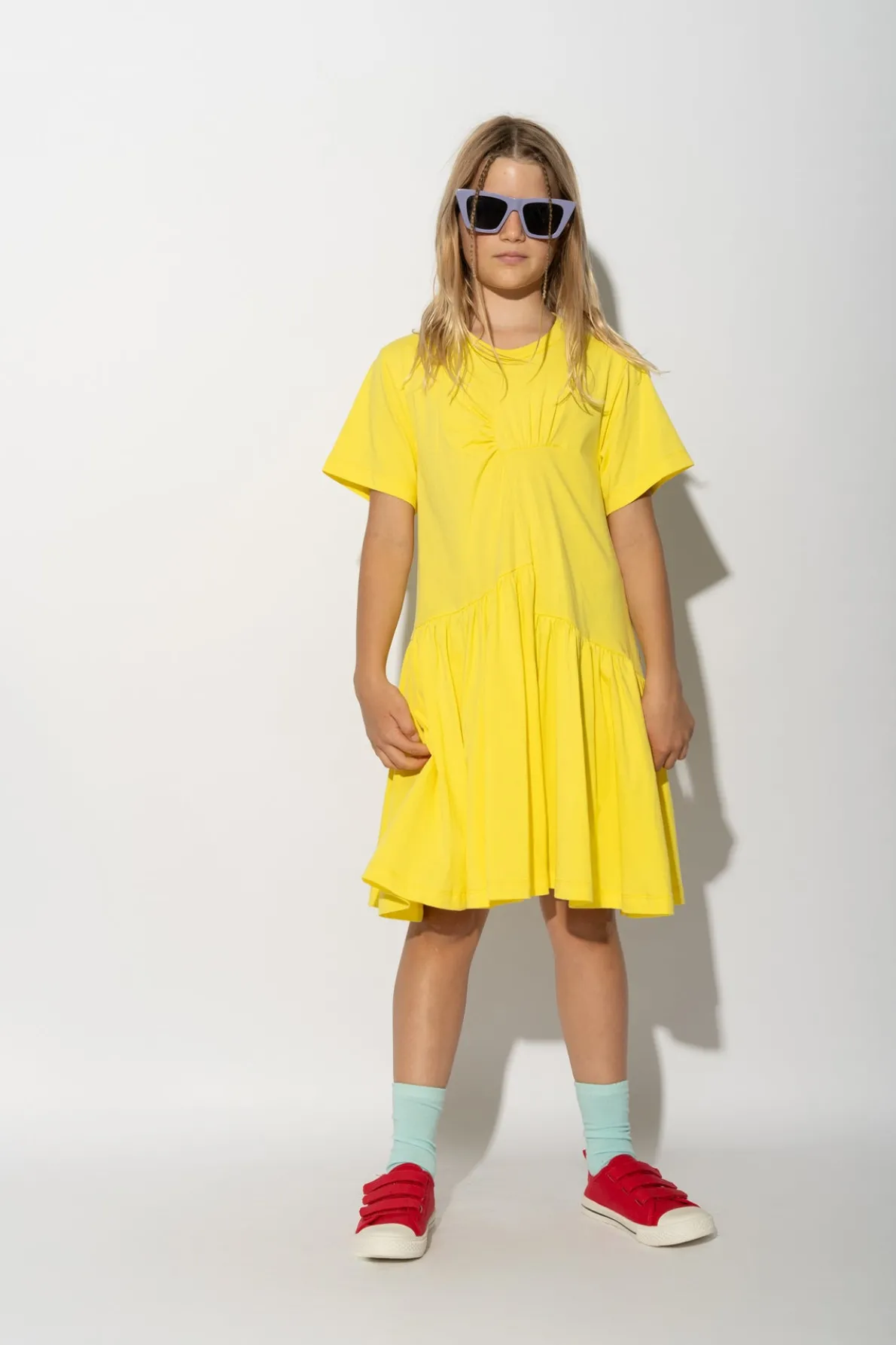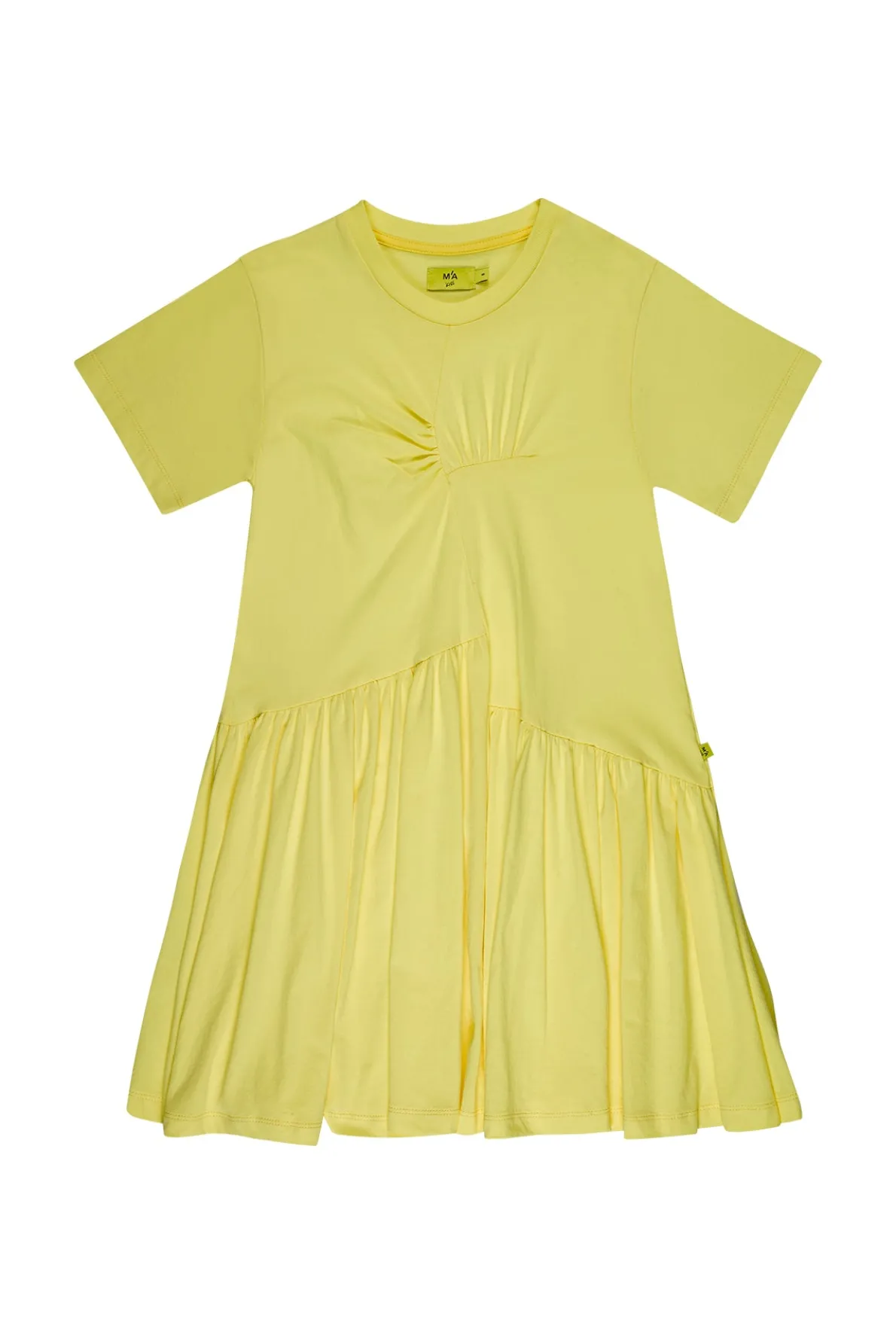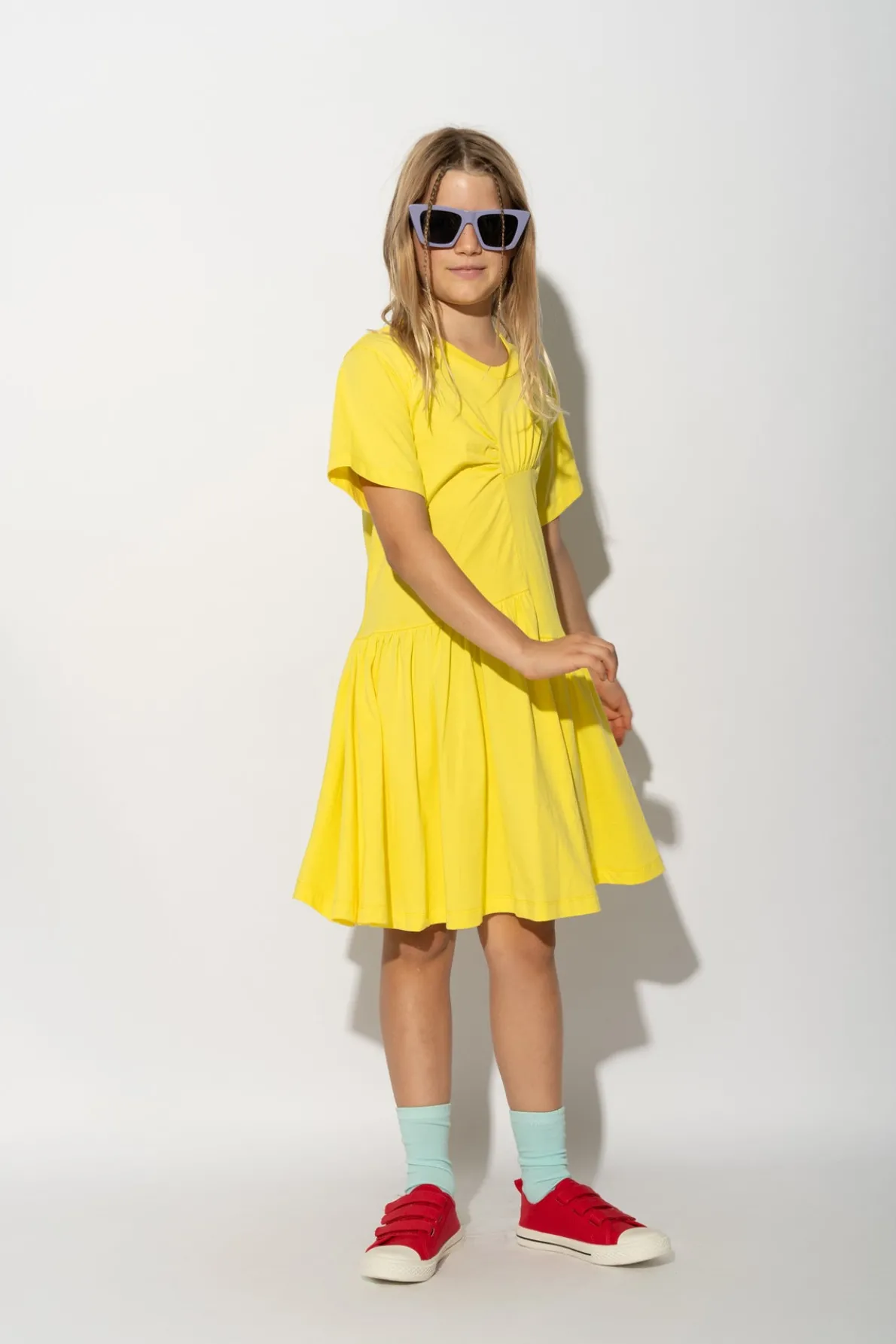 Made of soft, comfortable jersey material in a bright shade of yellow, this dress features short sleeves and a round neck. But what sets this dress apart is the unique gathering in the front, adding a playful touch to any young fashionista's wardrobe.• Yellow• Gathered• Short sleeves• Round neck