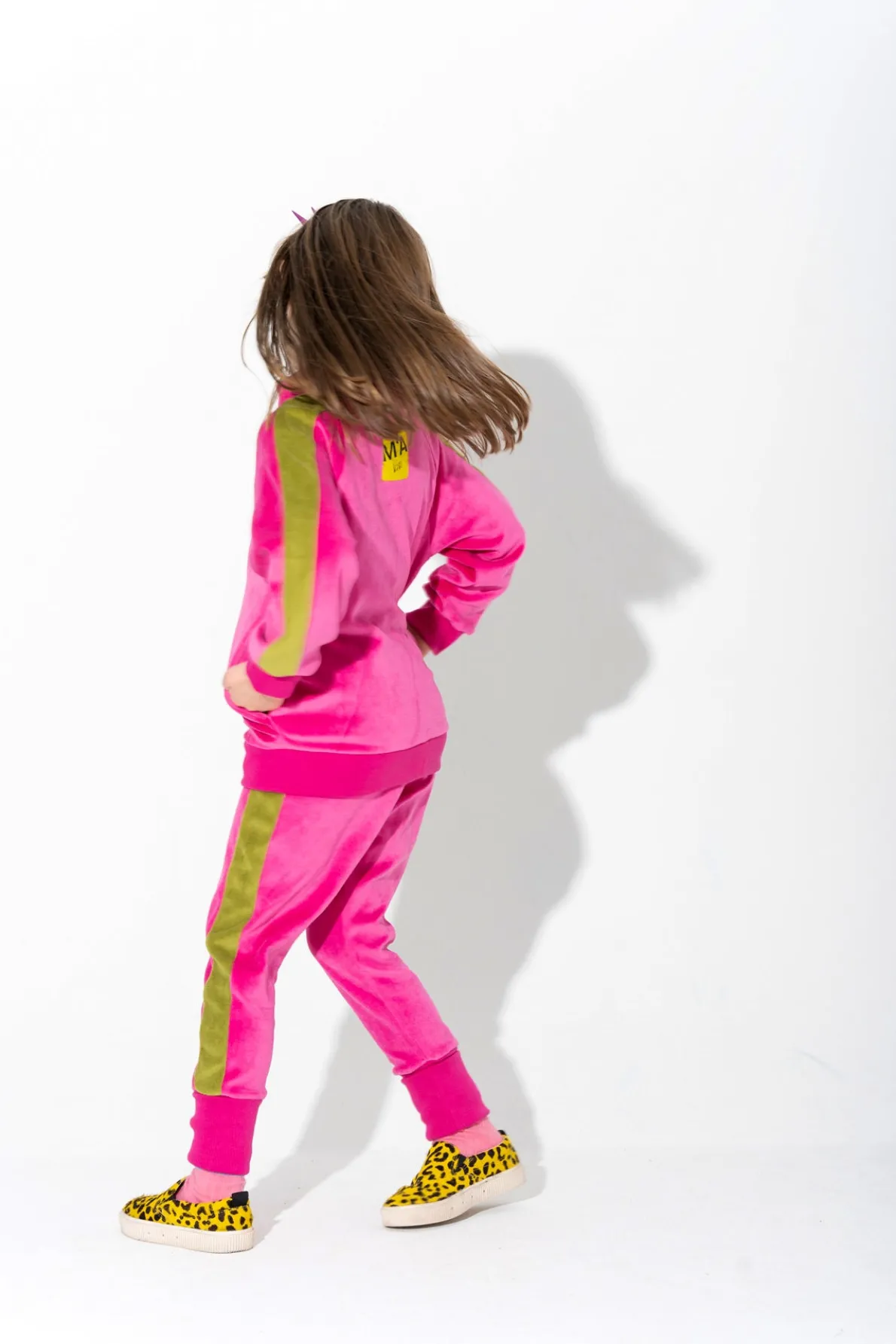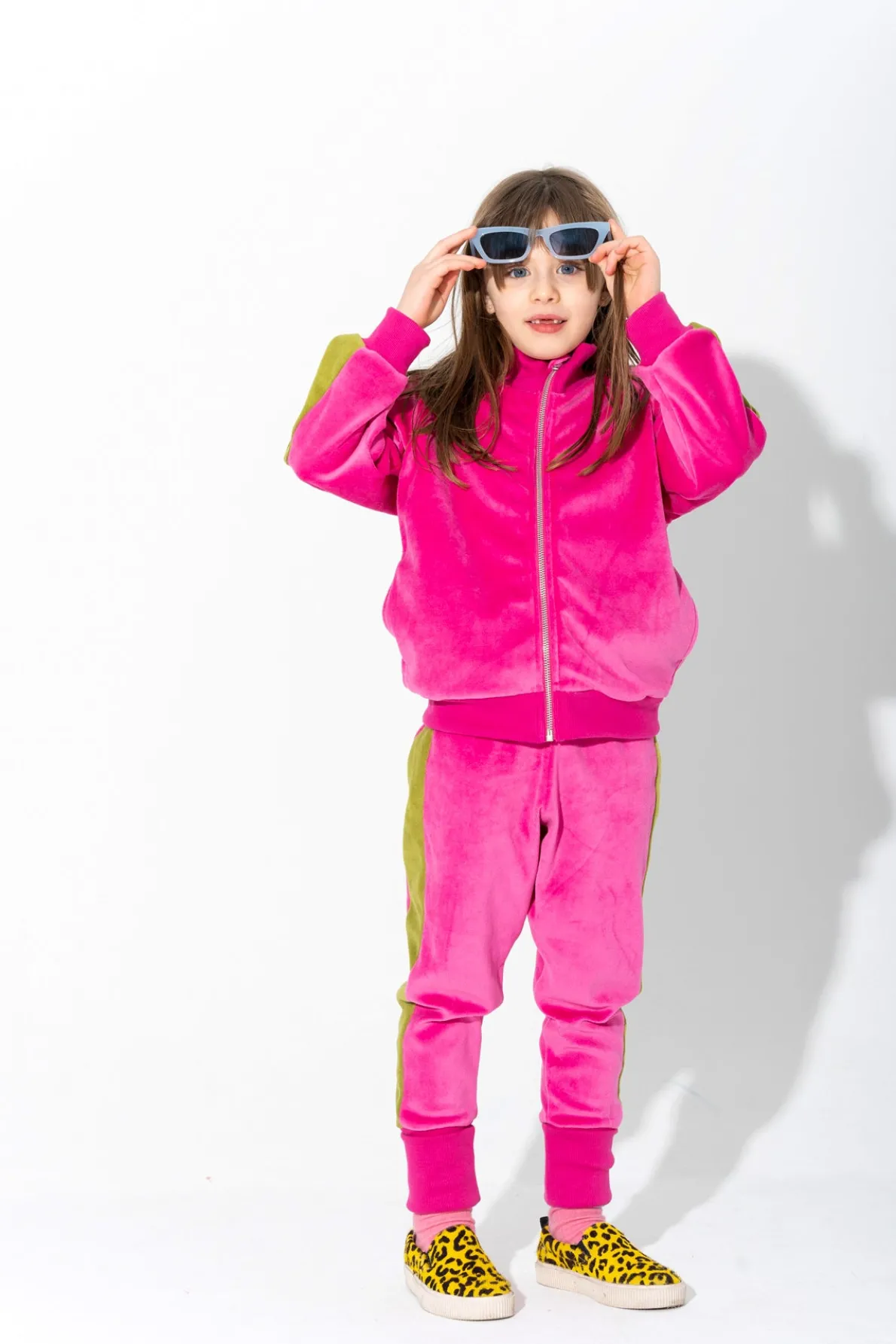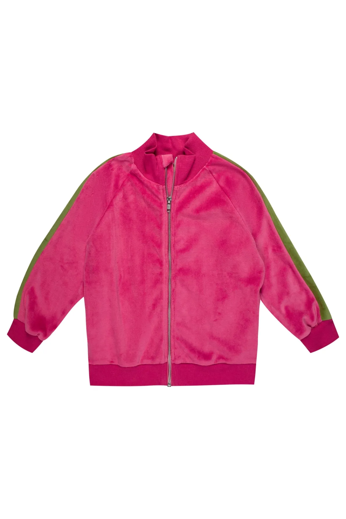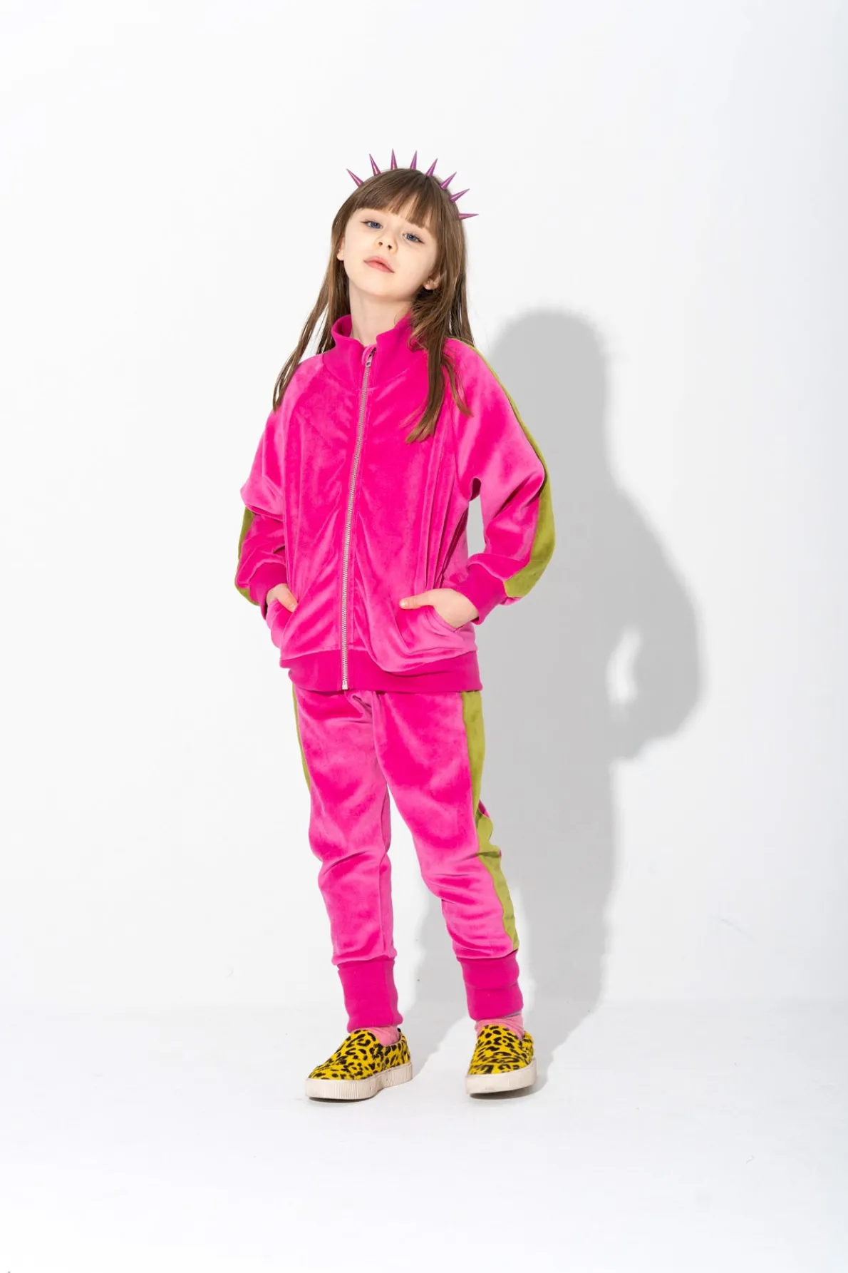 Zip that look up with this bright pink velour jacket, complemented with arm stripes of grassy green contrast tape! (Fun, stylish, and sure to turn heads!).• Pink and green• Front zipper• Cuffs• Side contrast tapes
